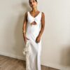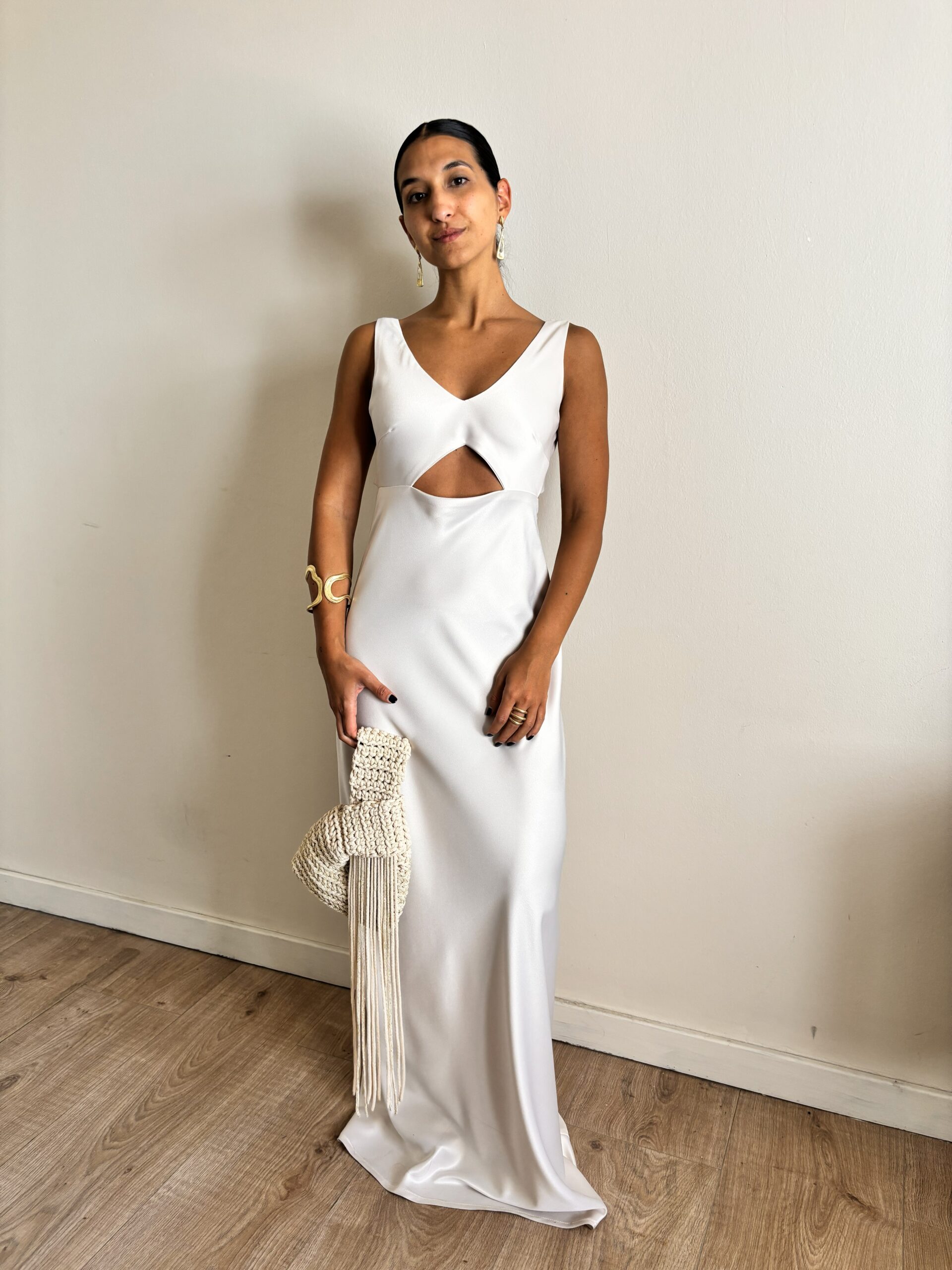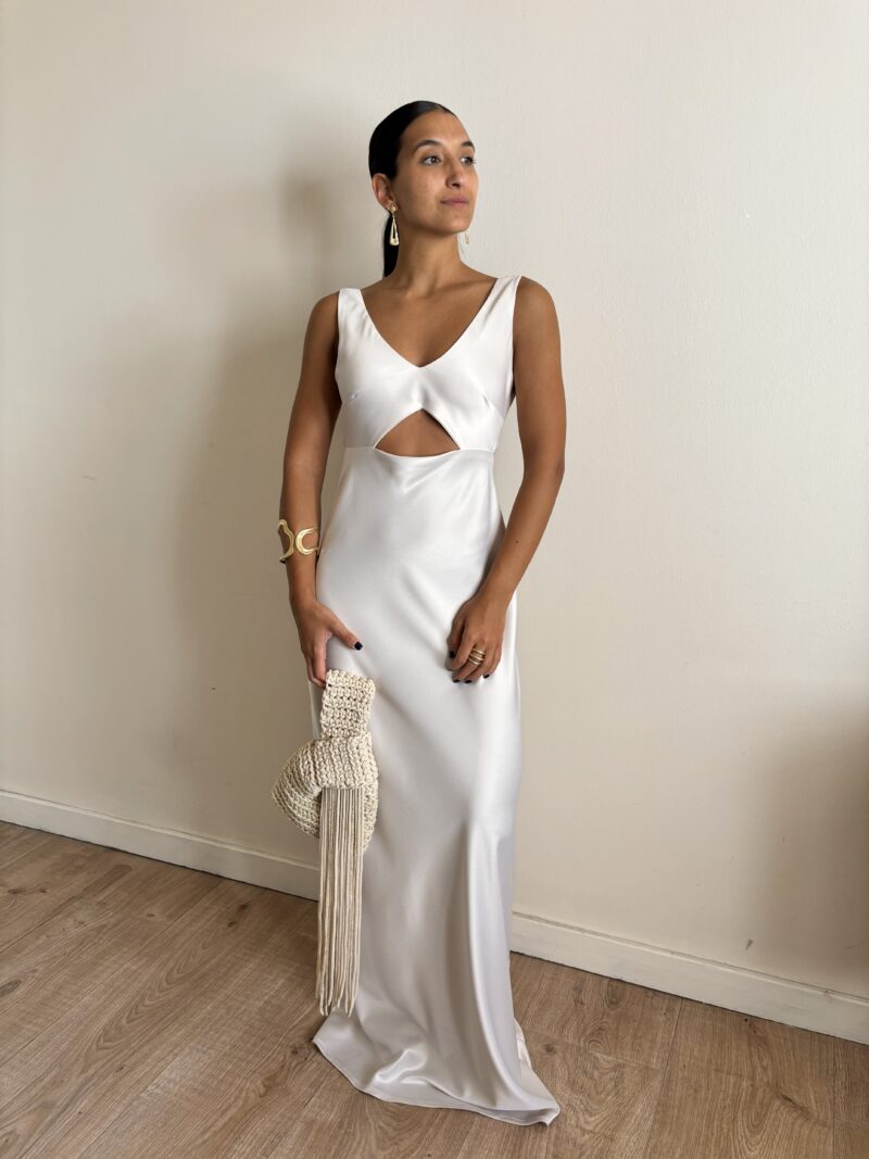 Vestido escote en V, con recorte en forma de triángulo en la parte del ambdomen. Tiene diseño en la espalda y se cierra con botones forrados. Confeccionado en creppe de seda..