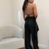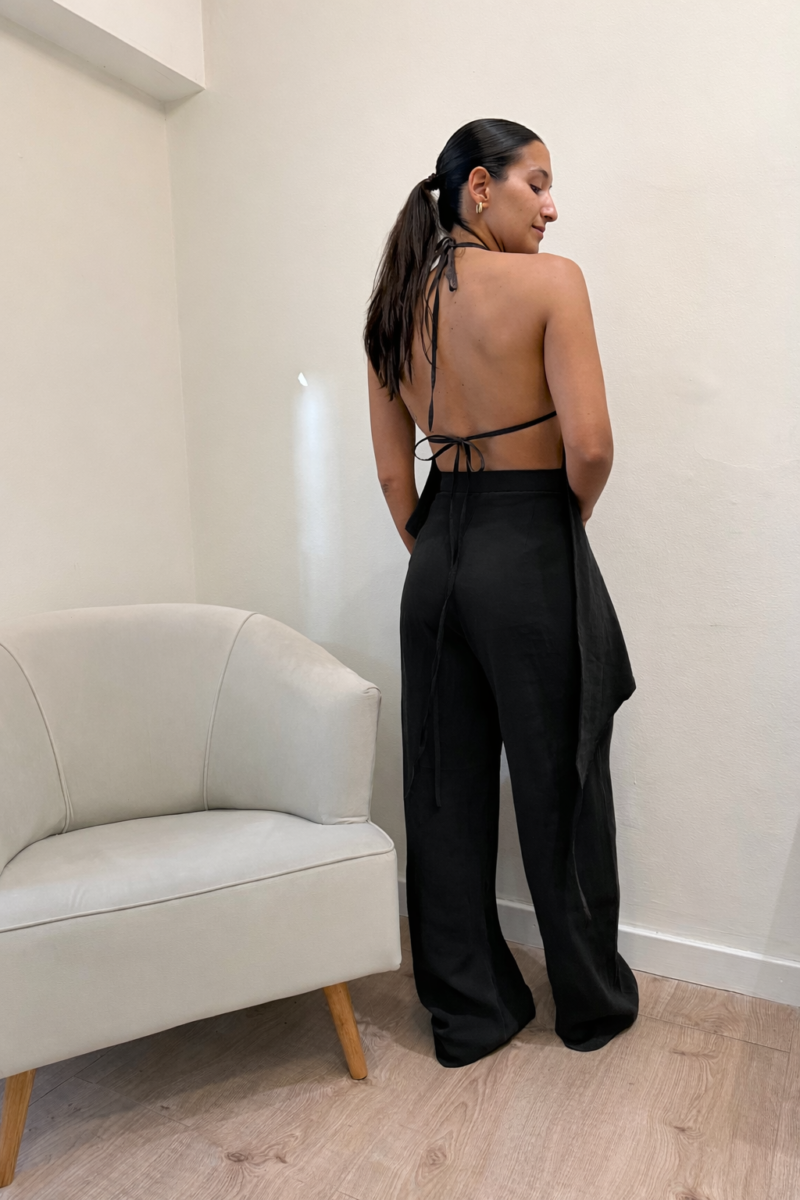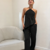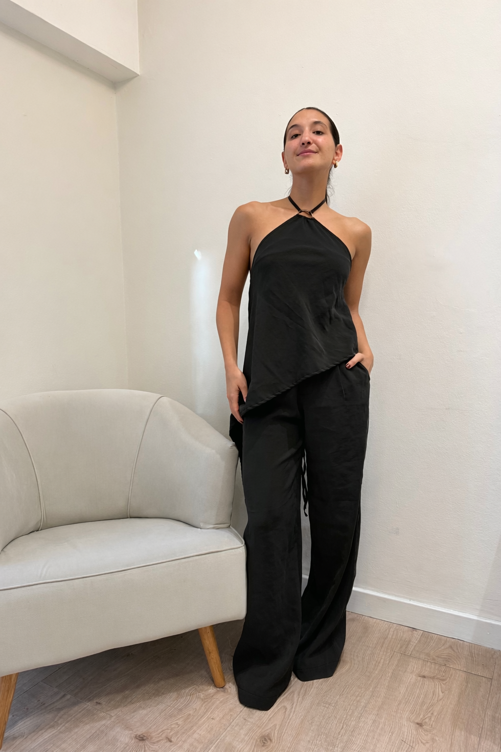Blusa con corte halter, detalle de hebilla de bronce es cuello. La blusa tiene un largo irregular y su espalda es toda descubierta Confeccionada en tela cupro.