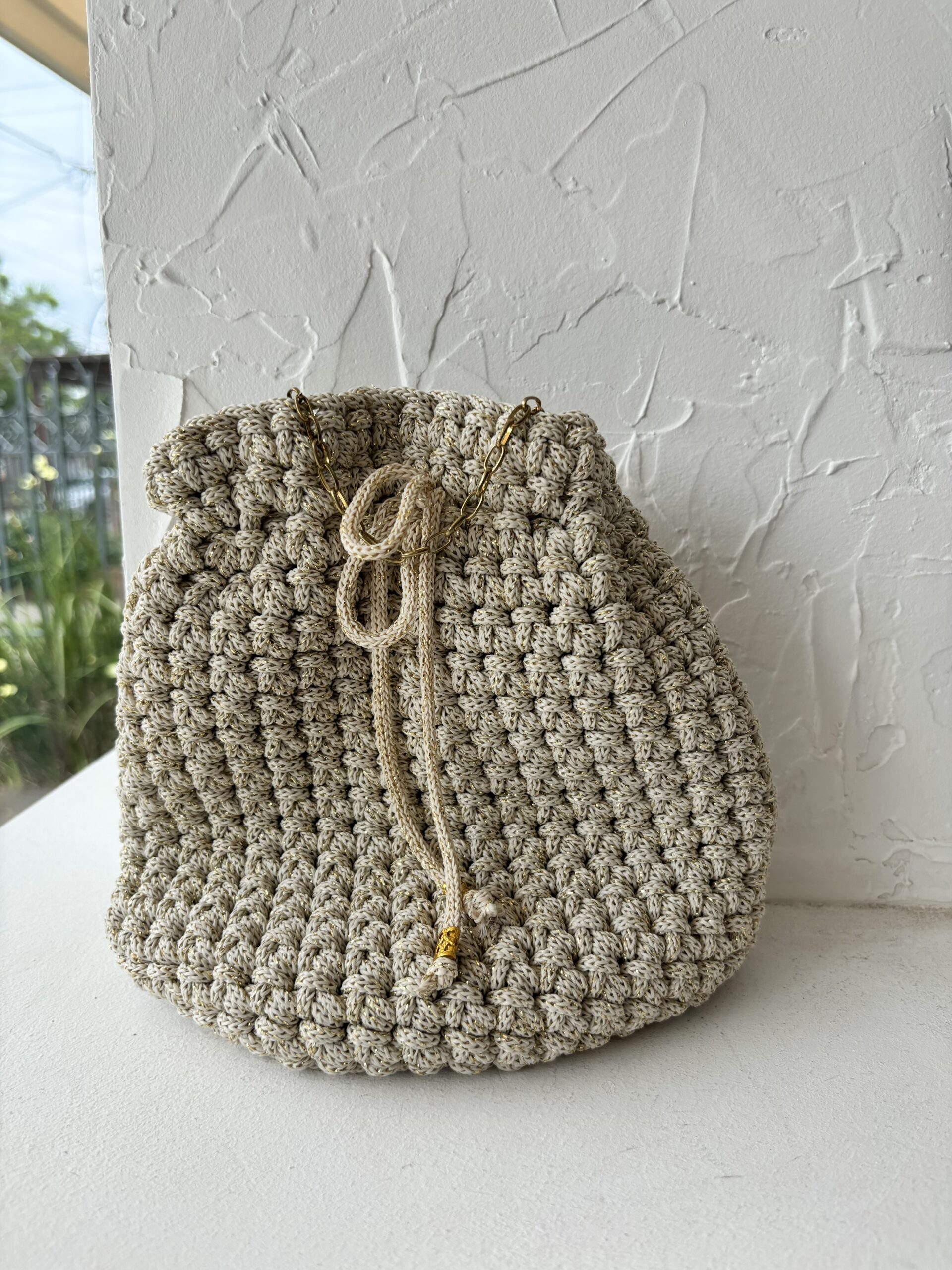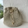 Cartera tejida estilo bucket en tono arena, con un diseño de punto voluminoso que le da textura y suavidad. Posee cierre ajustable con cordón y detalles metálicos dorados que suman un toque delicado y elegante. Un accesorio artesanal, práctico y ligero, ideal para usar todos los días con cualquier look.