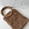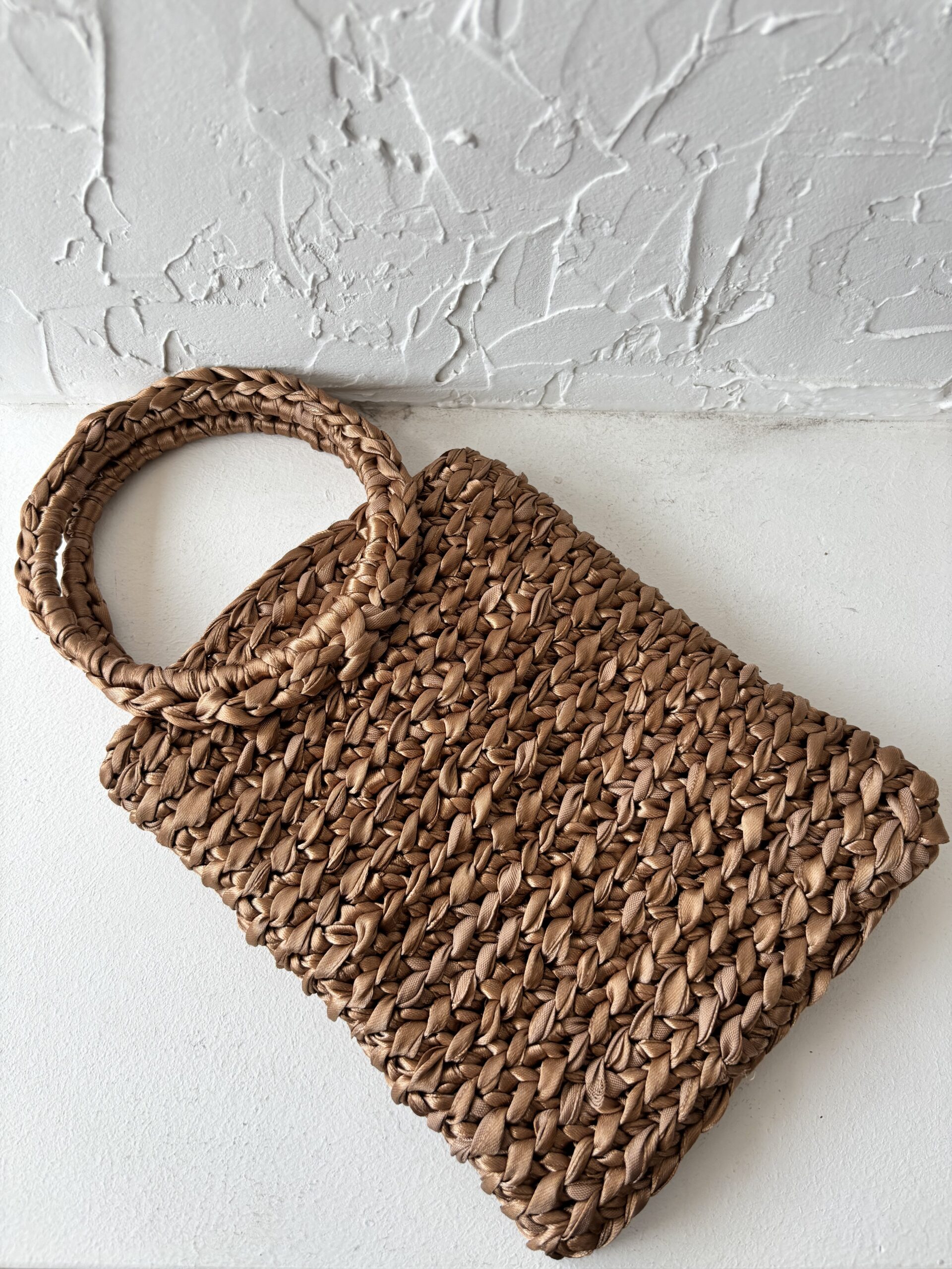 Cartera tejida en tono bronce satinado, confeccionada con tiras anchas que crean un tejido firme, llamativo y con un brillo suave. Cuenta con manijas circulares tejidas a juego, que completan un diseño elegante y artesanal. Un accesorio versátil y sofisticado, ideal para elevar cualquier look tanto de día como de noche.