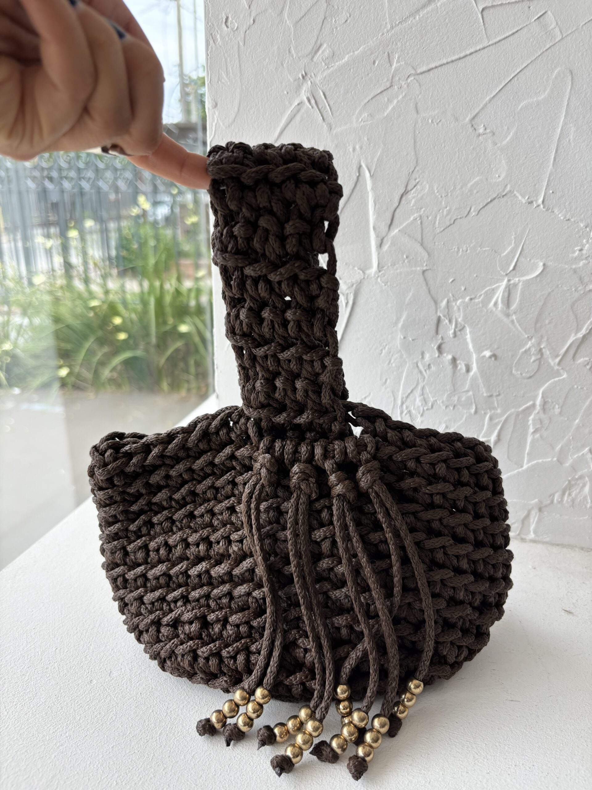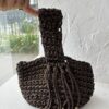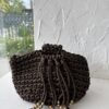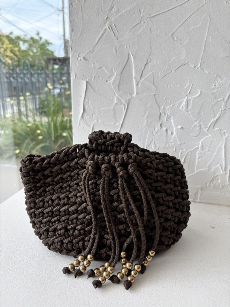 Cartera tejida en color chocolate con diseño tipo pouch, que se frunce en la parte superior creando un efecto elegante y artesanal. Posee una manija ancha tejida, cómoda y resistente, y detalles de flecos con cuentas doradas que aportan movimiento y un toque sofisticado. Un accesorio único, con carácter y estilo boho chic.
