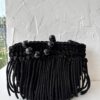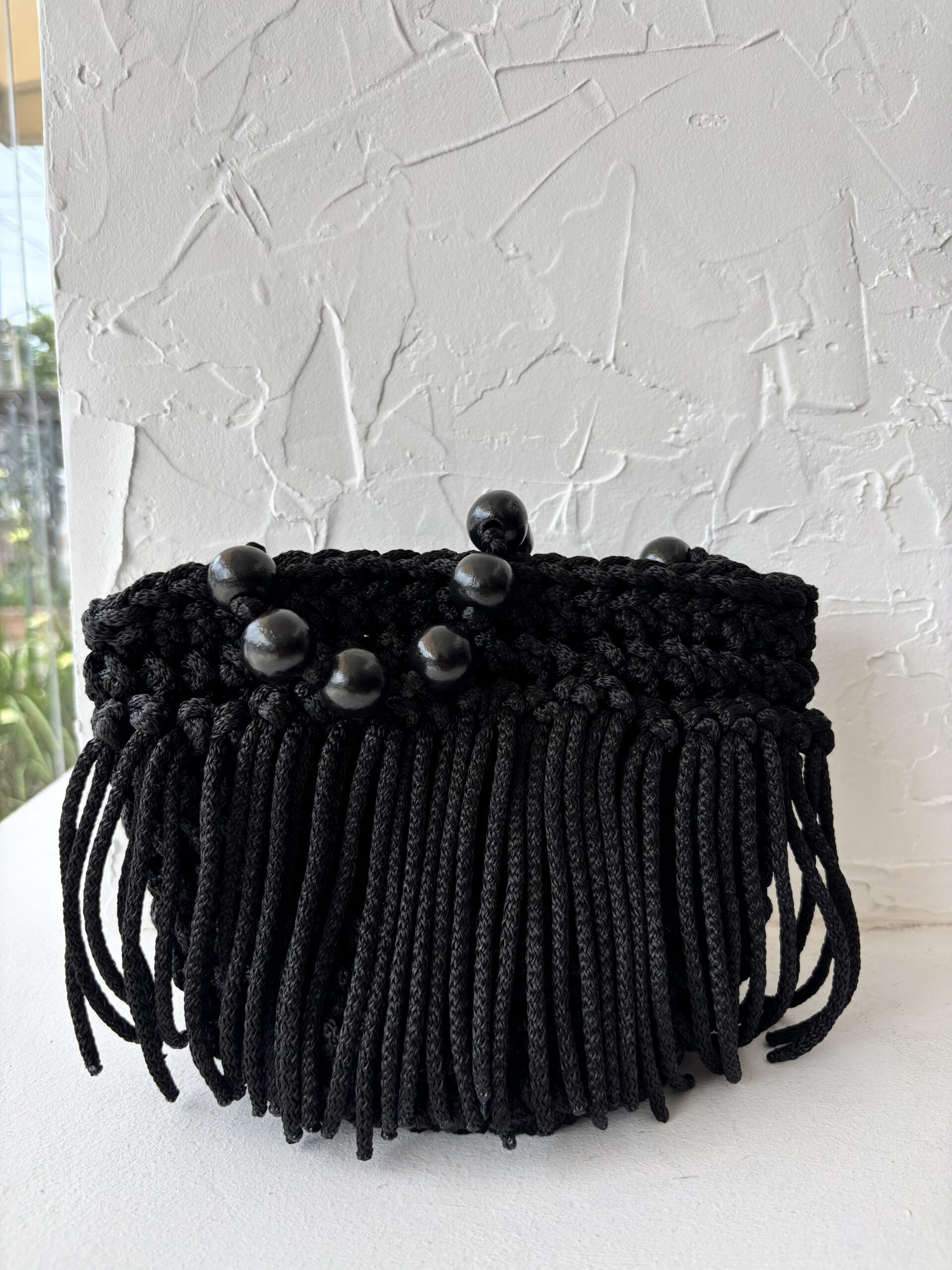Cartera tejida a crochet con detalle de flecos. La tira está hecha con pelotas de madera del mismo tono.