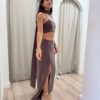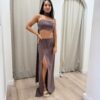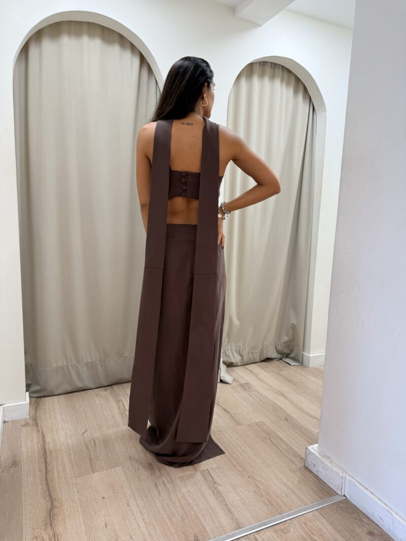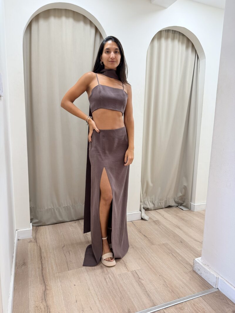 Conjunto de dos piezas, top escote recto con botones forrados en espalda y tiras finas. Pollera recta con tajo en una pierna. Tiene lazo que lo hace único y original. Confeccionado en tela cupro de seda natural.