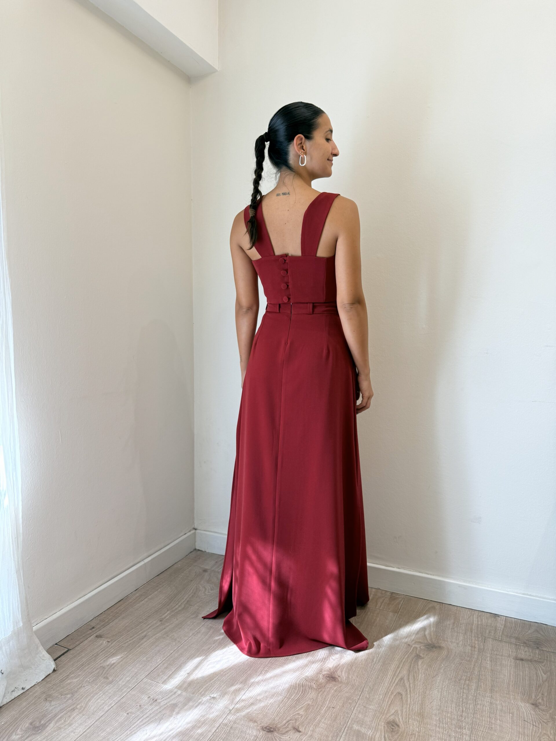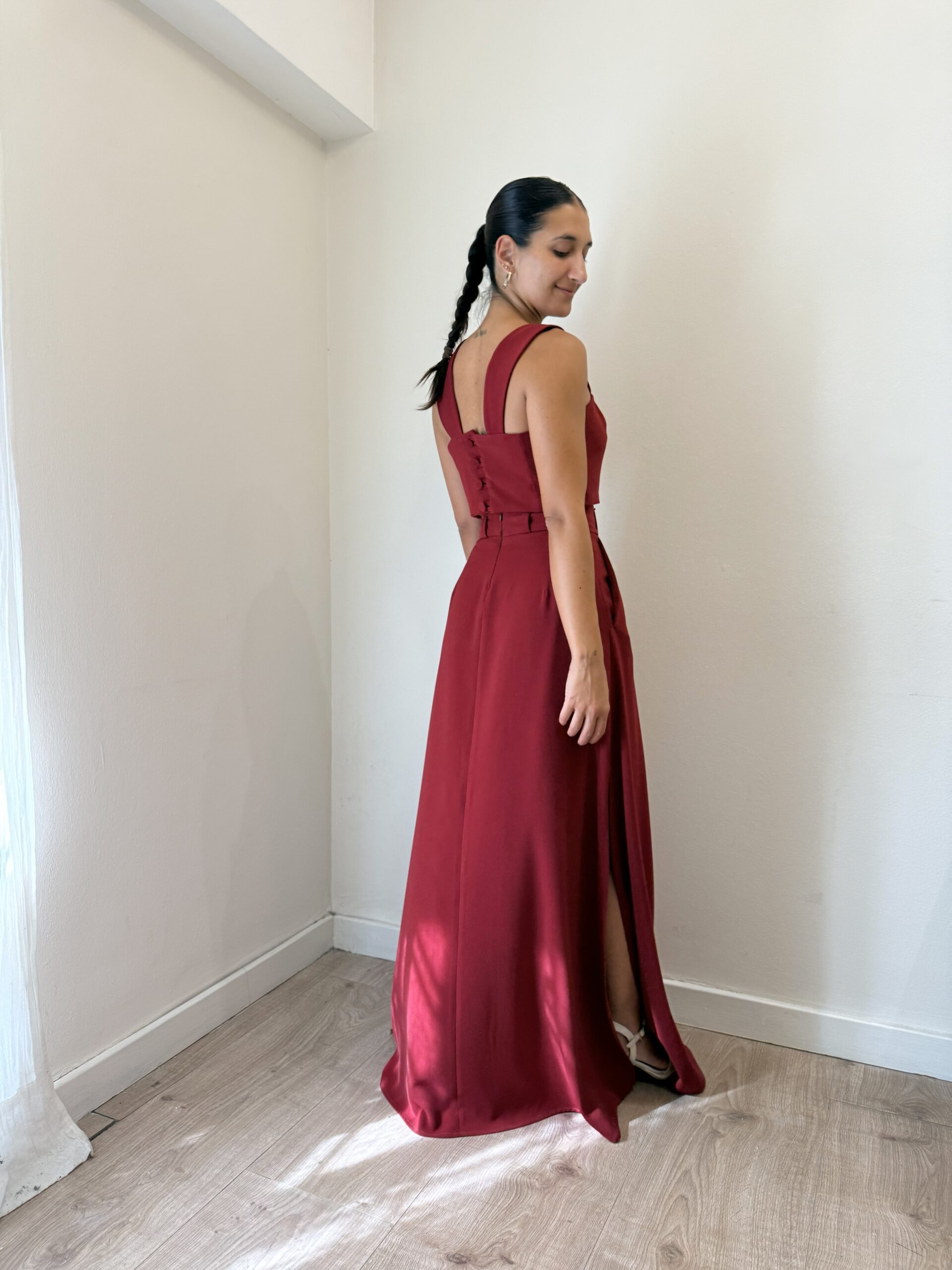 Conjunto de dos piezas, top escote recto, tiras anchas en los hombros y botones forrados en la espalda . La pollera corte A con tajo en ambas piernas y pasacintos. Confeccionado en tela sastrera.
