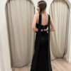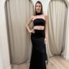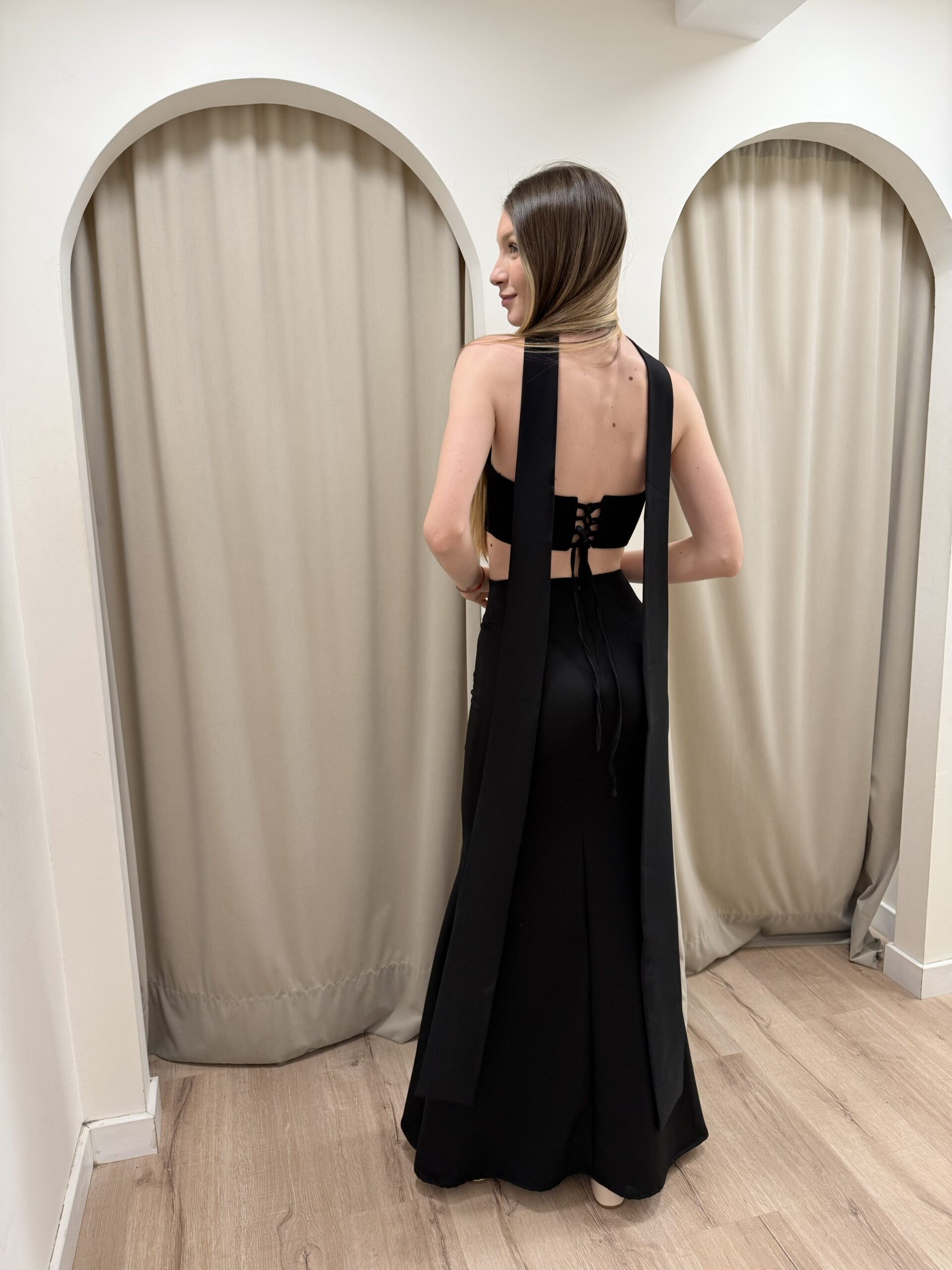 Conjunto largo de dos piezas. Corset recto con tiras regulables en espalda. Pollera corte sirena tiro alto y cierre en costura central de espalda. Confeccionado en creppe sastrero.