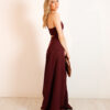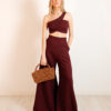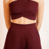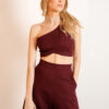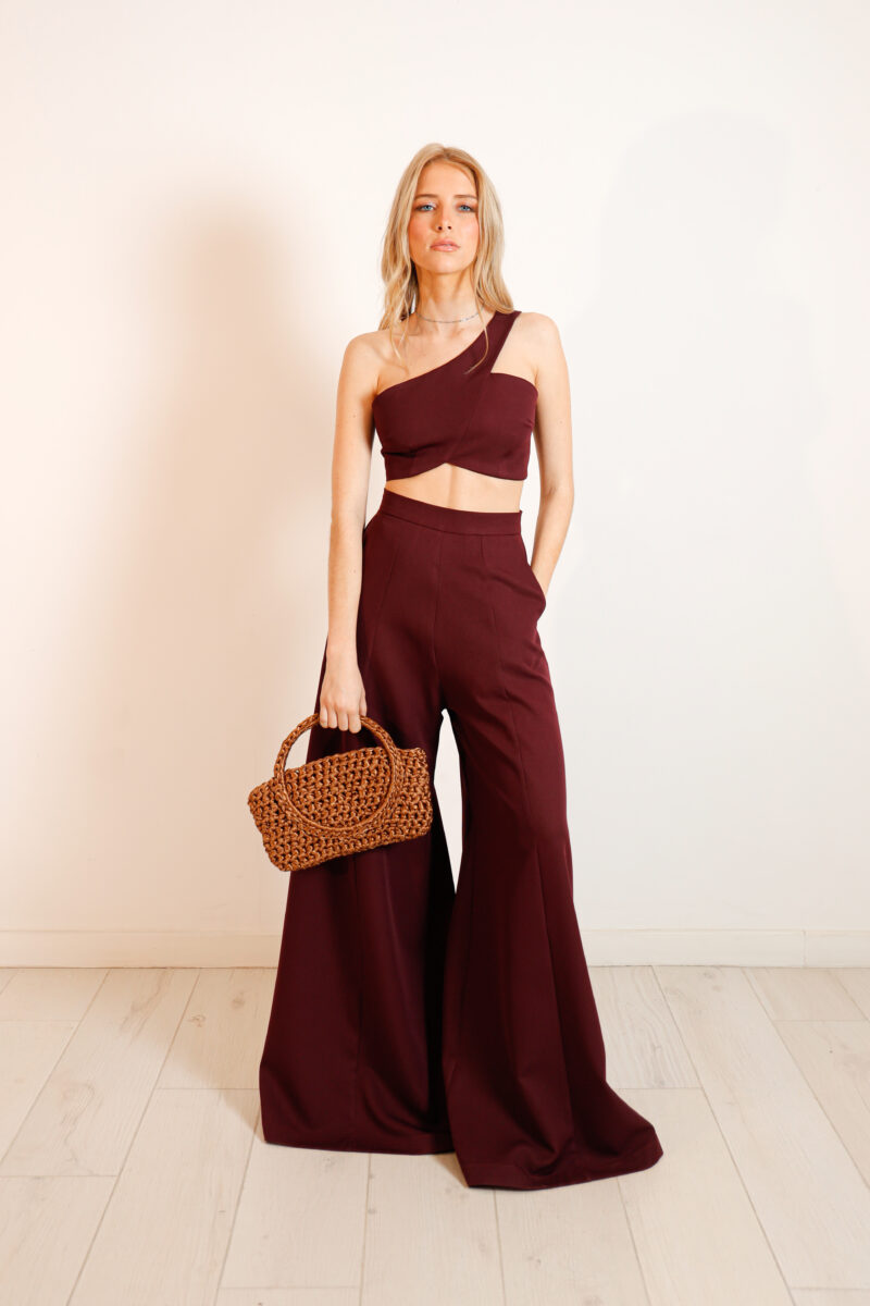 Conjunto largo de dos piezas. Top irregular a un hombro con botones forrados en espalda. Pantalón ancho tiro alto con bolsillos laterales y cierre en costura central de espalda. Confeccionado en creppe sastrero.