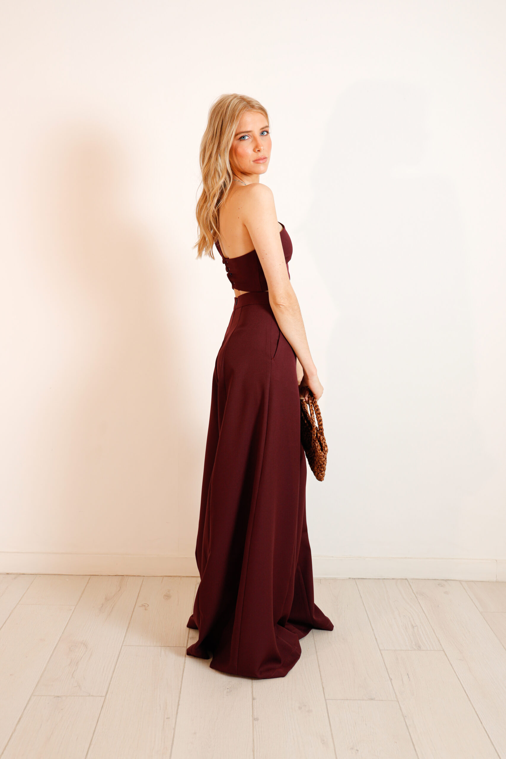 Conjunto largo de dos piezas. Top irregular a un hombro con botones forrados en espalda. Pantalón ancho tiro alto con bolsillos laterales y cierre en costura central de espalda. Confeccionado en creppe sastrero.