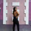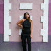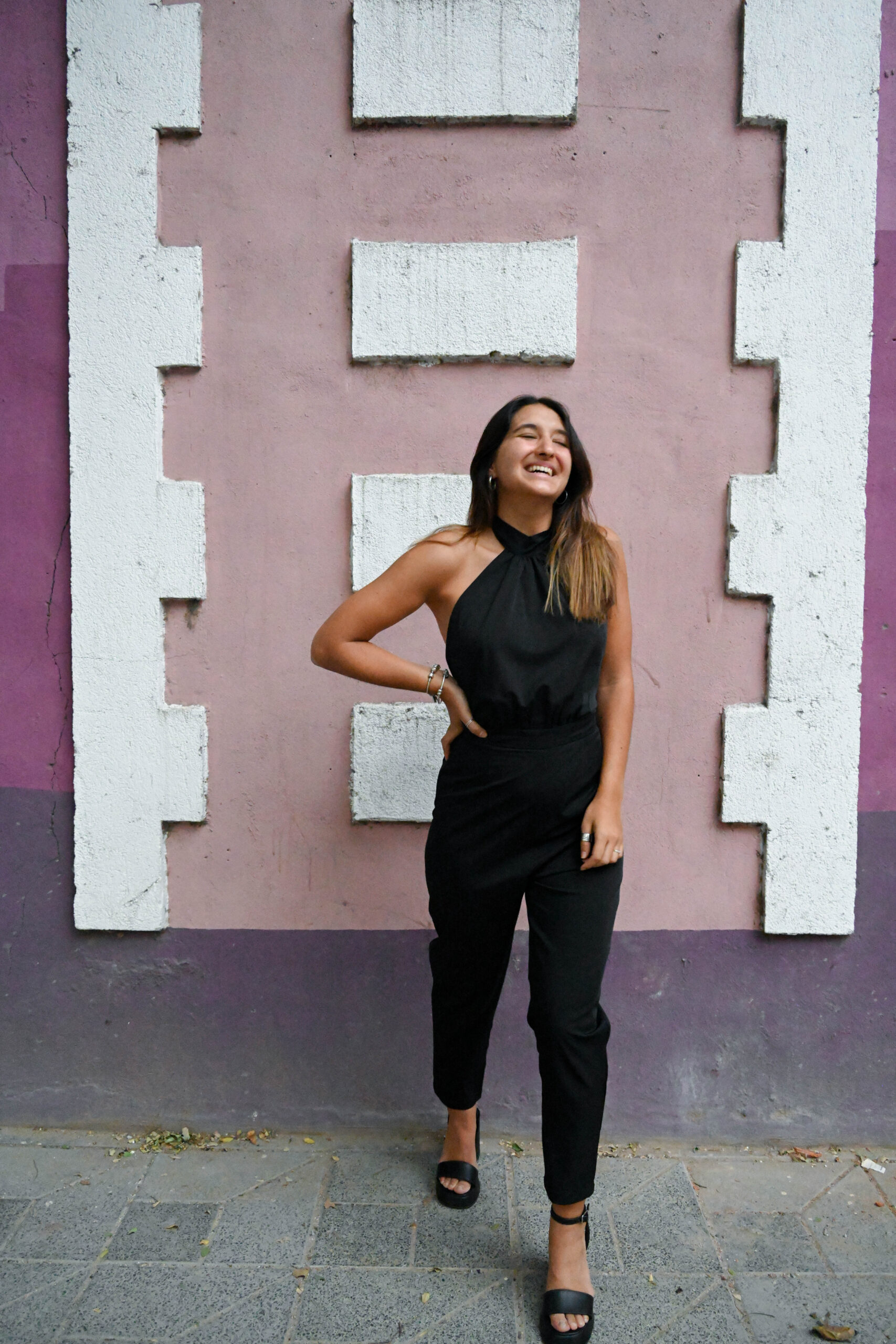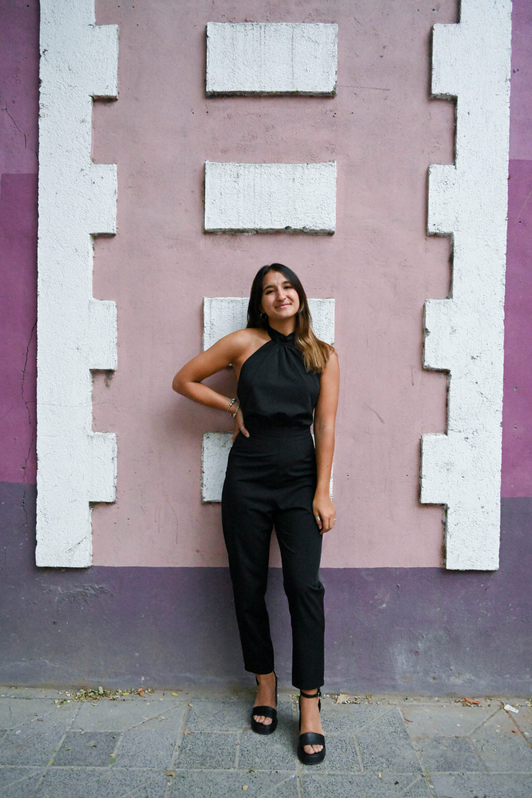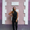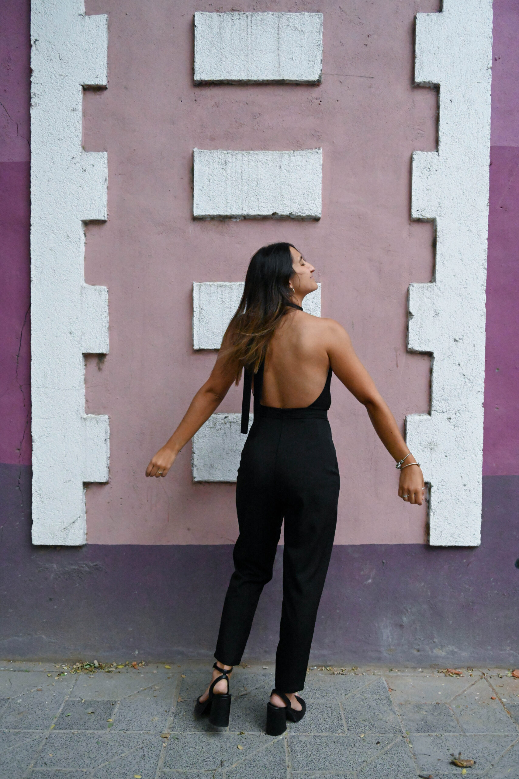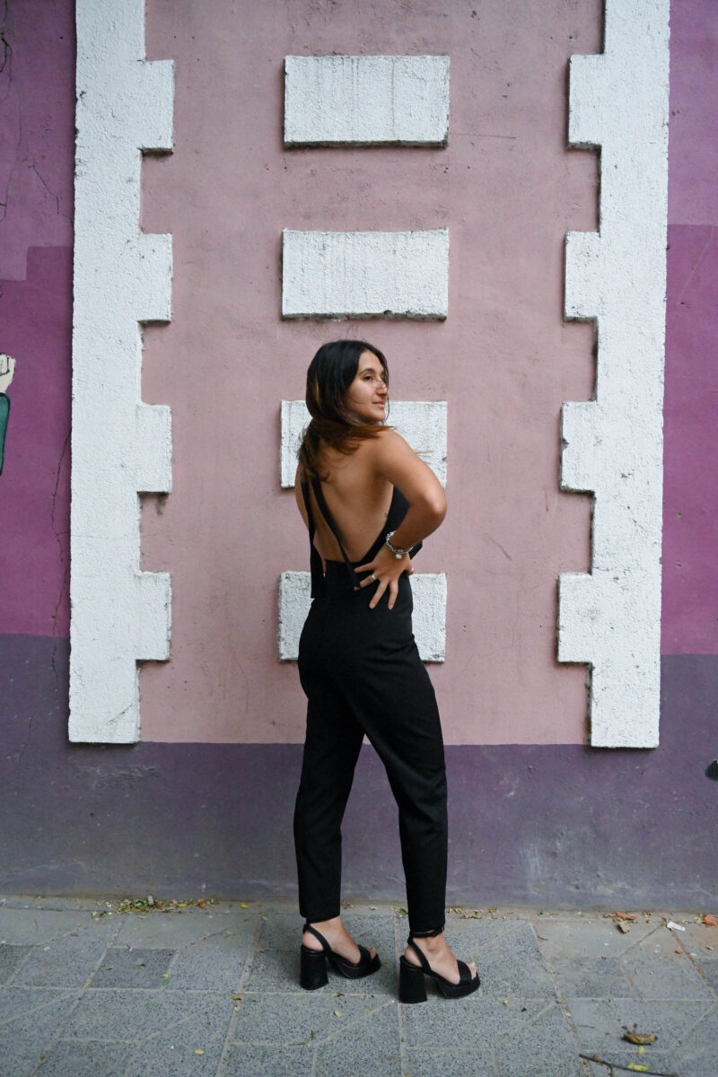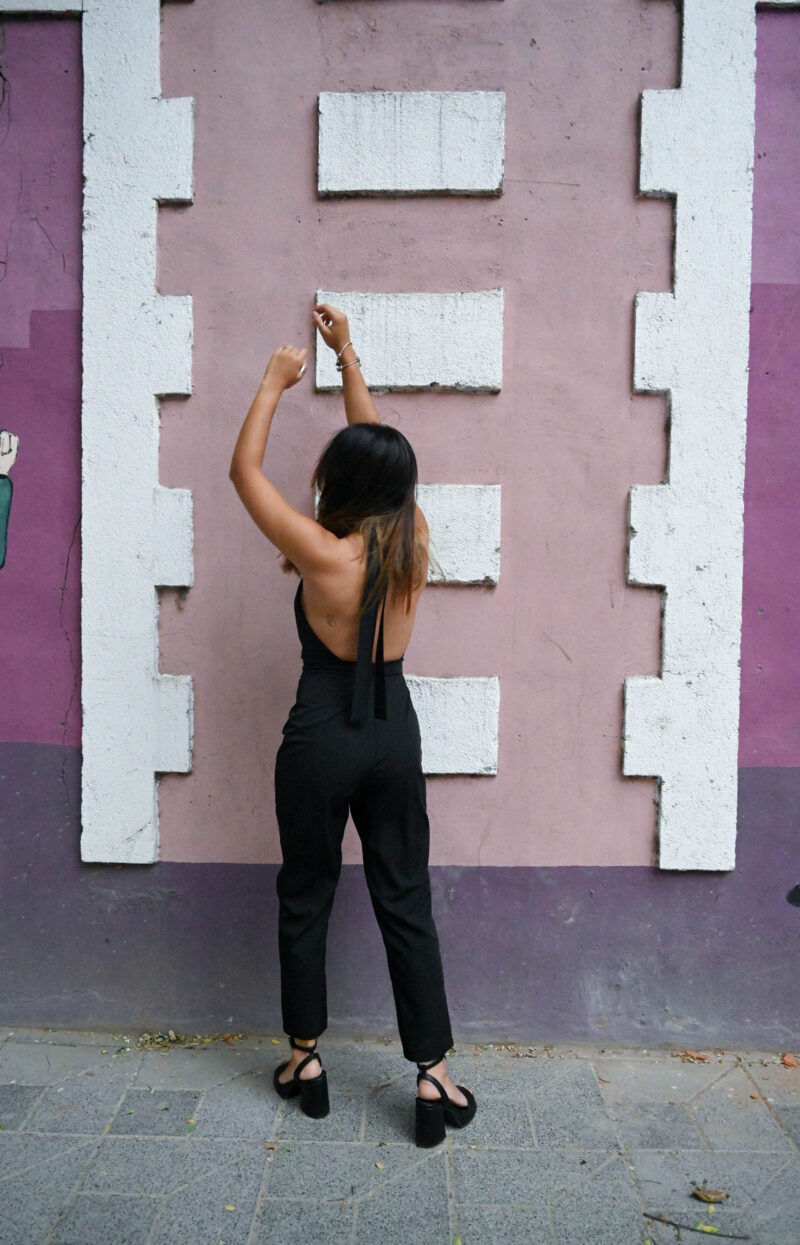Mono largo con escote halter y lazo para atar por detrás del cuello. Espalda descubierta. Pantalón cigarette y cierre invisible en costura central de espalda. Confeccionado en creppe sastrero.