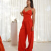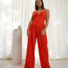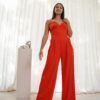 Mono de fiesta escote en V, tiene la cintura ancha y el pantalón es sastrero ancho .