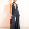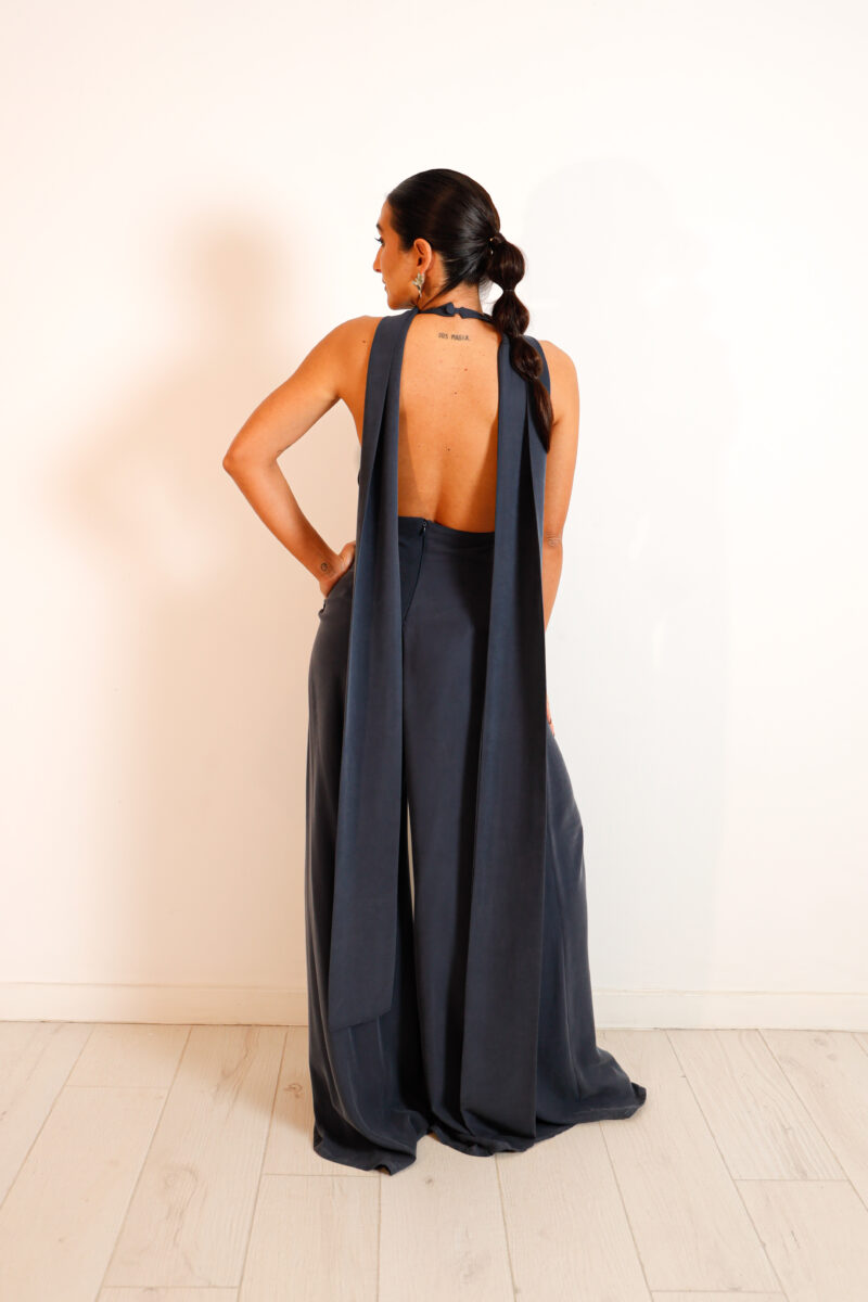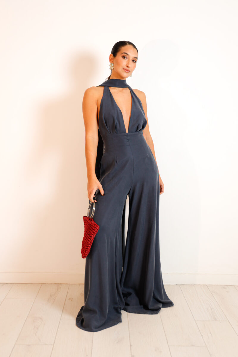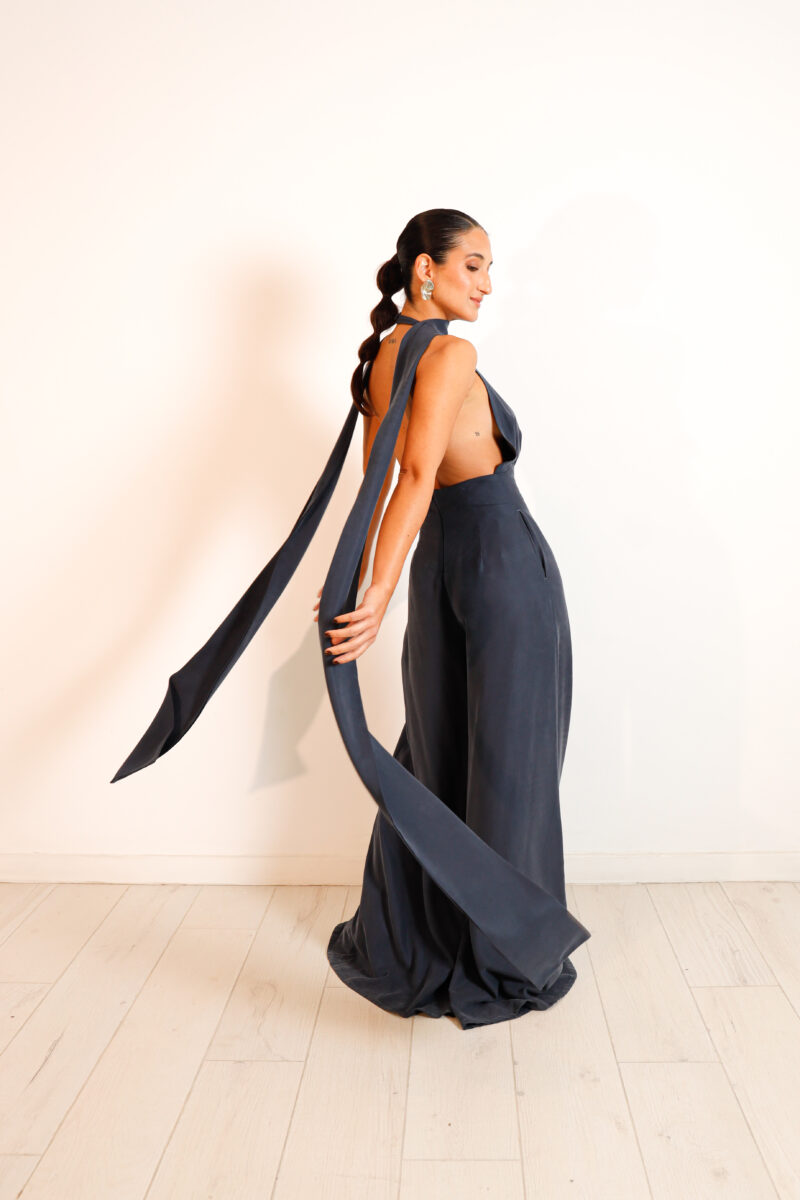 Mono largo escote en V, pretina y pantalón ancho. Cierre central en espalda. Confeccionado en tela crepe de seda. Tiene la opción de usar lazo o colocarlo como cinturón.