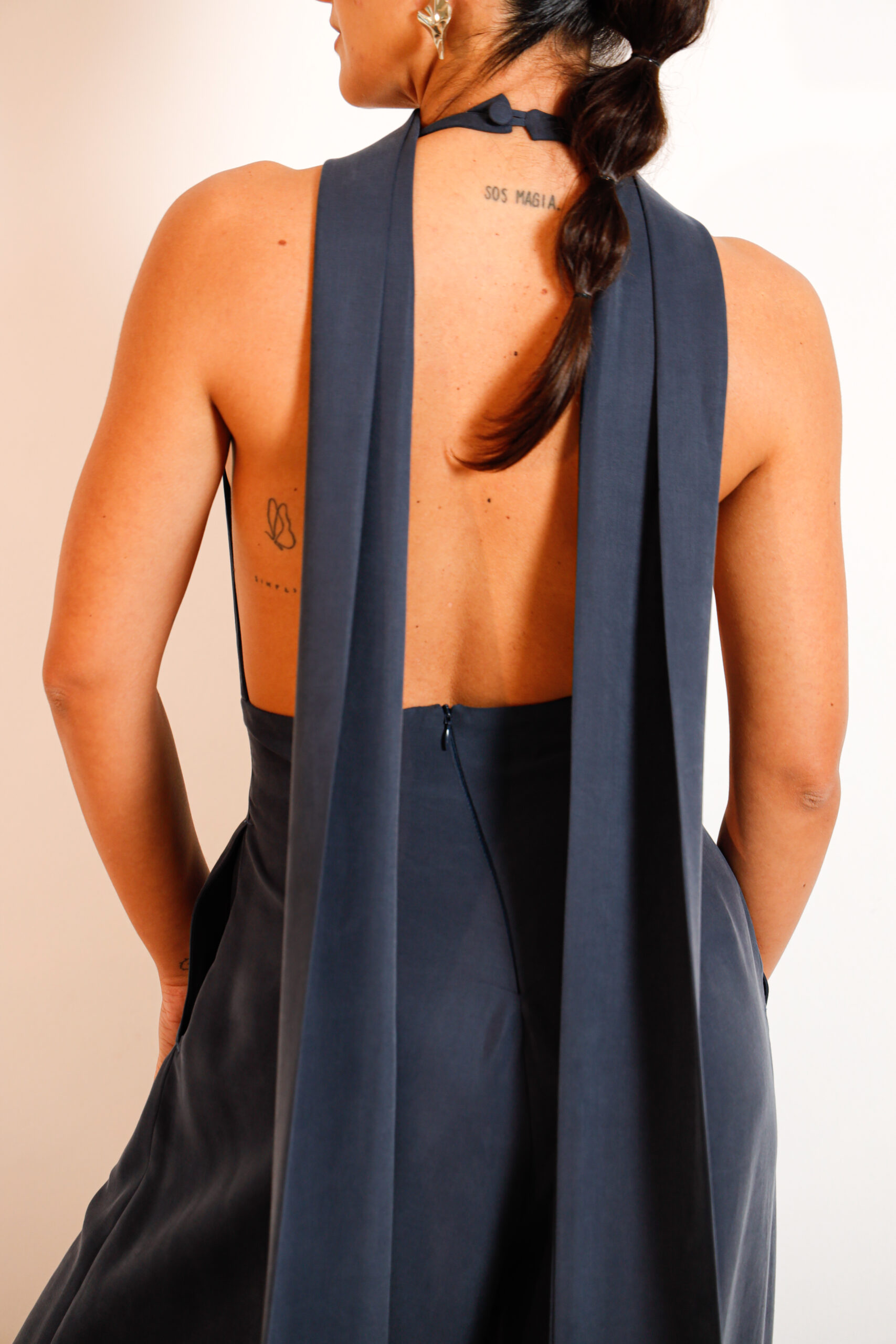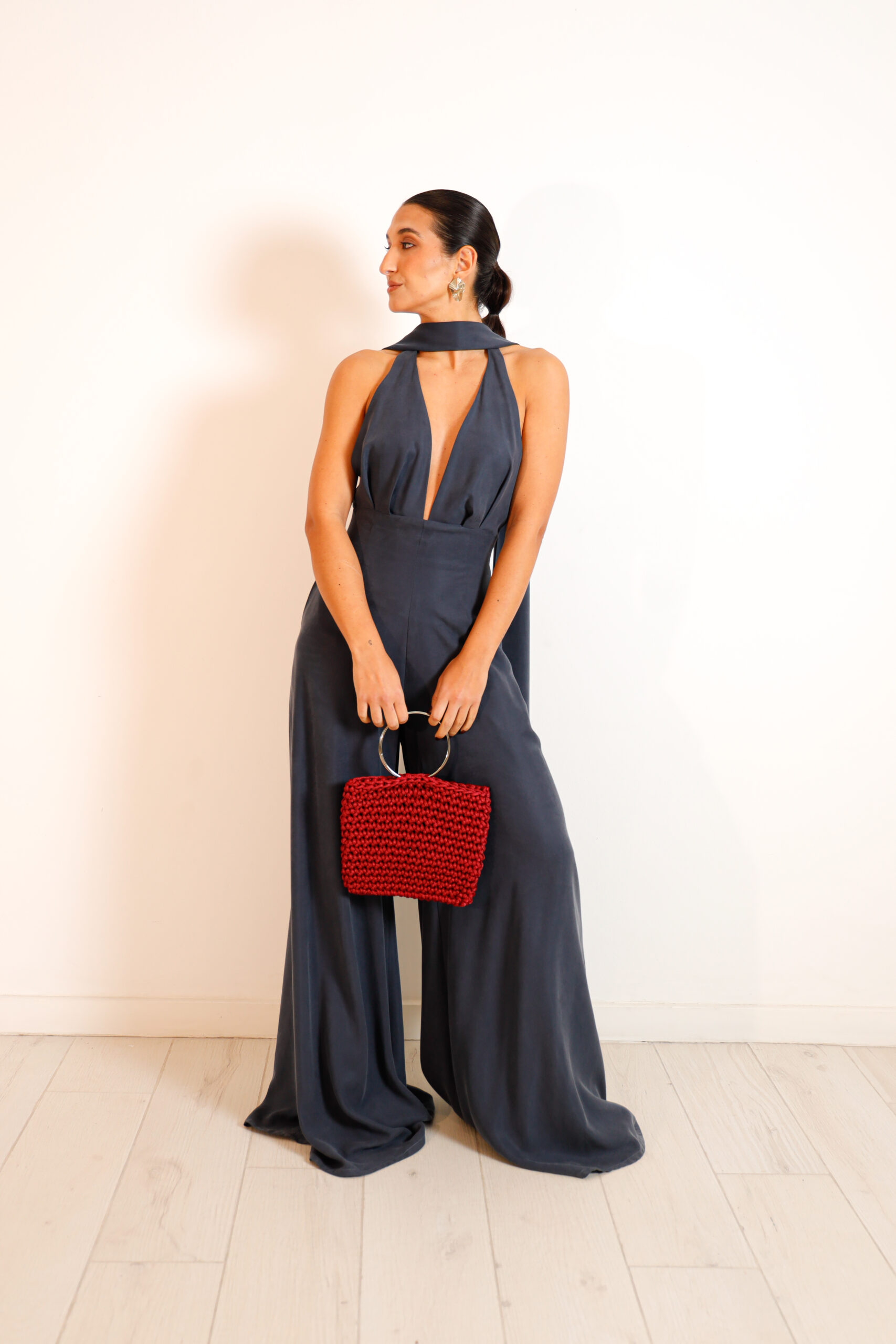 Mono largo escote en V, pretina y pantalón ancho. Cierre central en espalda. Confeccionado en tela crepe de seda. Tiene la opción de usar lazo o colocarlo como cinturón.