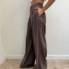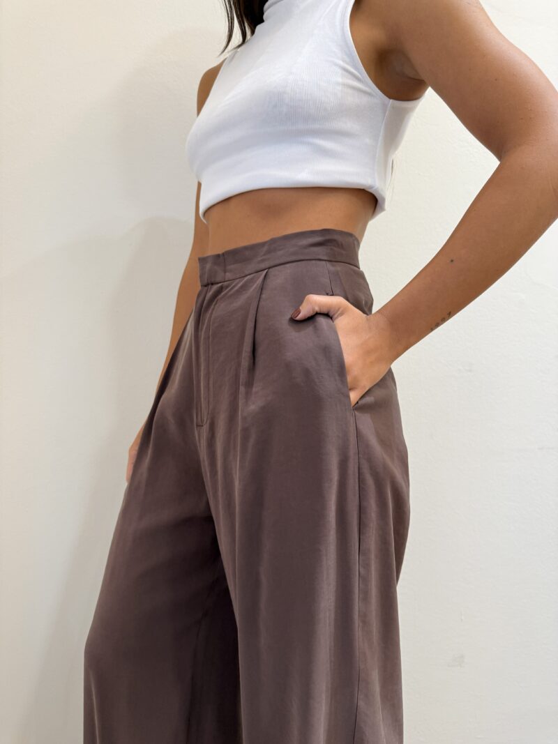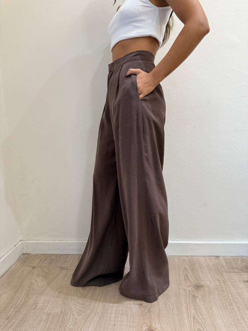 Pantalón sastrero palazzo con cierre y pinzas adelante. Tiene bolsillos a los laterales. Confeccionado en tela cupro.