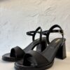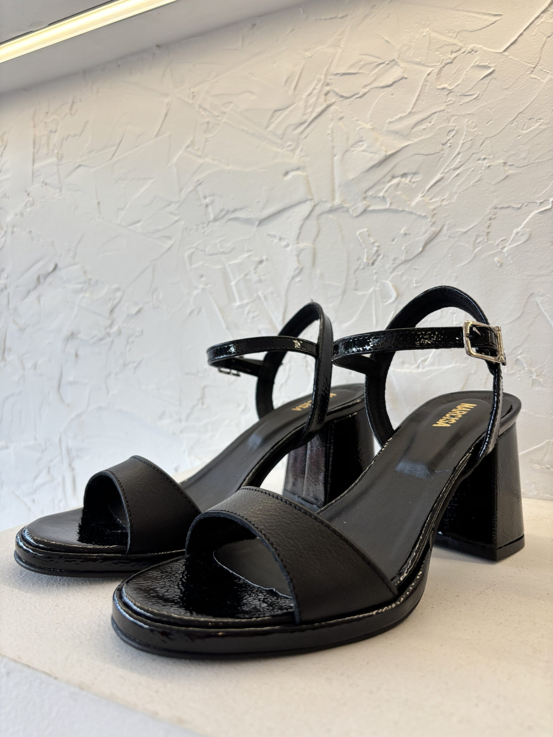 Sandalia de cuero negra. Taco y base de charol. Taco de aproximadamente 8,5 cm. Ideal para ocasiones más arregladas o de fiesta.