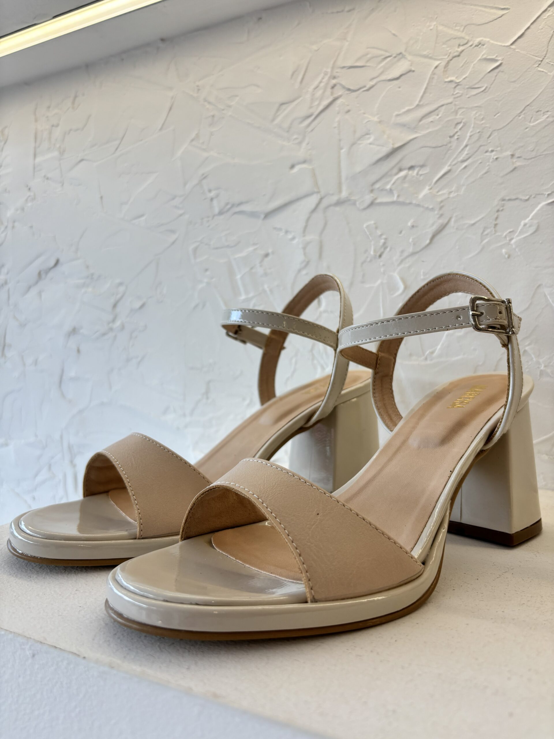 Sandalia de cuero negra. Taco y base de charol. Taco de aproximadamente 8,5 cm. Ideal para ocasiones más arregladas o de fiesta.