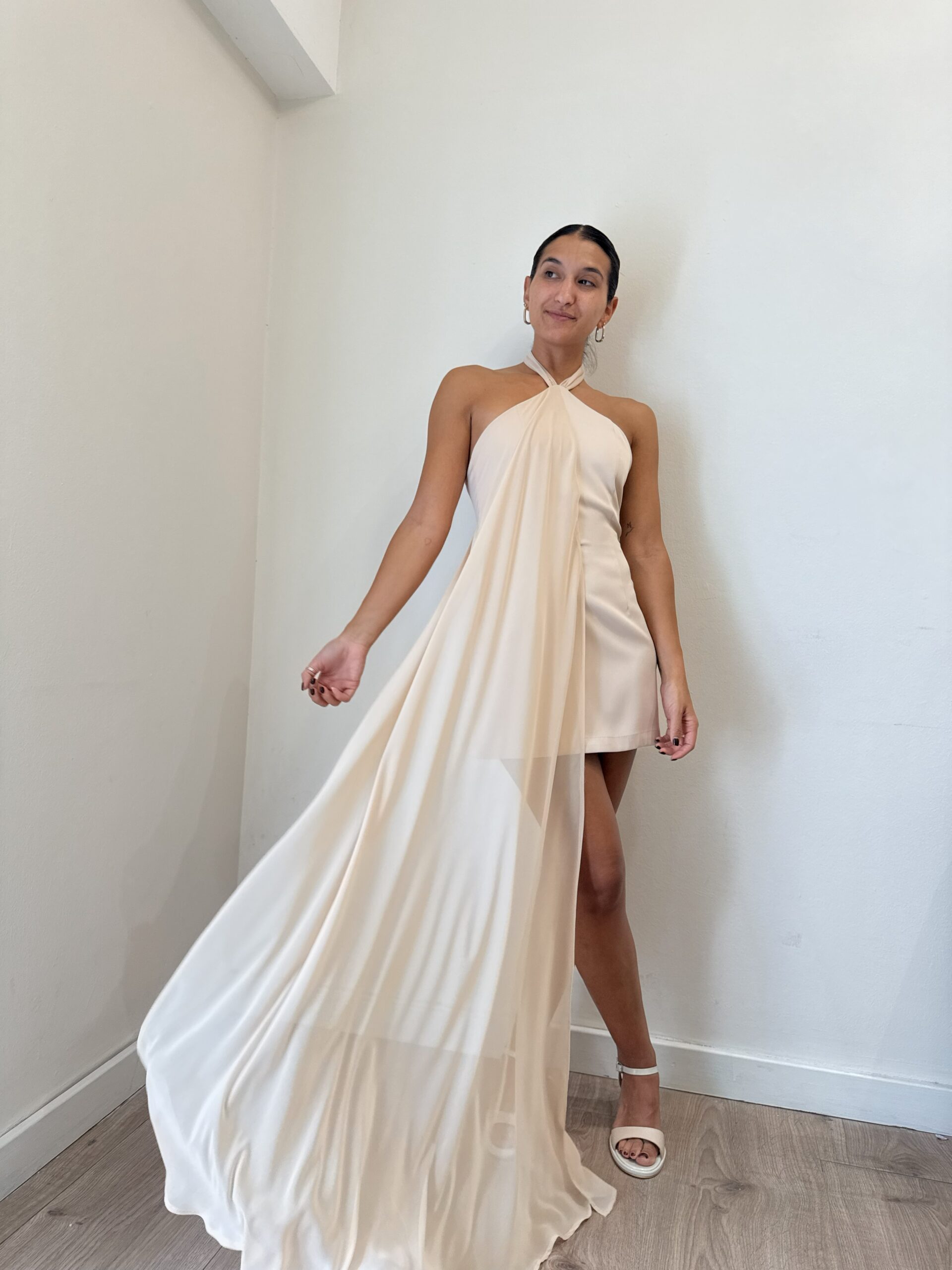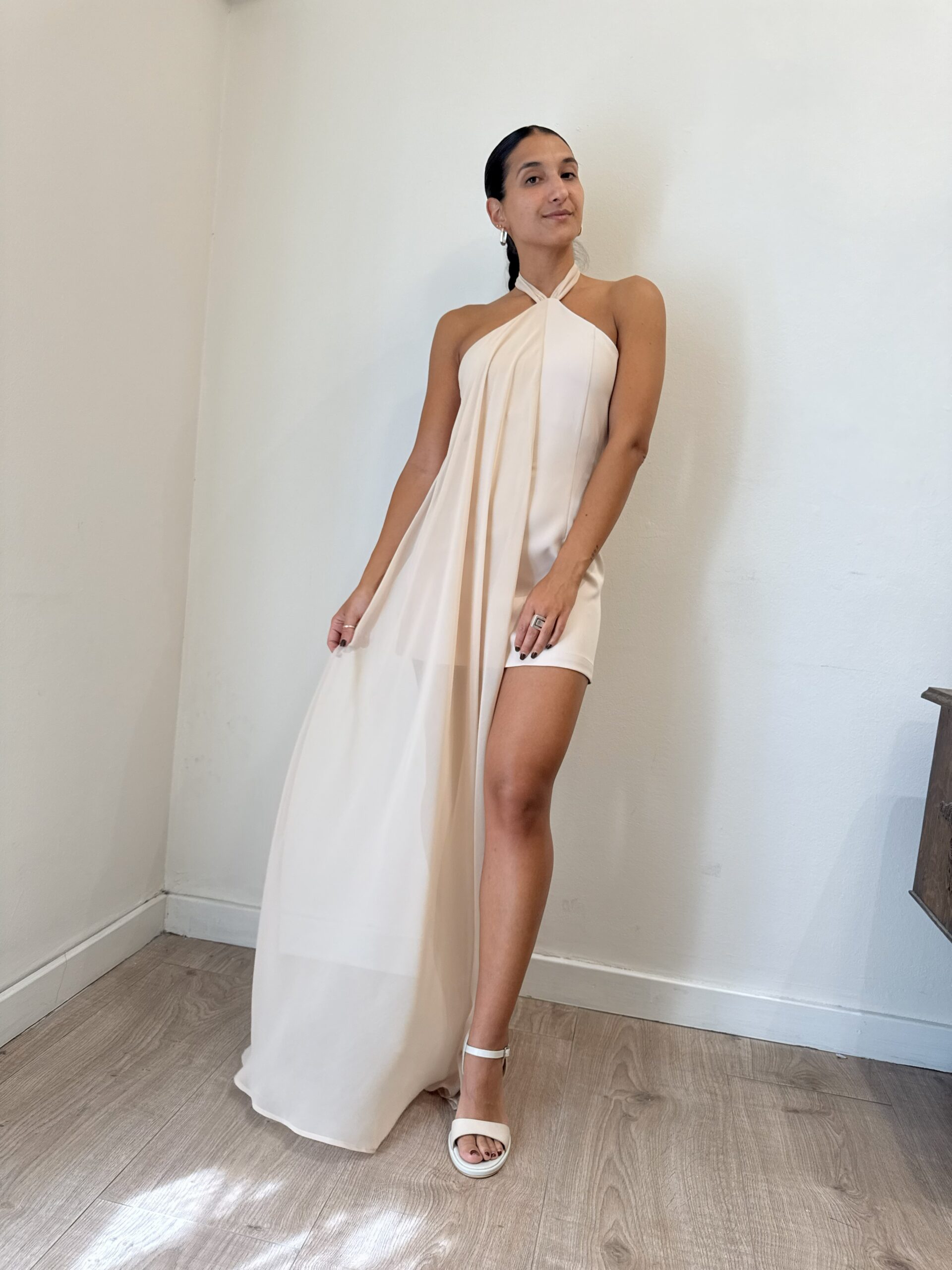 Vestido corto con detalle de gasa que le otorga irregularidad al vestido. Tiene top cuello halter con espalda descubierta. Confeccionado en tela sastrera con gasa muselina.