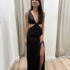 Vestido con escote en V profundo y recortes en la cintura. La espalda está descubierta y tiene un tajo lateral adelante.
