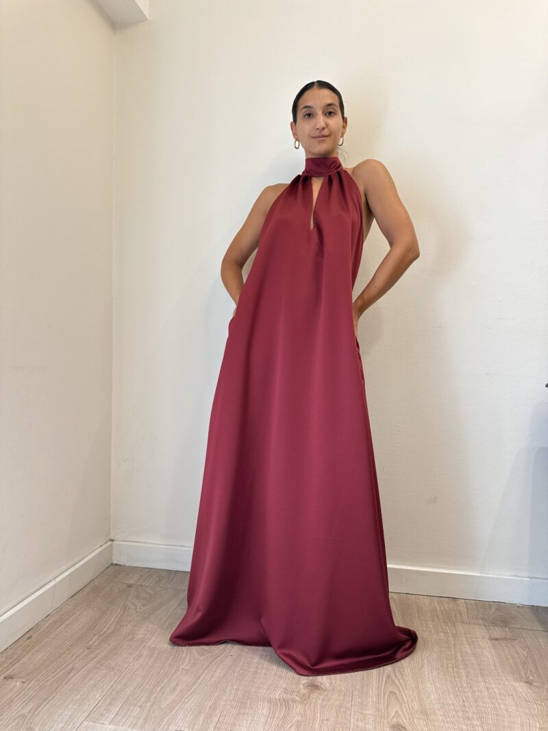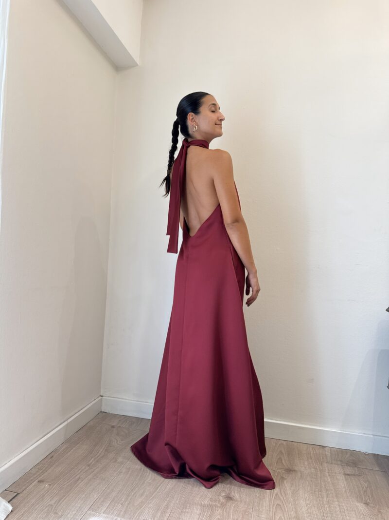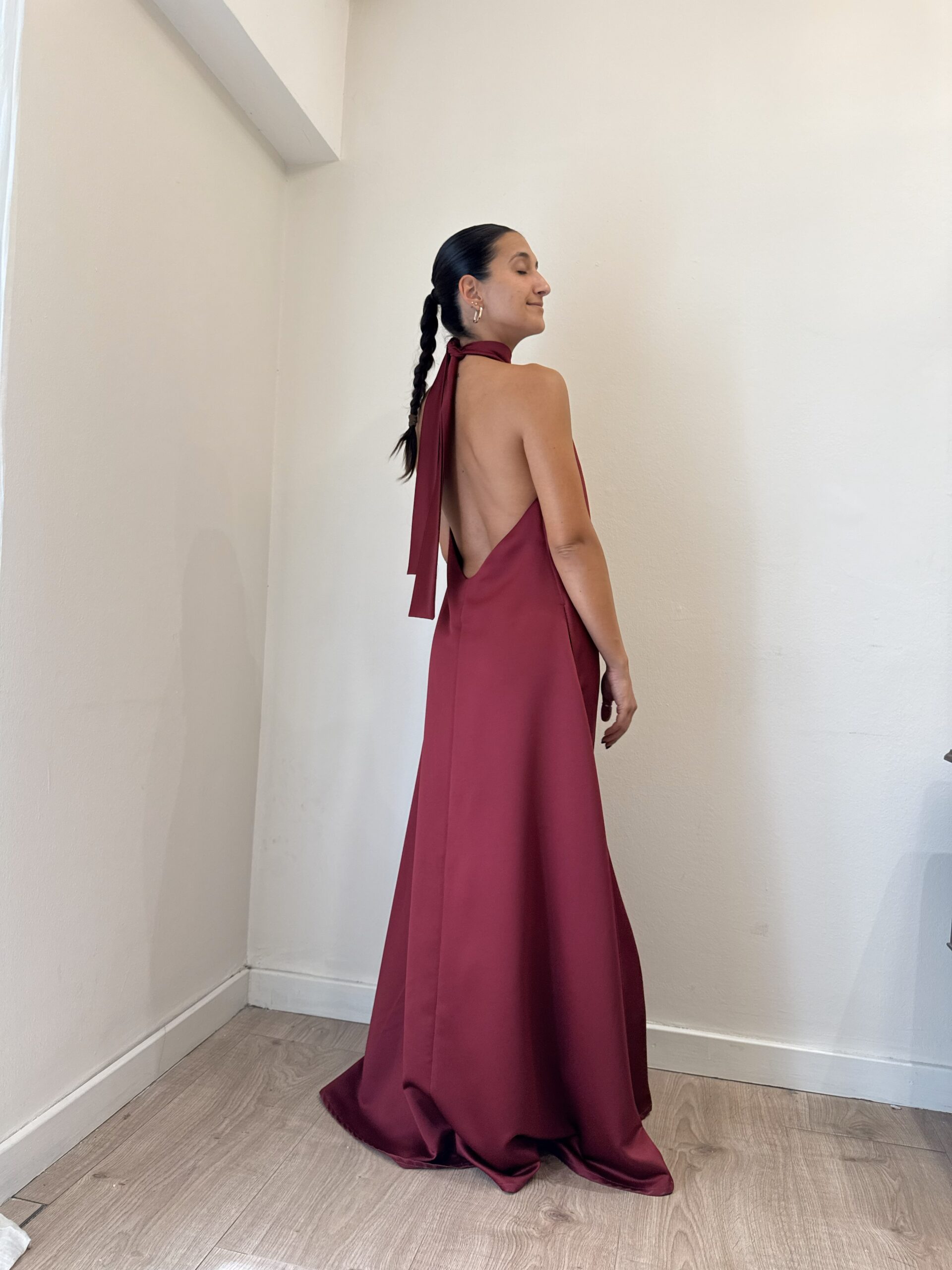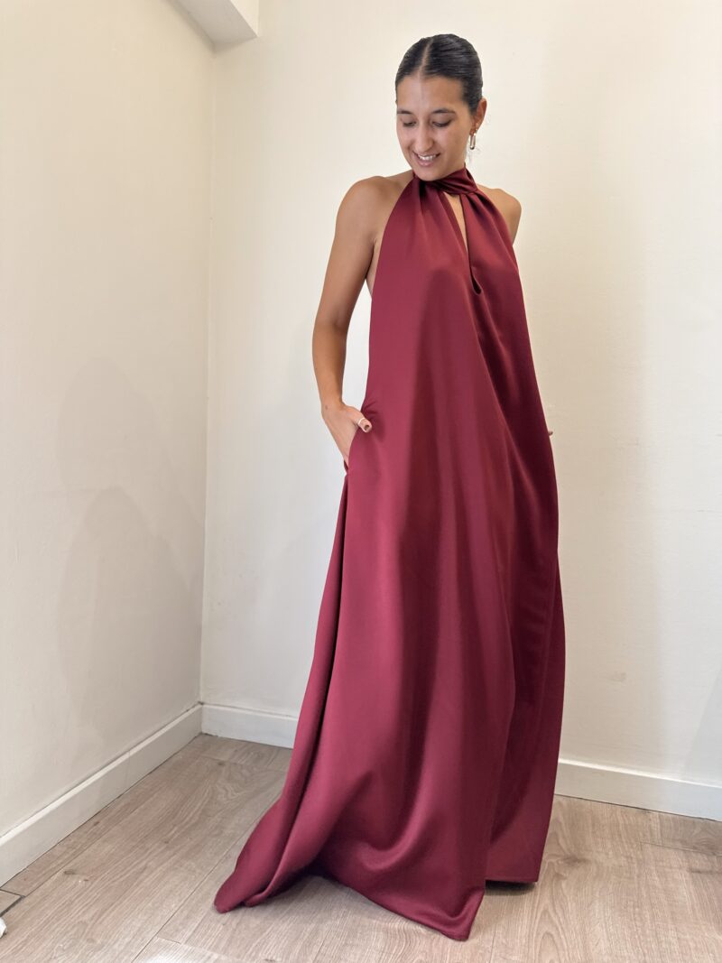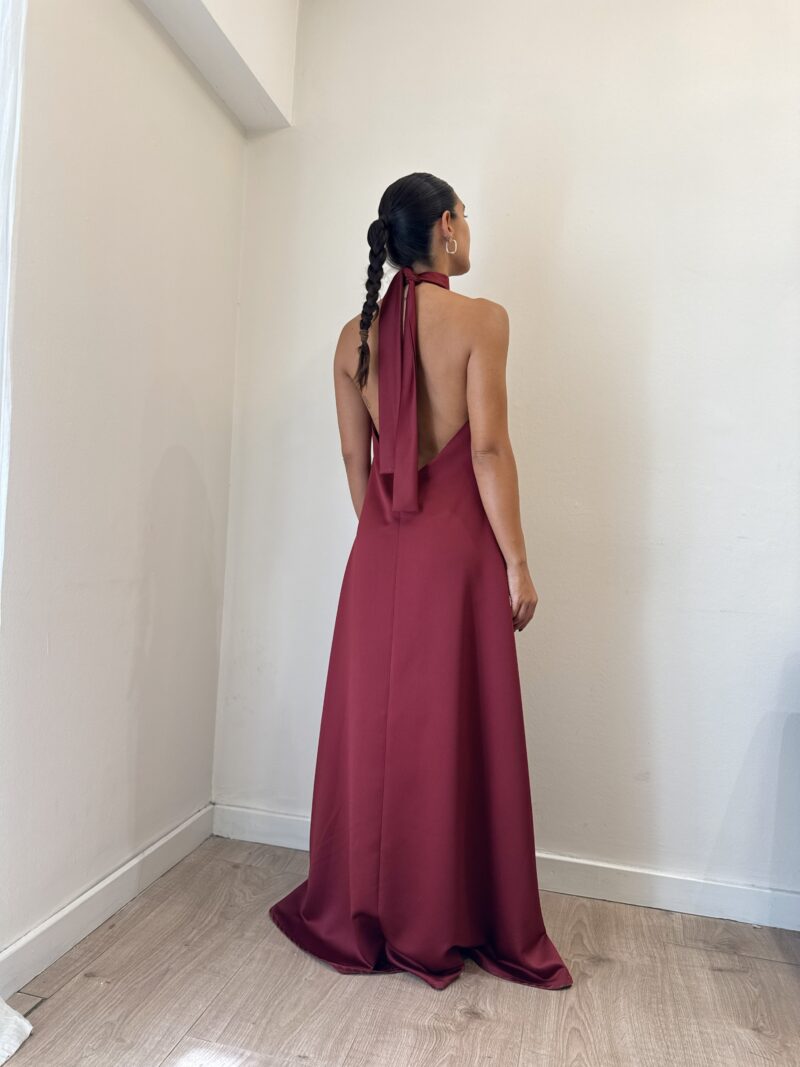 Vestido largo escote halter con recorte en V con lazos en la espalda, pollera con bolsillos y espalda descubierta.
