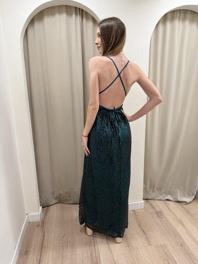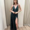 Vestido largo escote en V con lazos en la cintura, pollera con tablas y tajo a un costado.