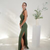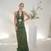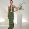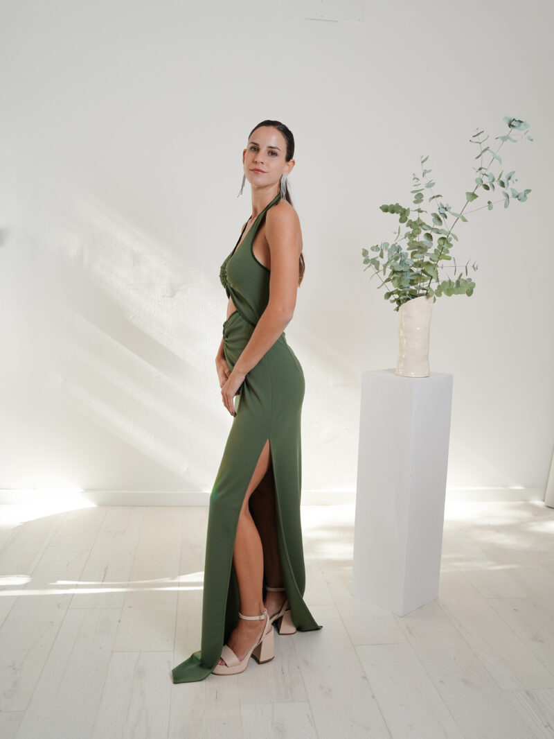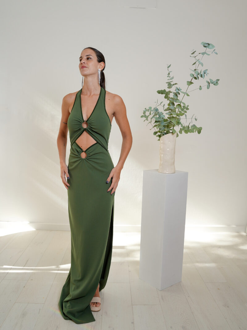 Vestido largo cuello halter con argollas que forman dos aperturas en el abdomen. Pollera recta con tajo lateral.