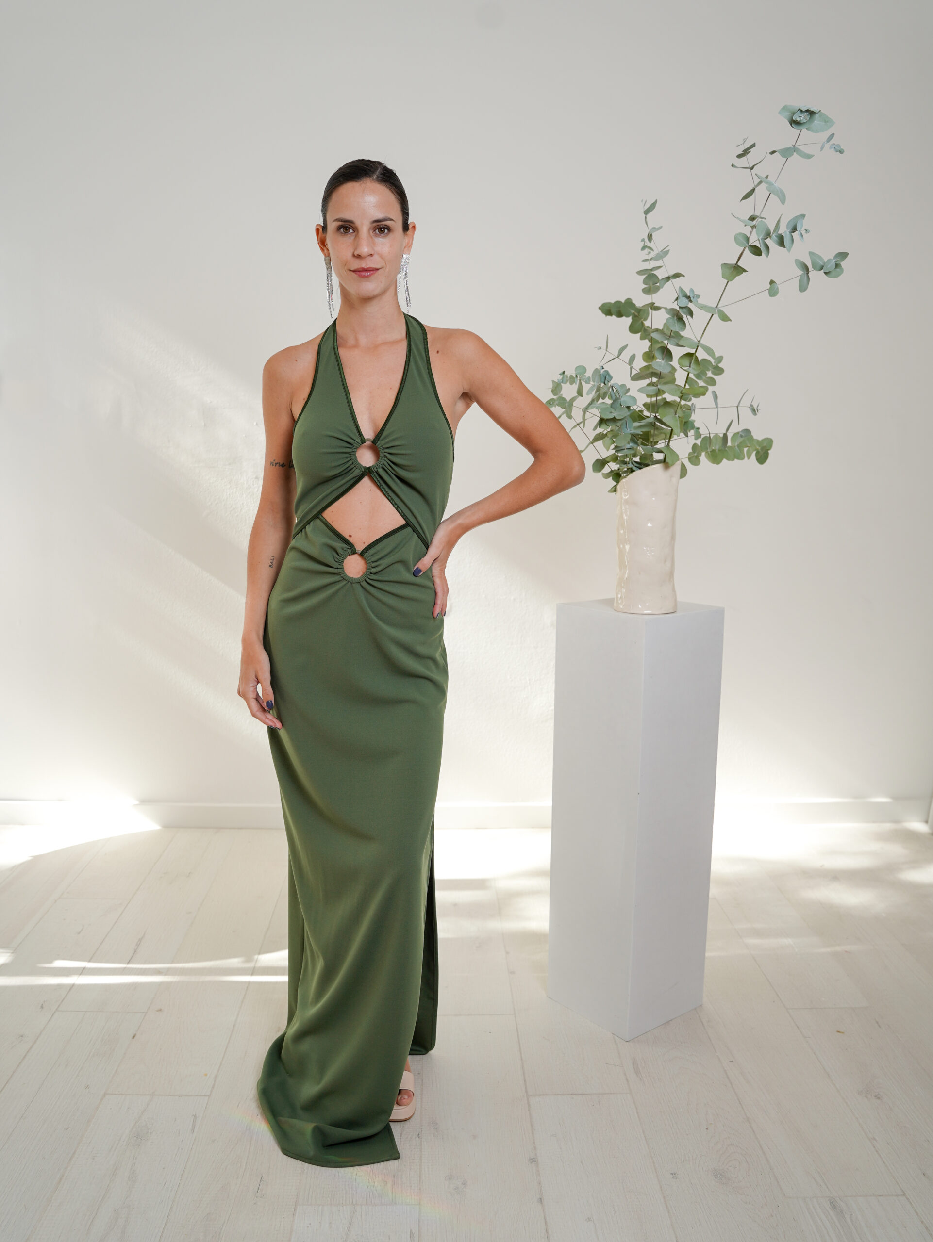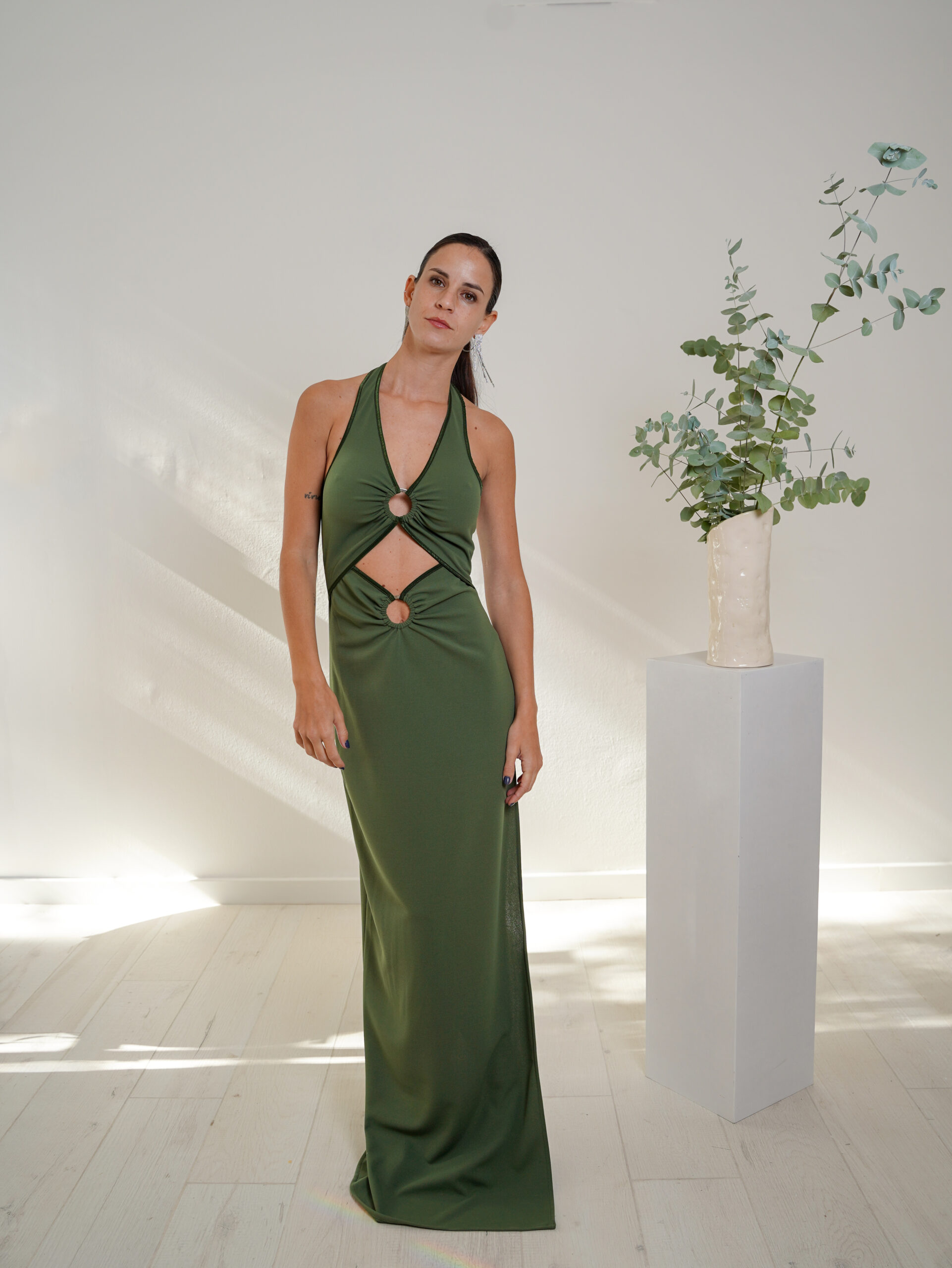 Vestido largo cuello halter con argollas que forman dos aperturas en el abdomen. Pollera recta con tajo lateral.