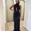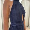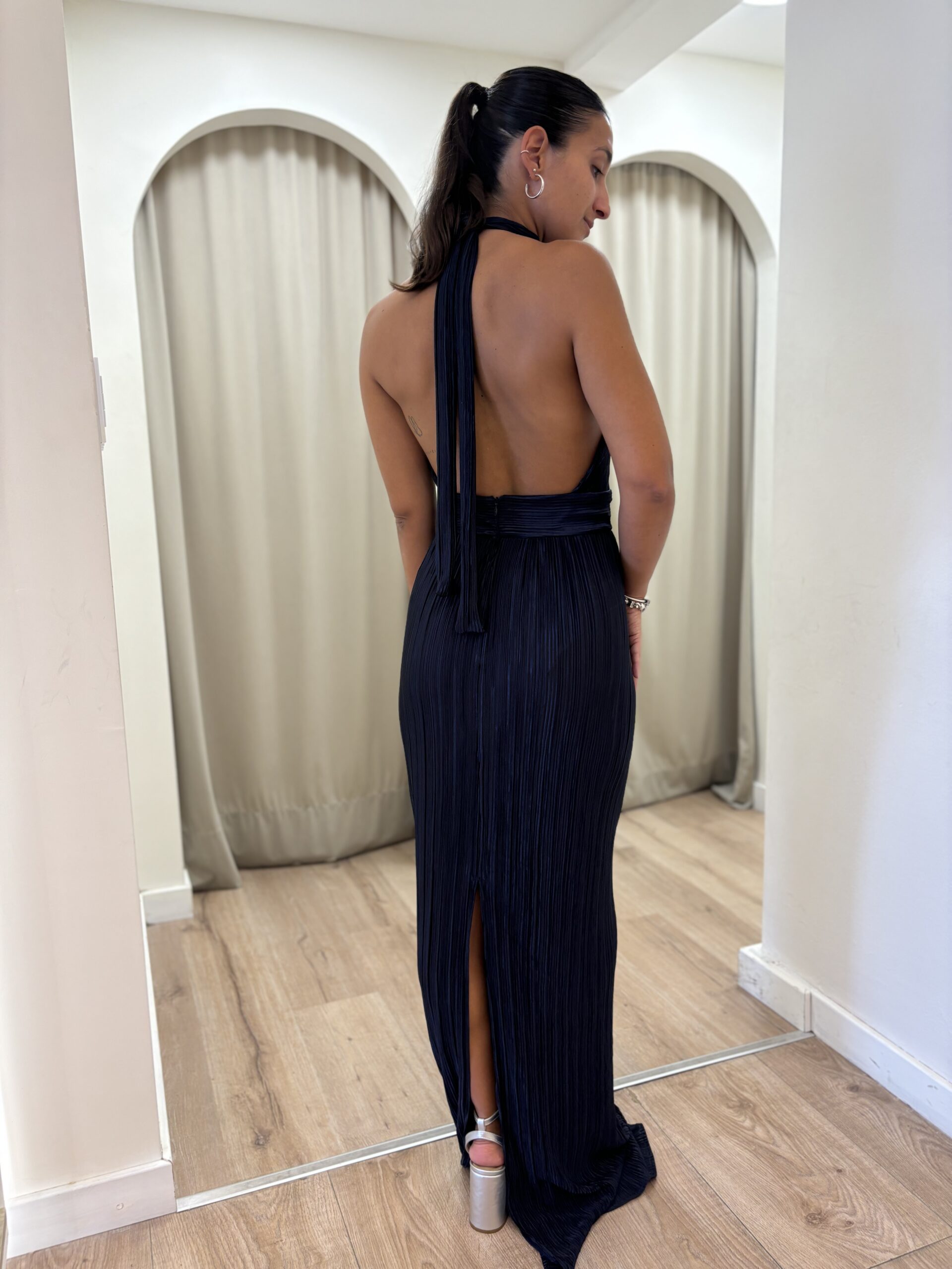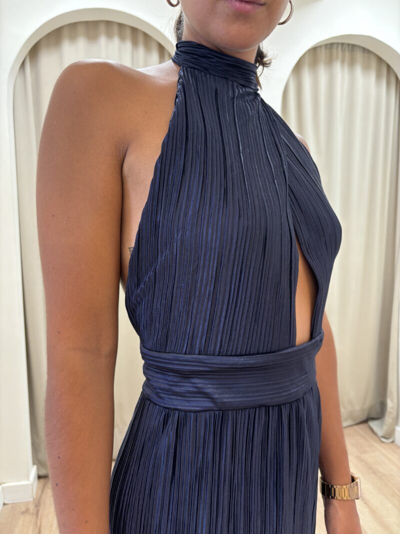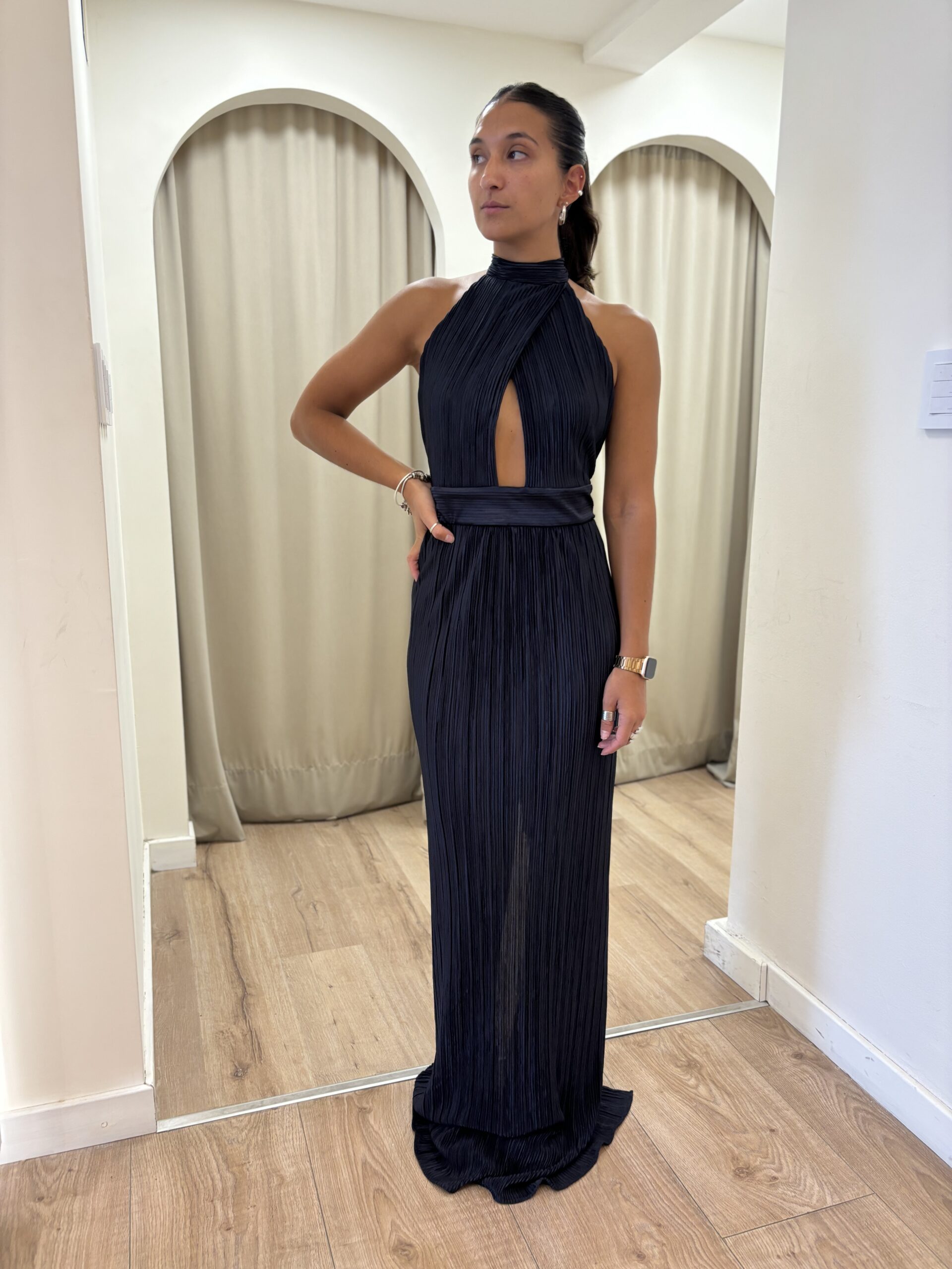 Vestido largo con cuello halter cruzado que genera un recorte y espalda descubierta con tiras que atan en el cuello. Cuenta con un tajo en la costura central posterior. Confeccionado con tela plisada.