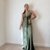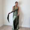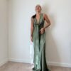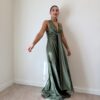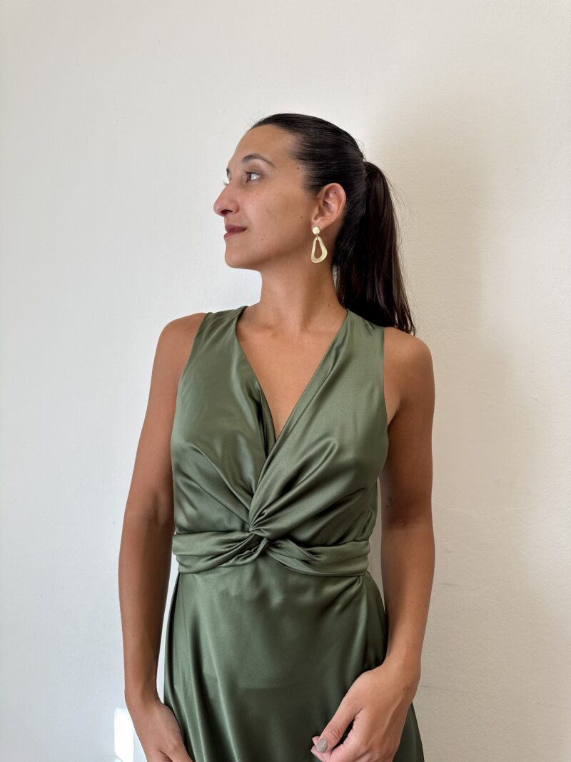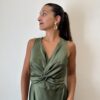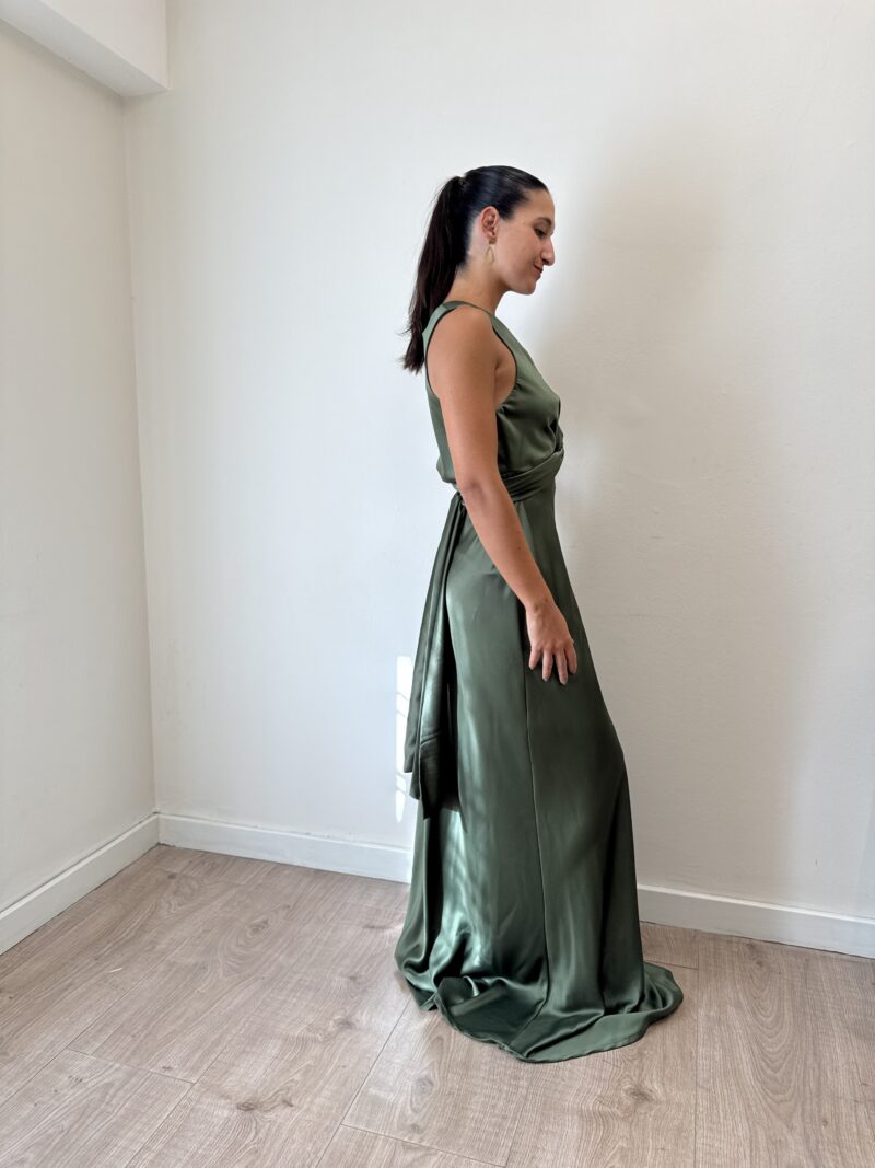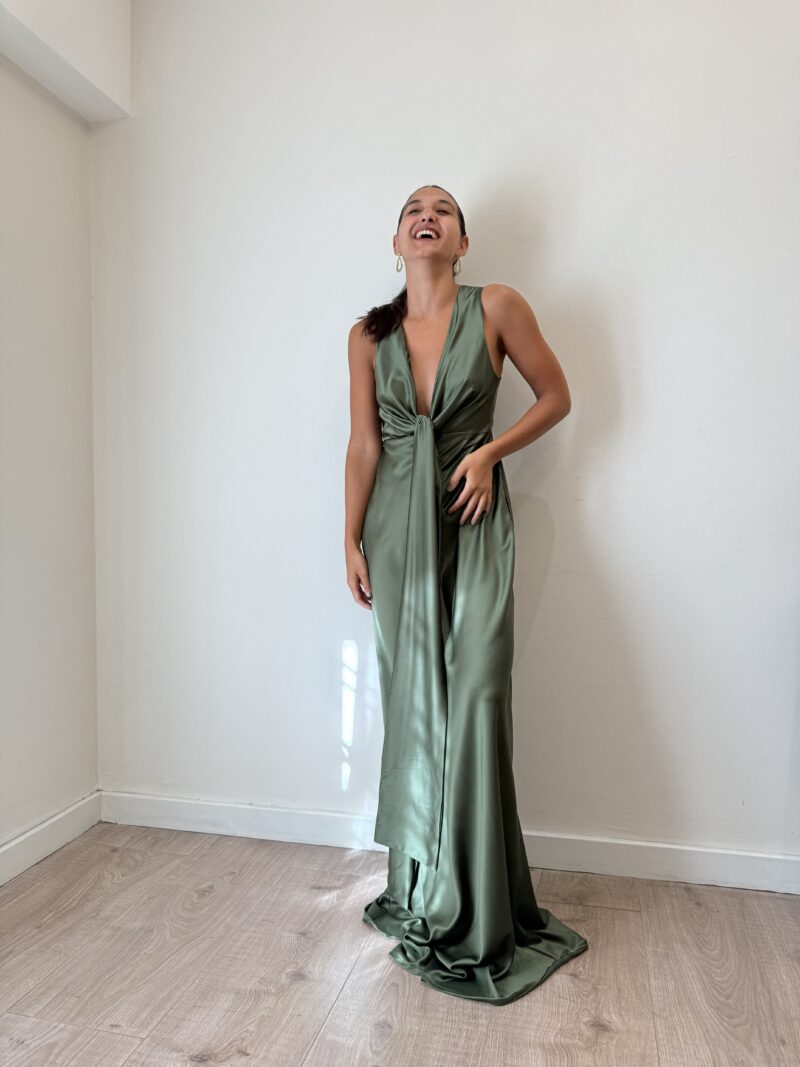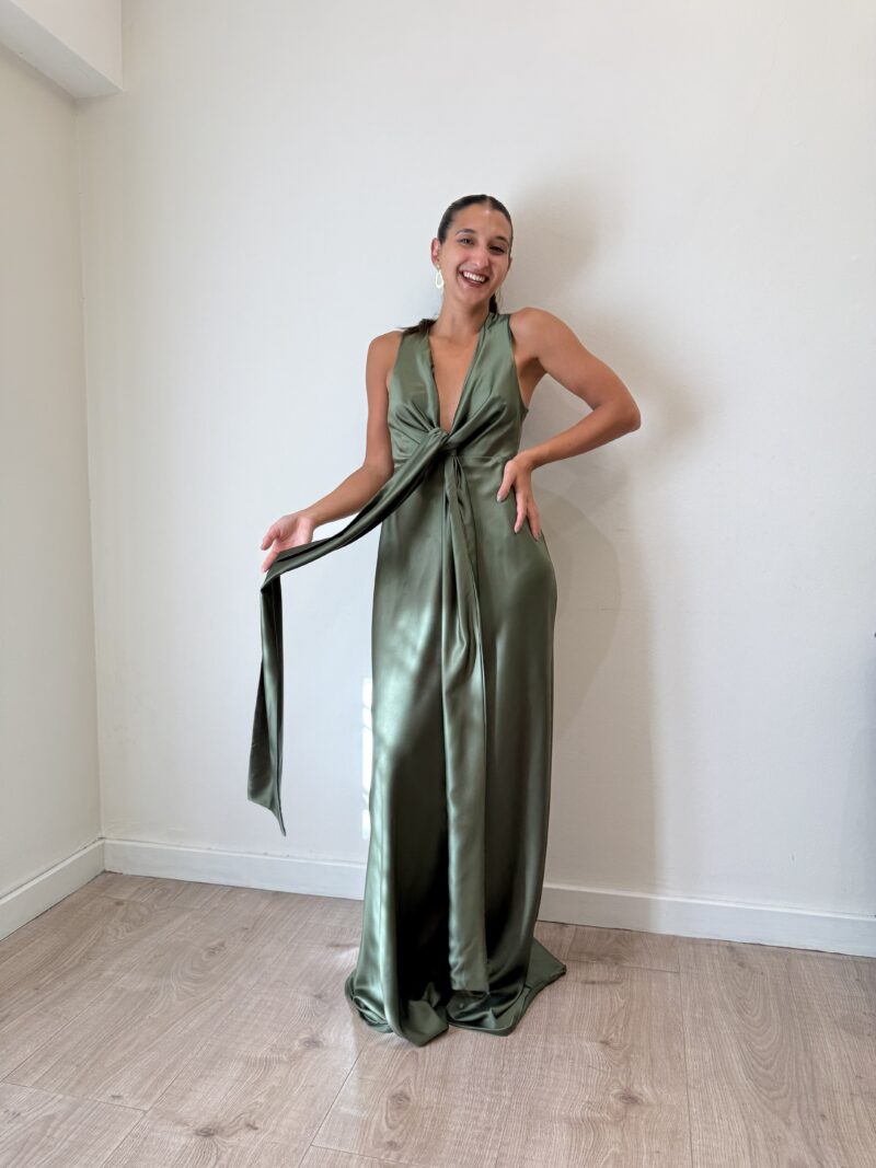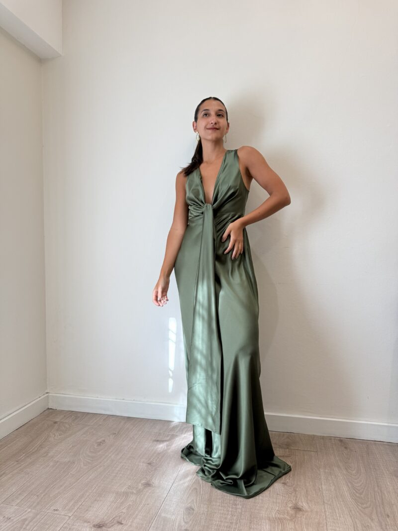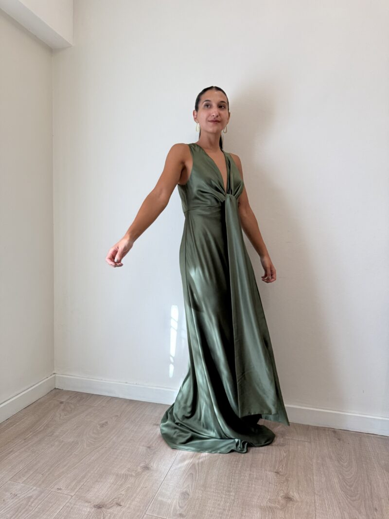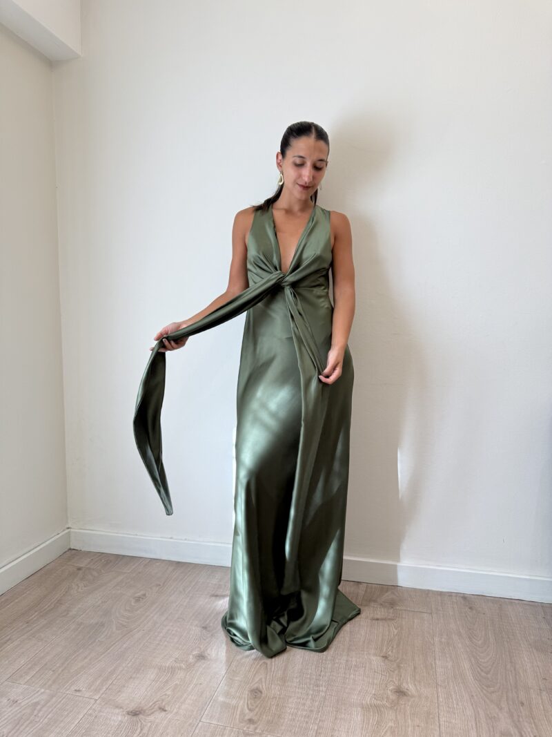 Vestido con escote en V profundo con el detalle de lazos que permiten al vestido ser versátil. La espalda está cubierta.