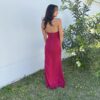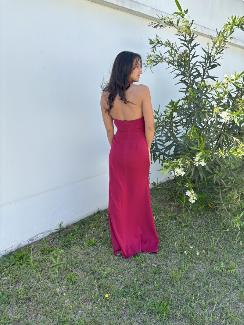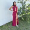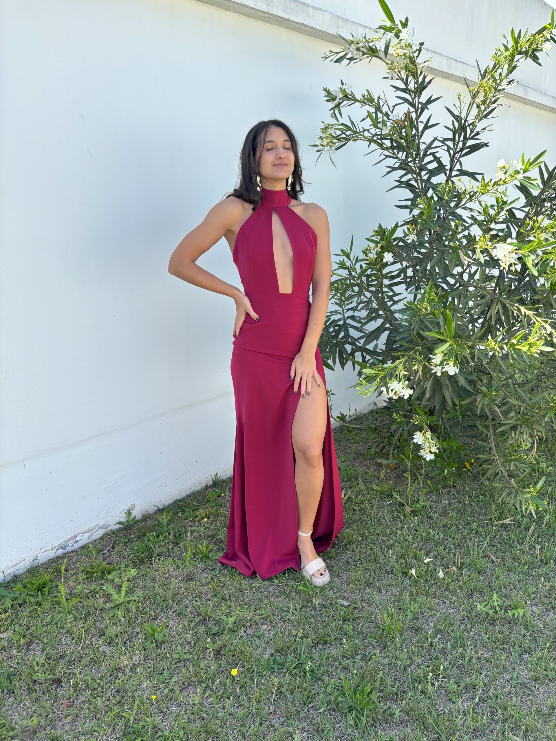 Vestido largo con cuello halter con recorte central y espalda cerrada. Falda semi sirena con tajo adelante. Confeccionado con tela sastrera.