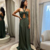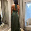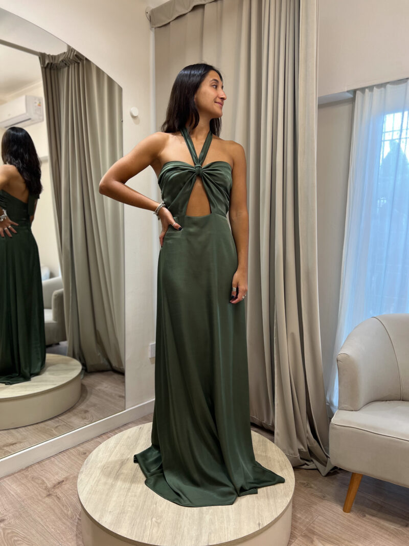 Vestido largo confeccionado en creppe de seda. Recorte en abdomen con tiras para atar en el cuello. Cierre invisible en costura central de espalda.