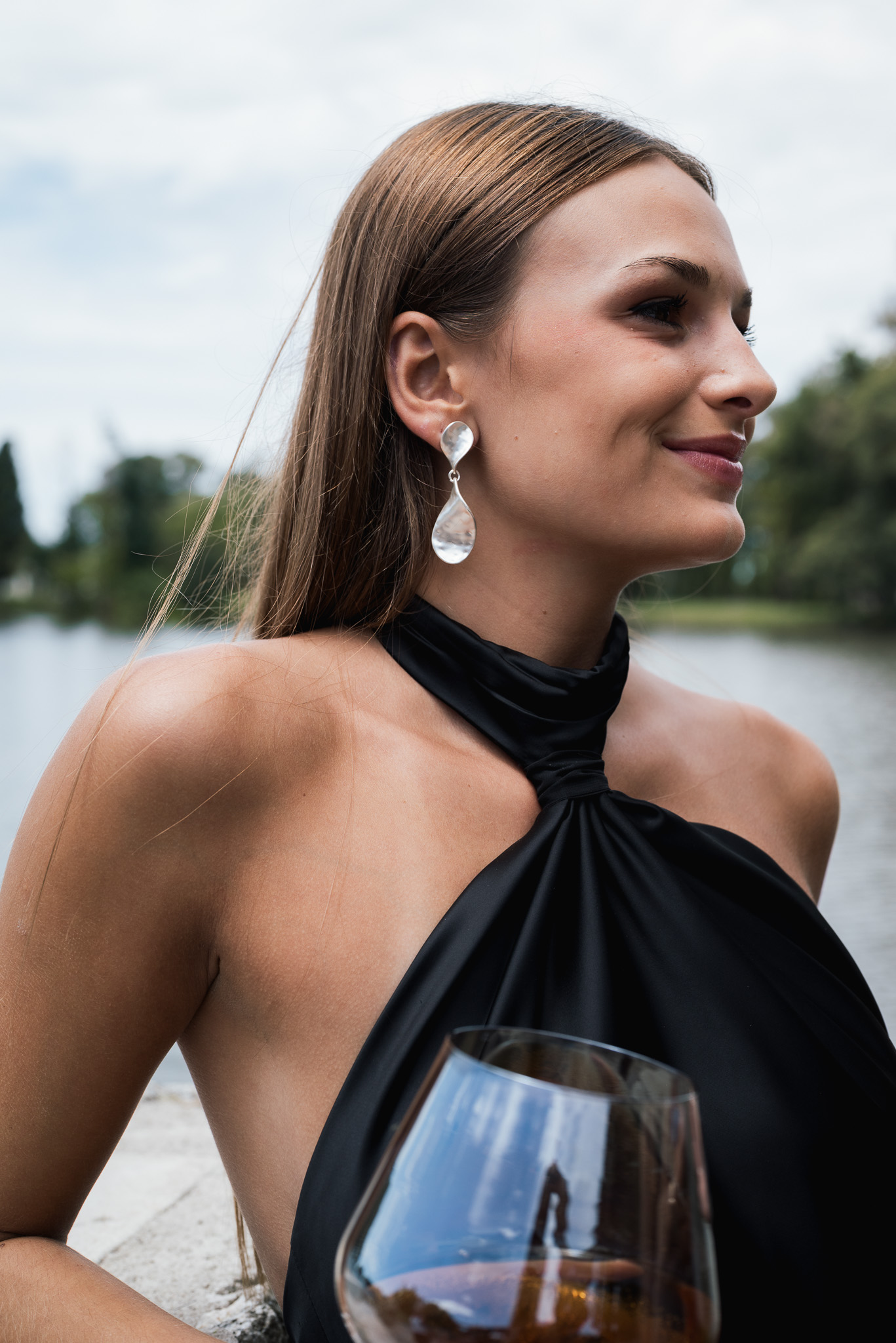 Vestido cuello halter, con drapeado en el cuello. Descubierto a media espalda.