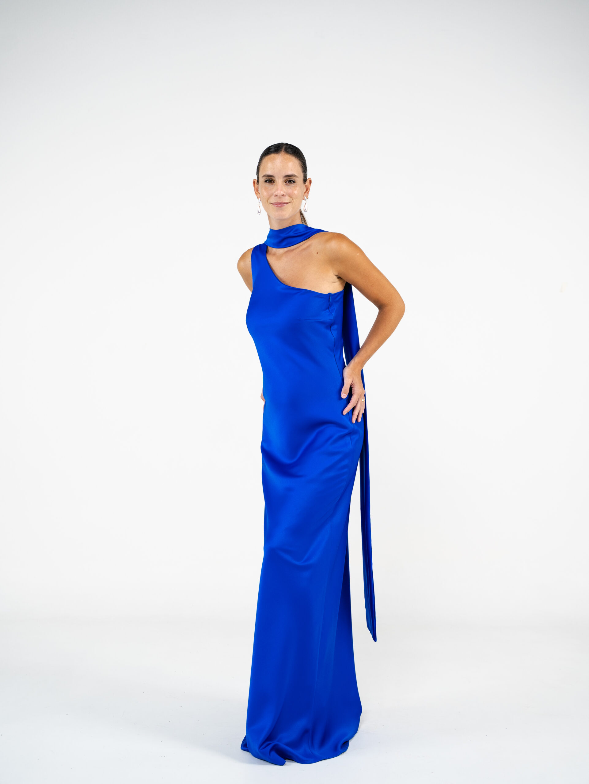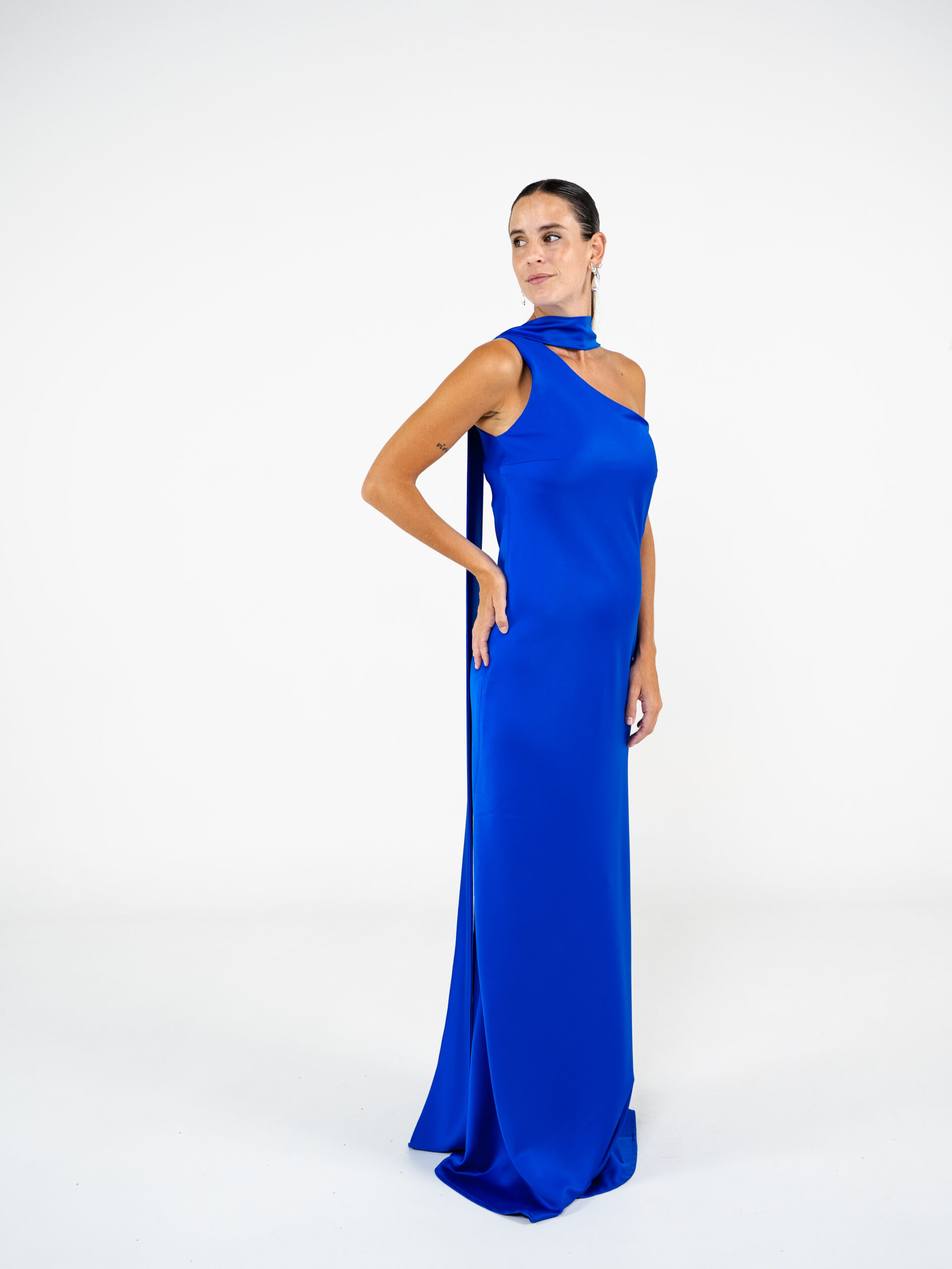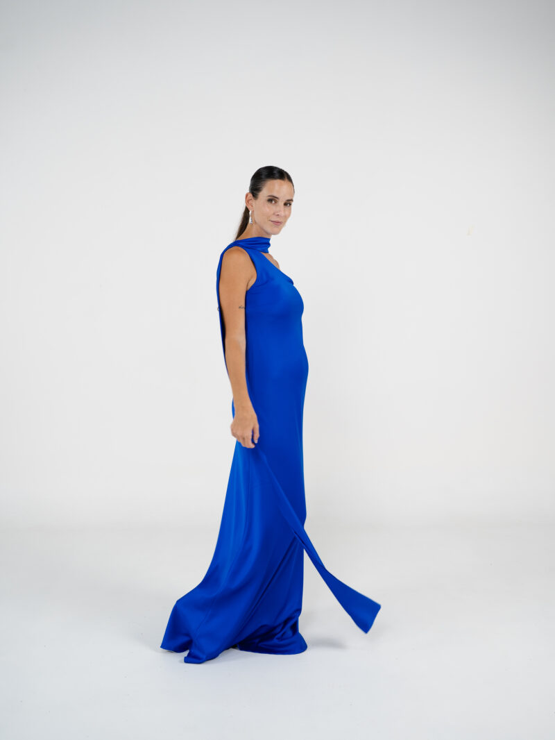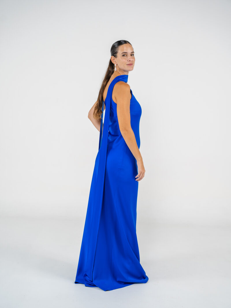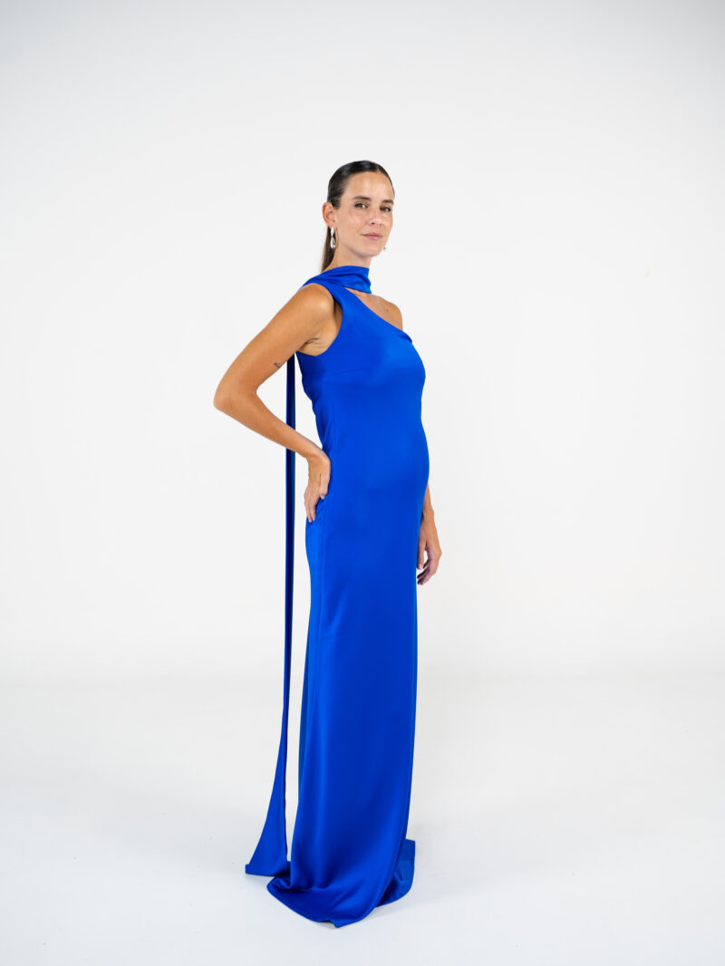 Vestido confeccionado en creppe de seda al bies y escote a un hombro. Tiene lazo para el cuello.