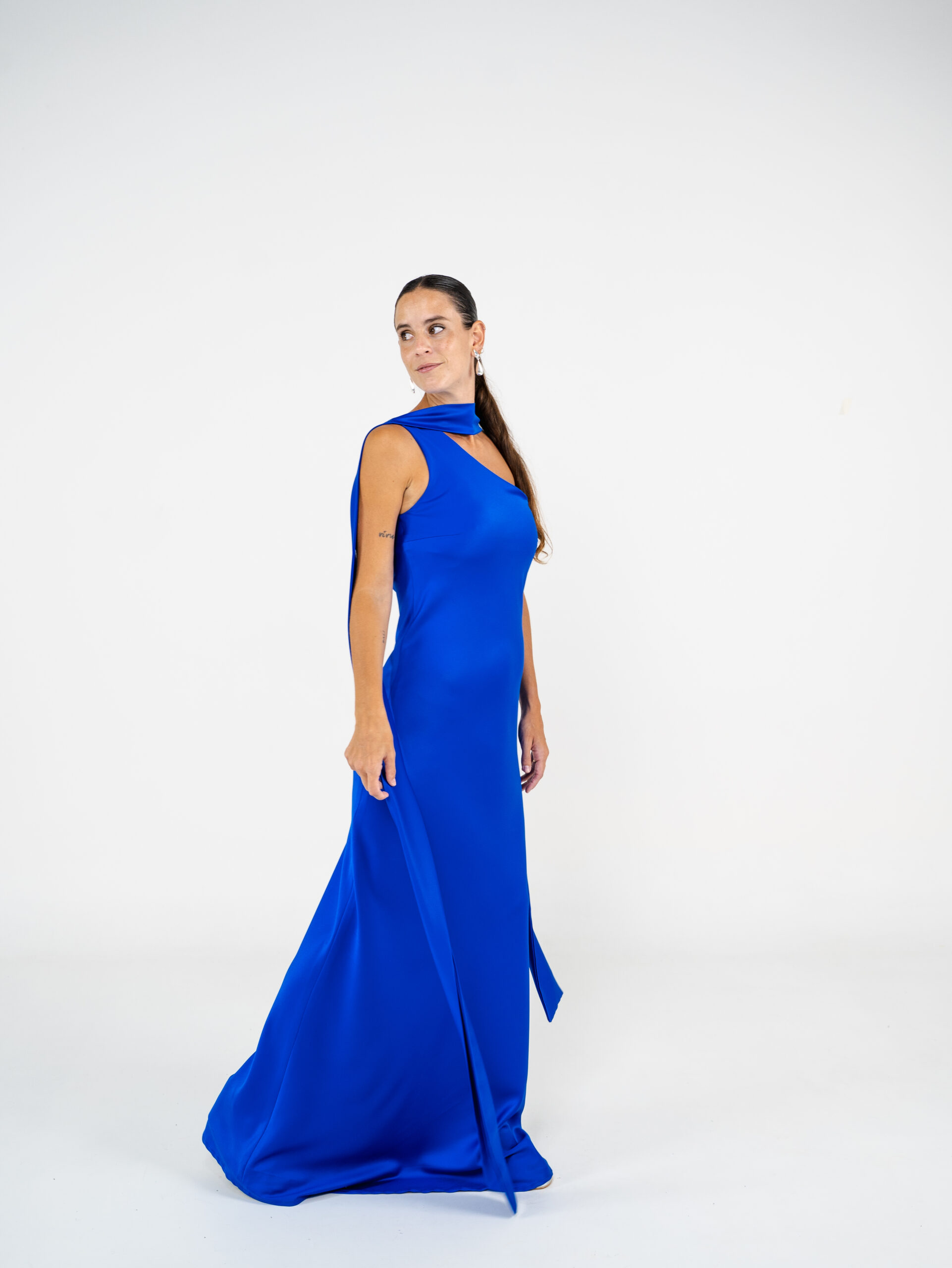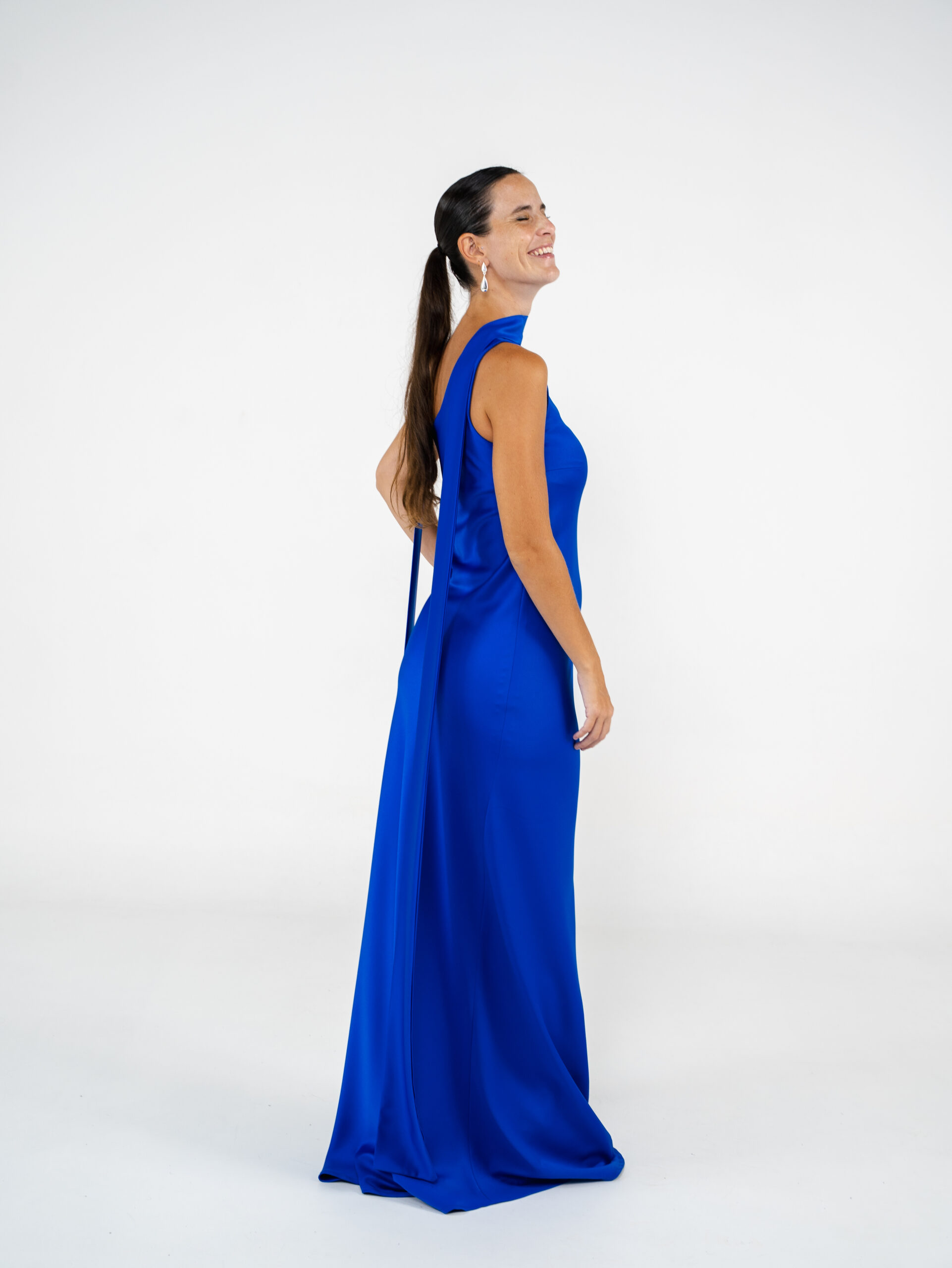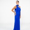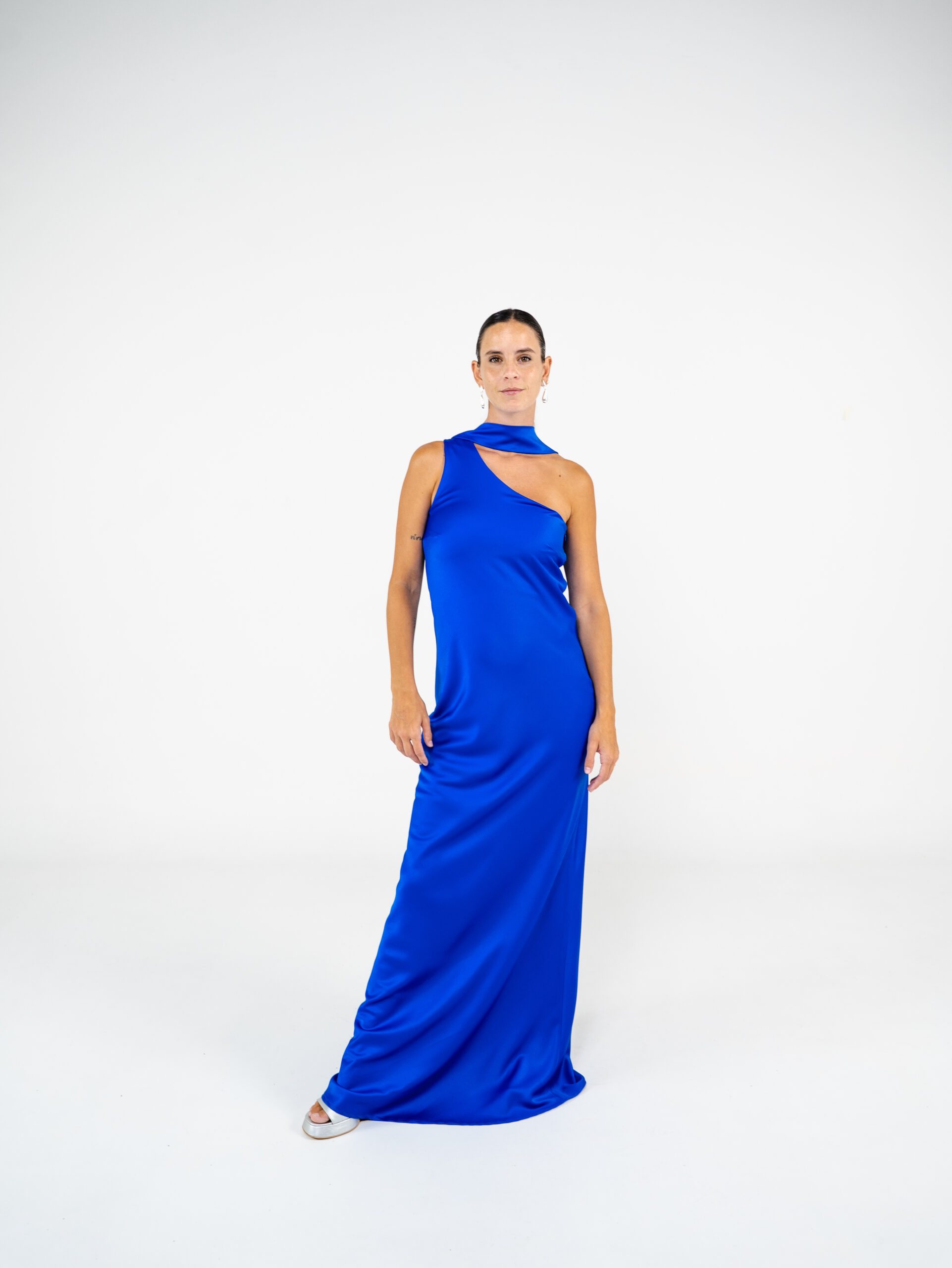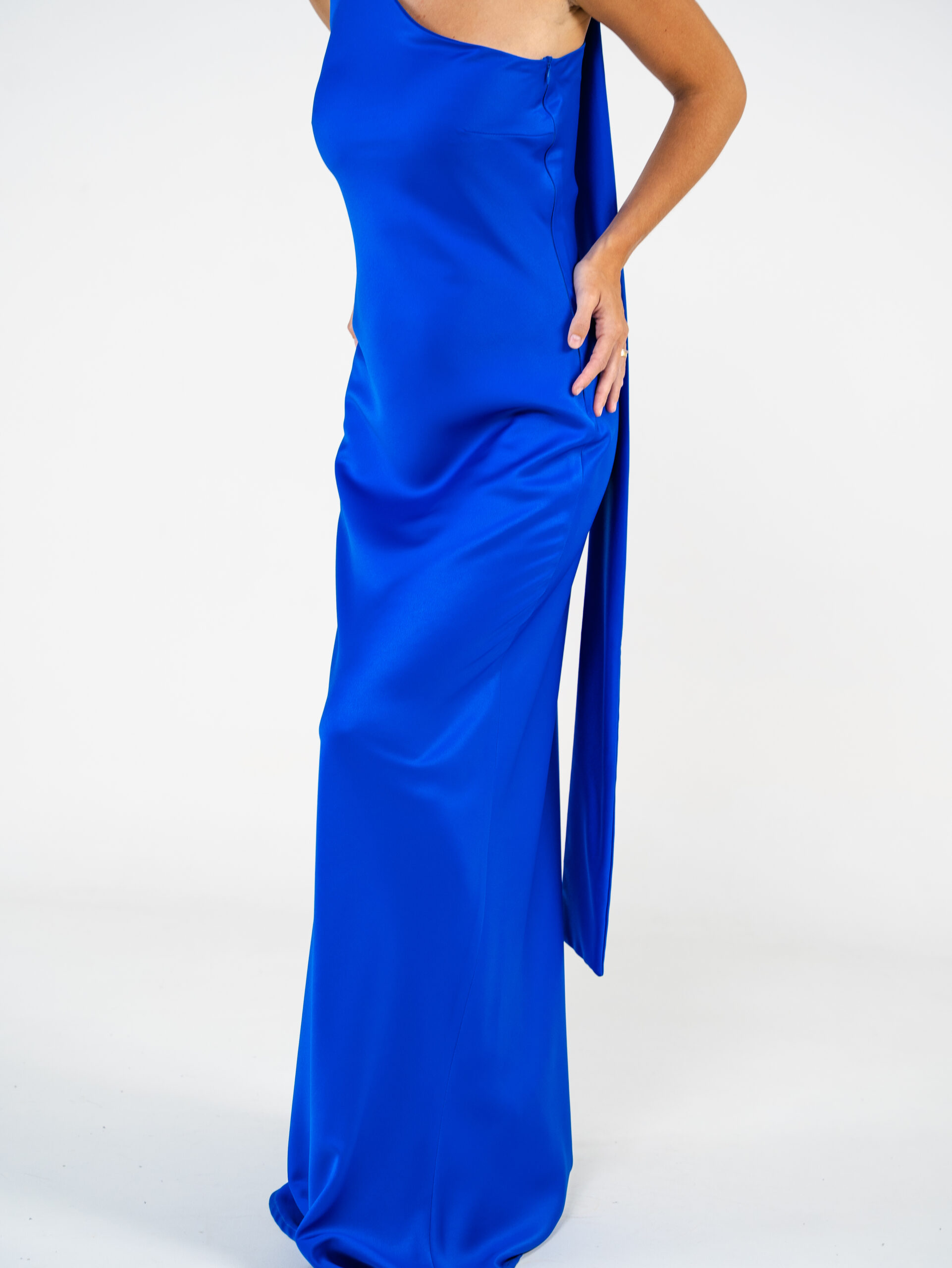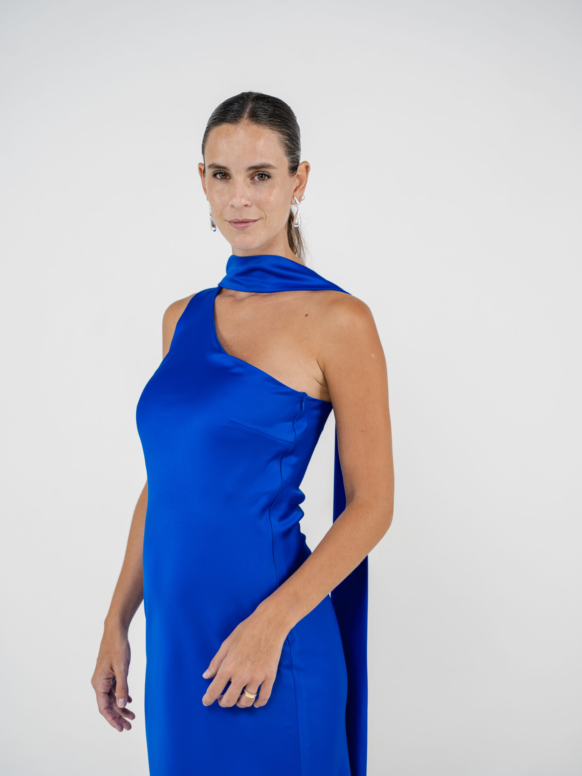 Vestido confeccionado en creppe de seda al bies y escote a un hombro. Tiene lazo para el cuello.