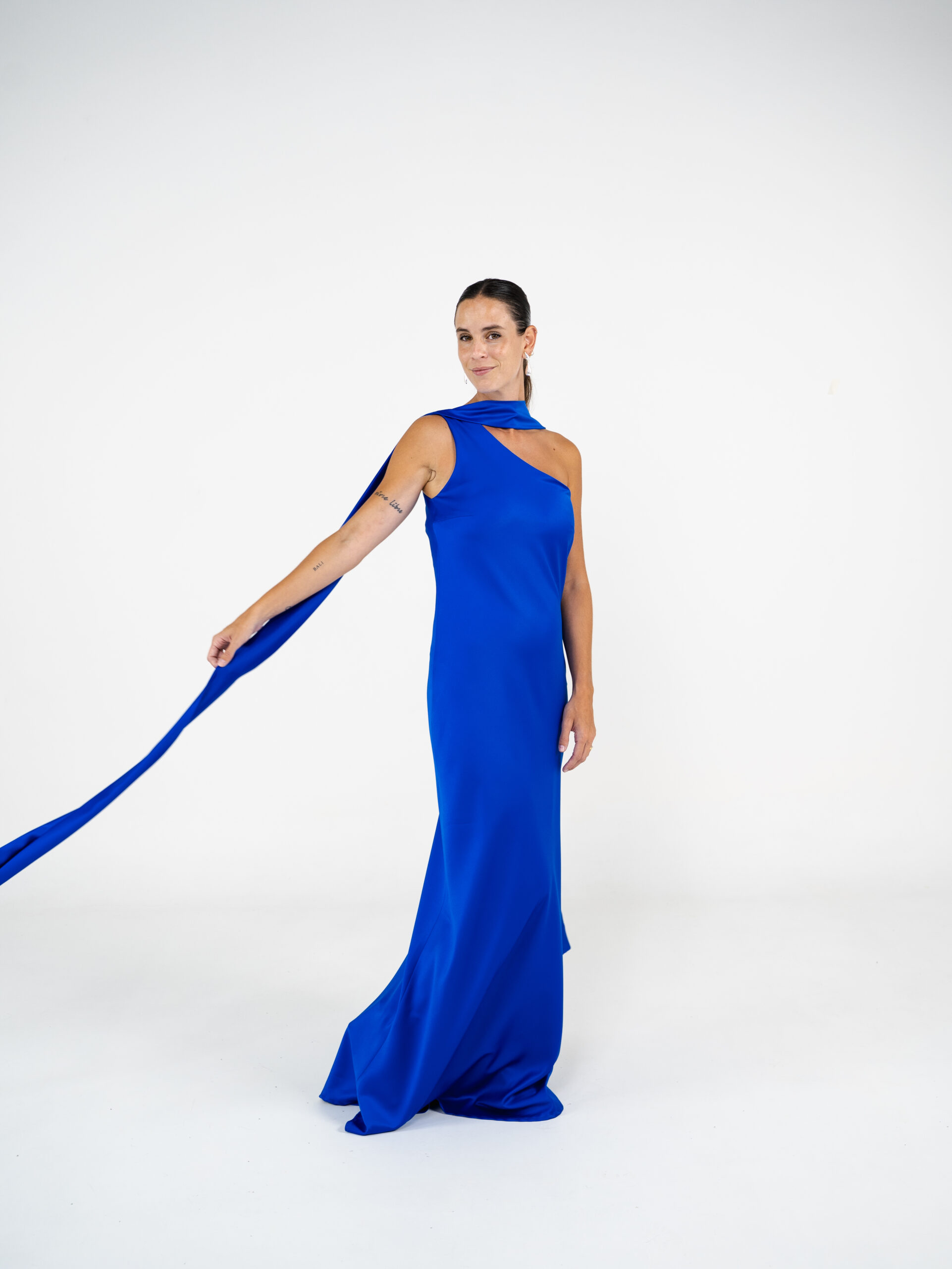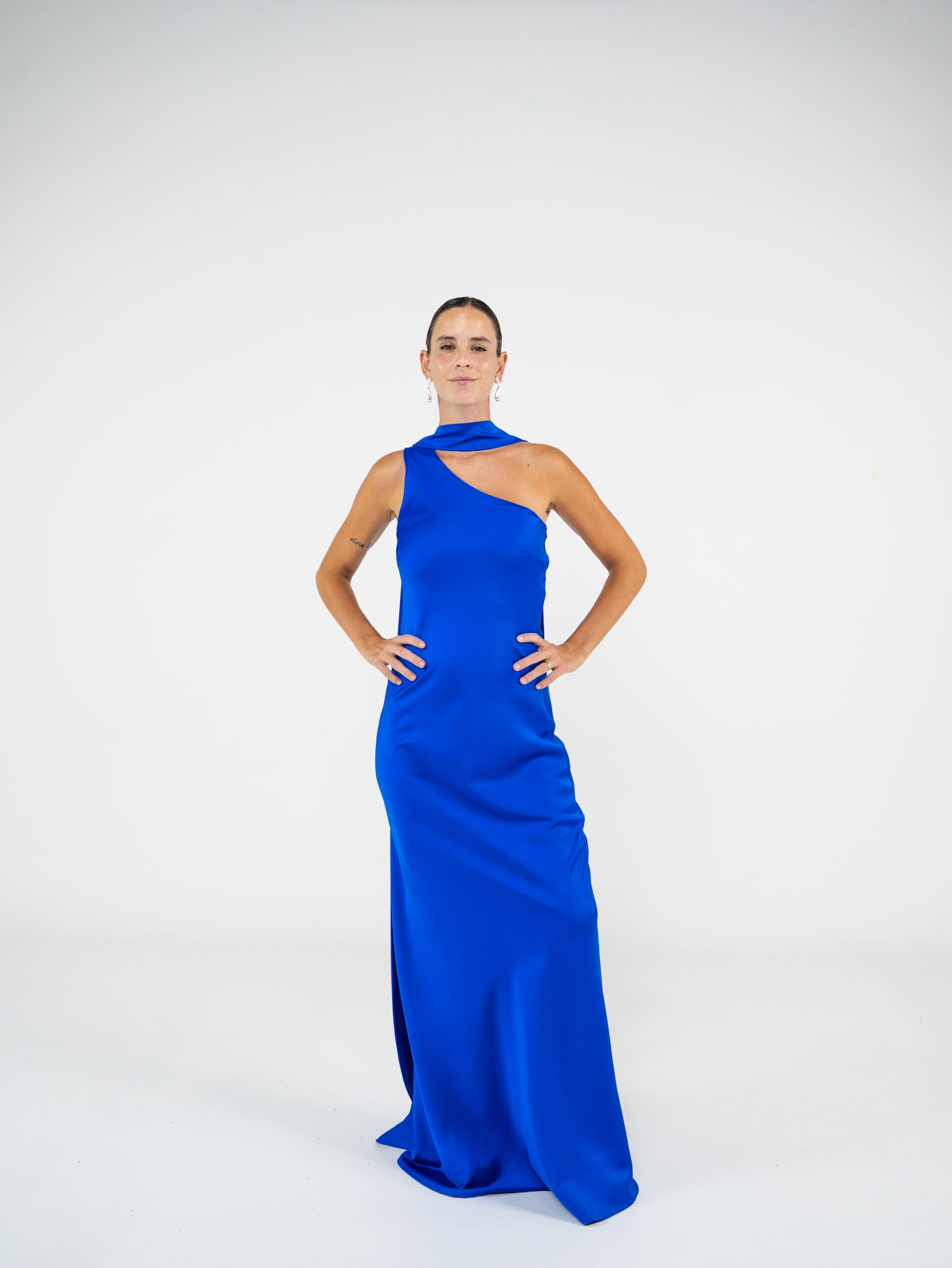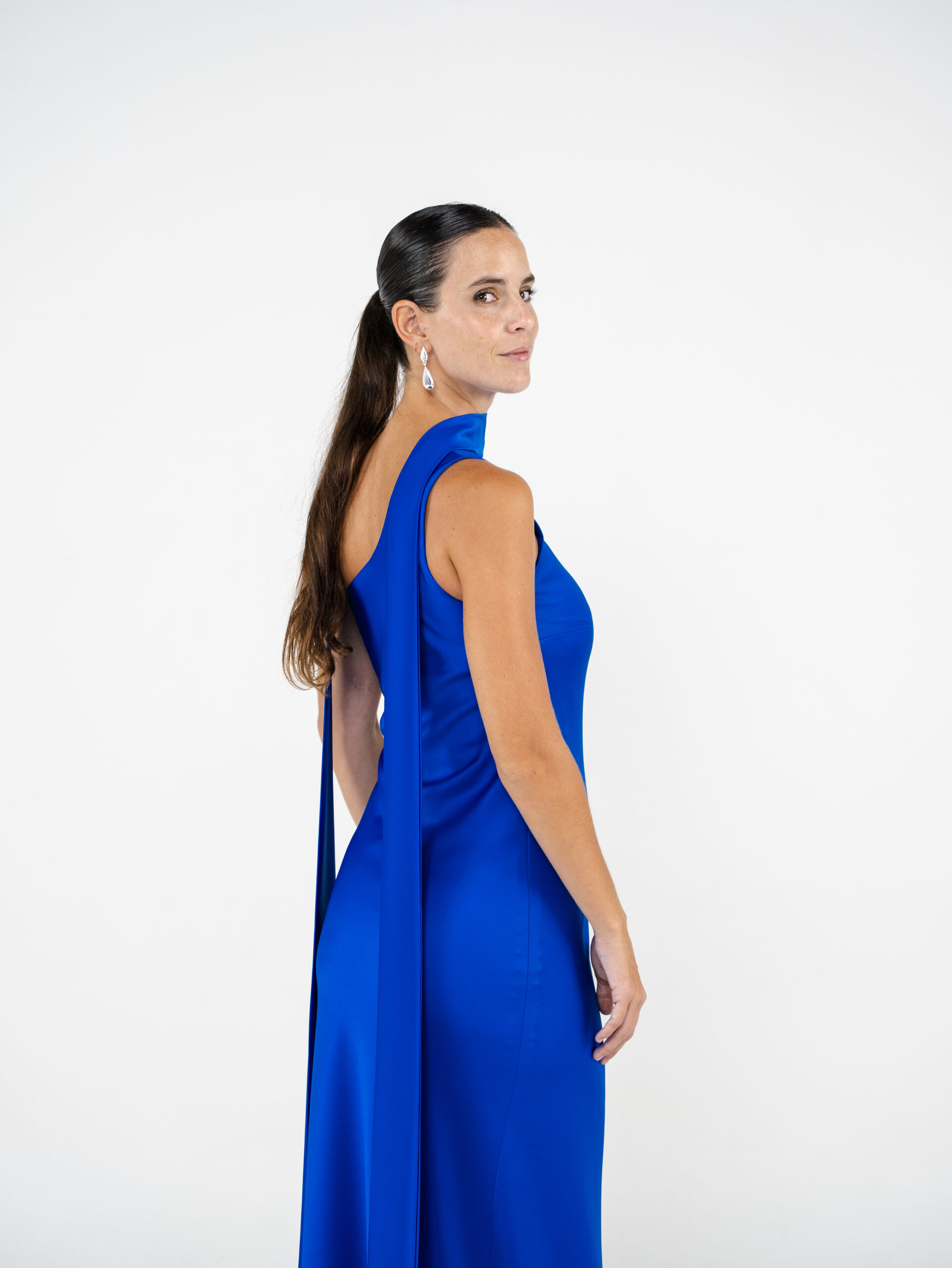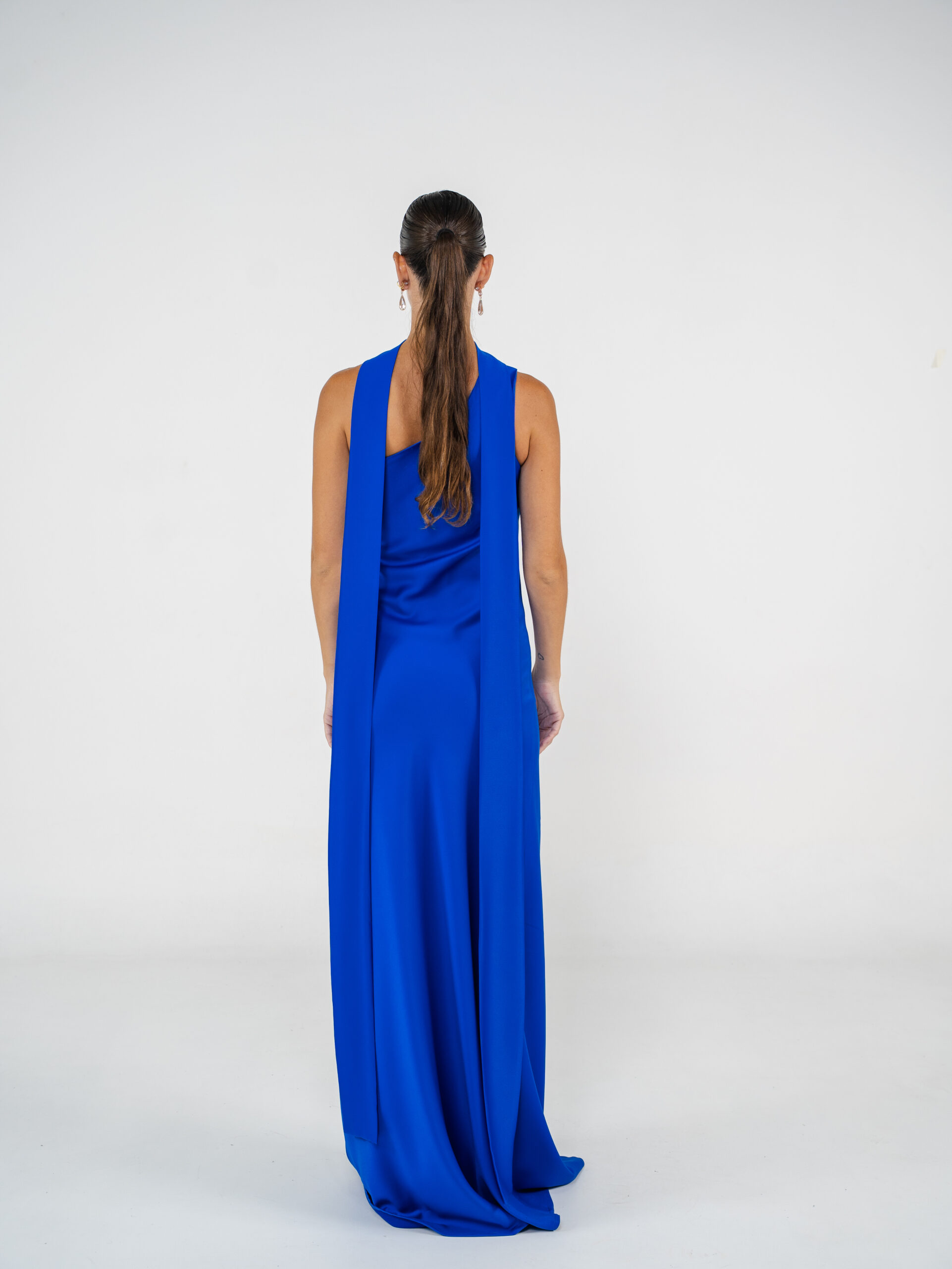 Vestido confeccionado en creppe de seda al bies y escote a un hombro. Tiene lazo para el cuello.