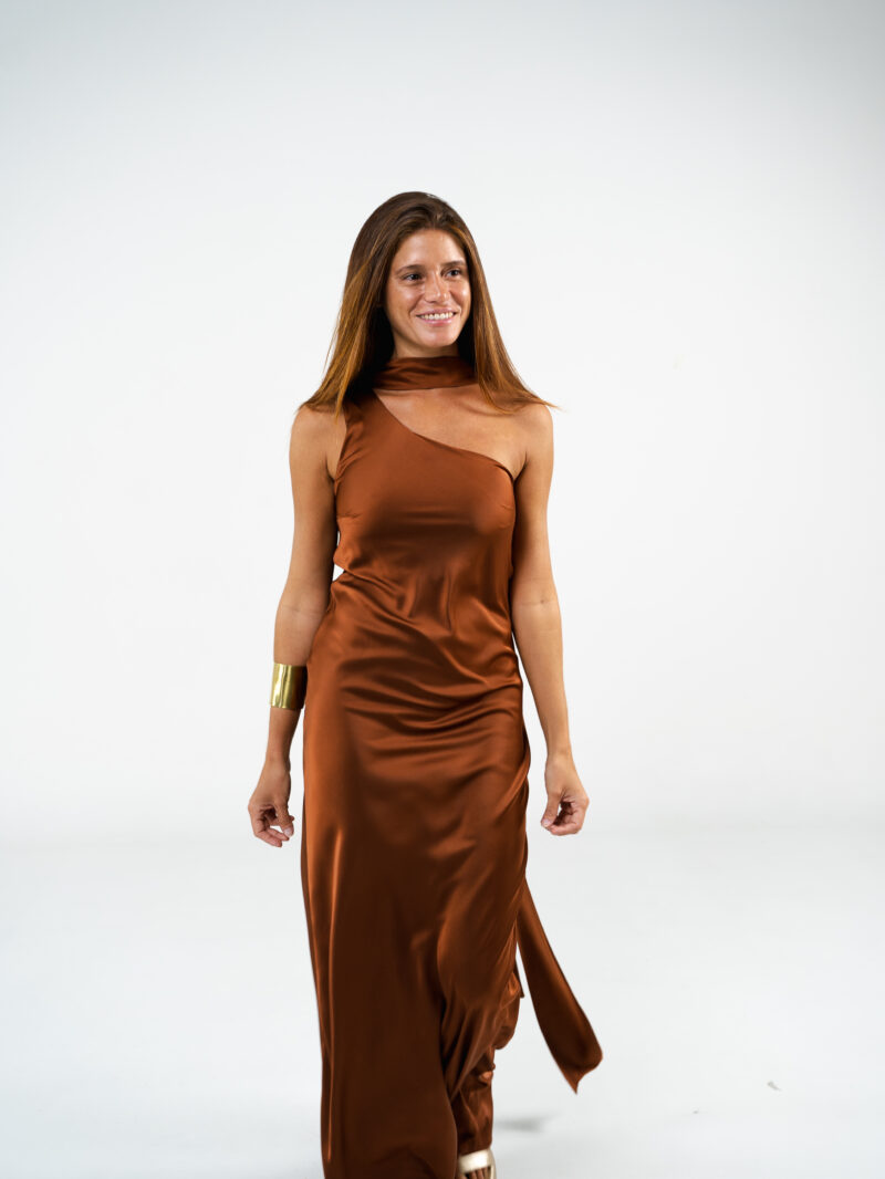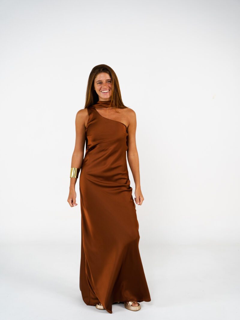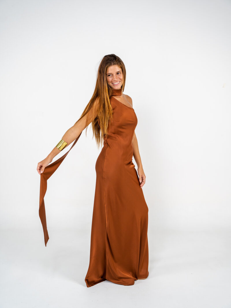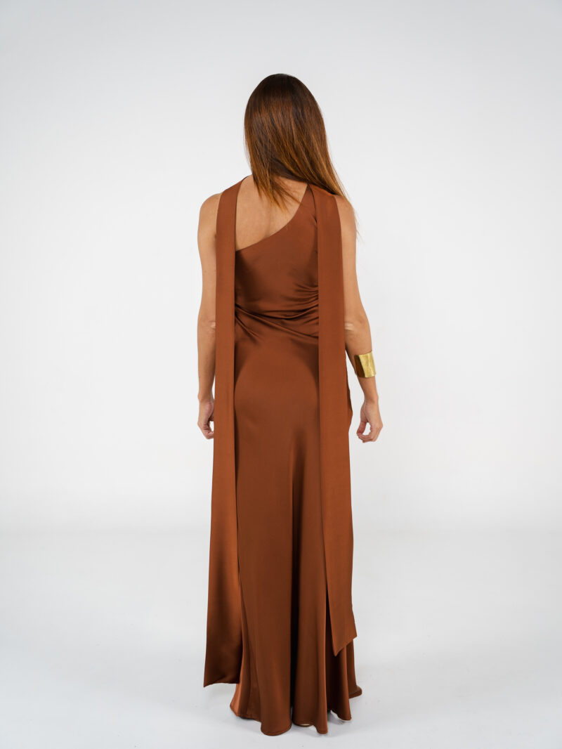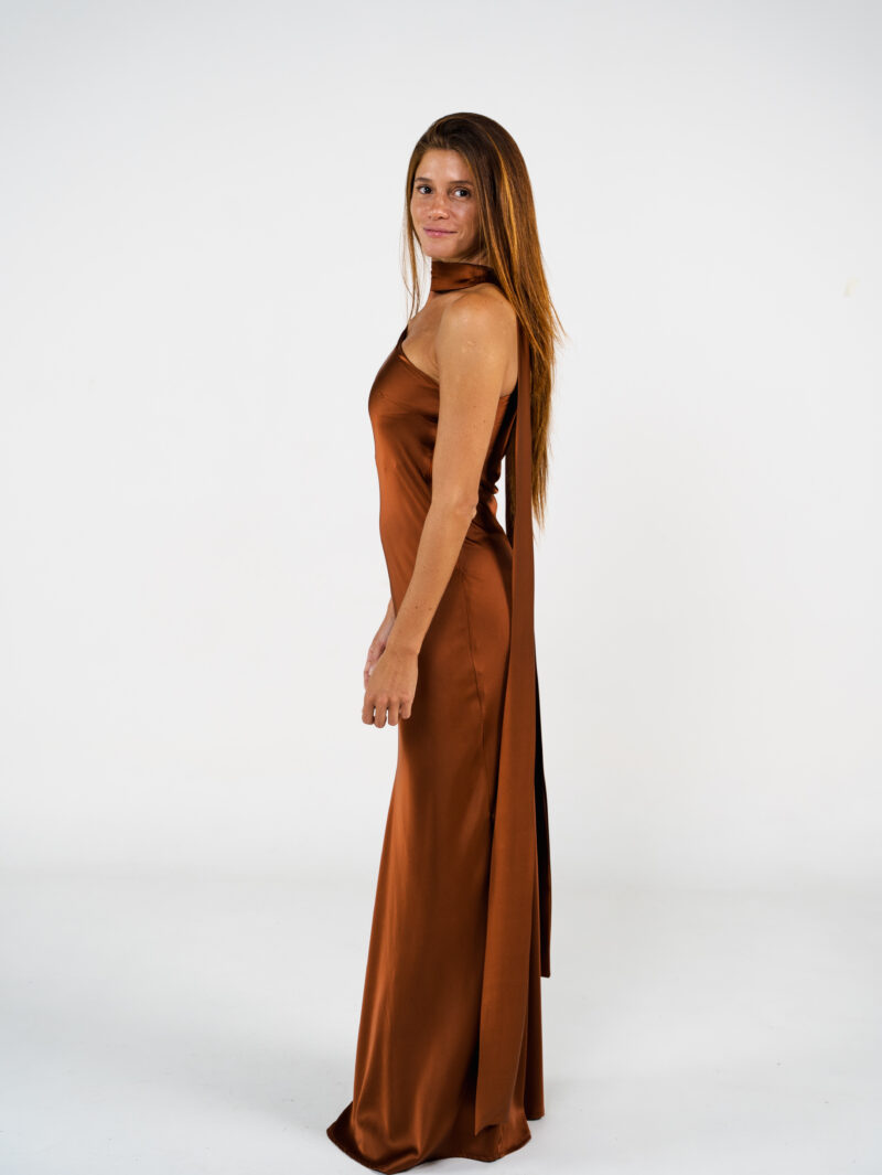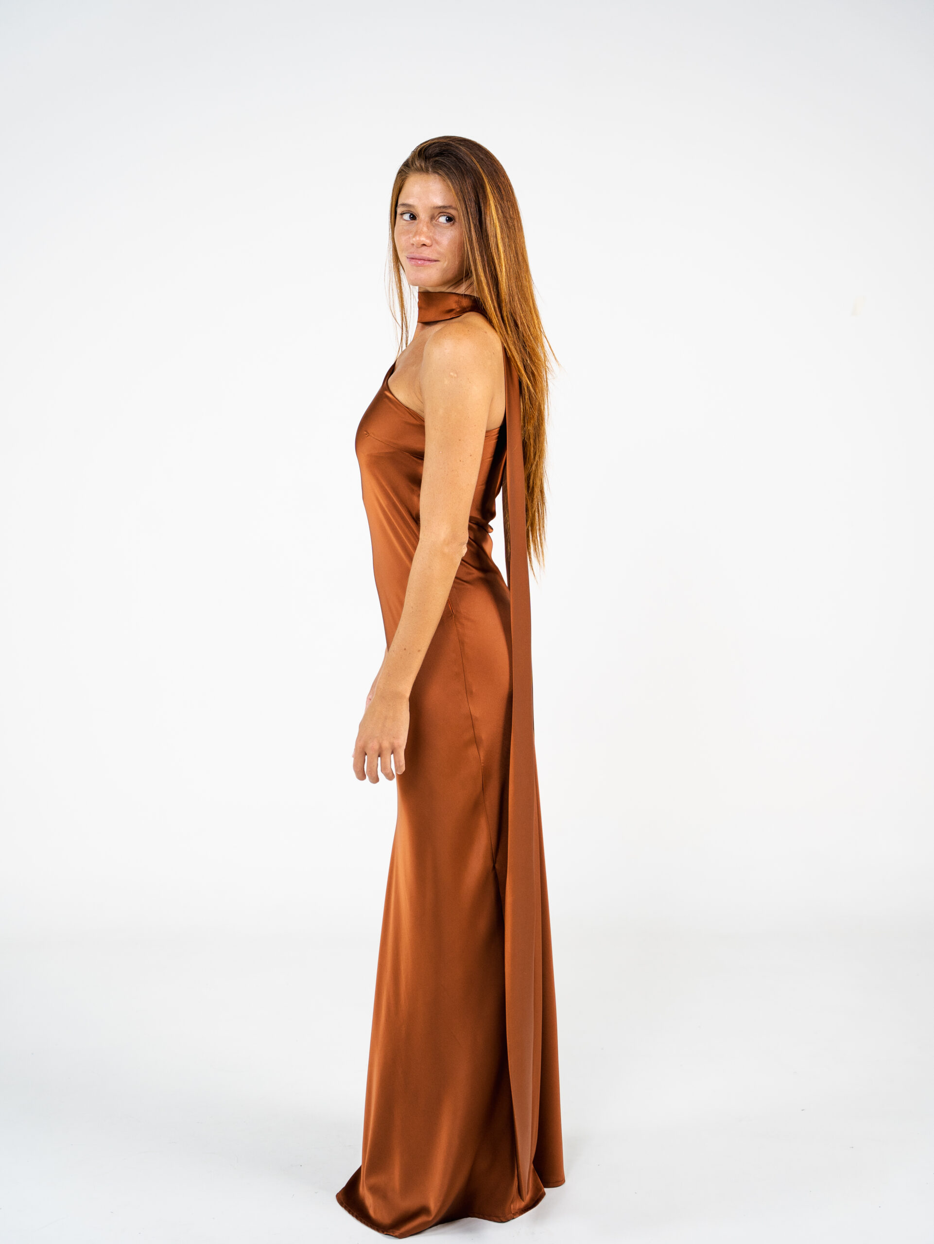 Vestido confeccionado en creppe de seda al bies y escote a un hombro. Tiene lazo para el cuello.