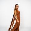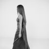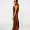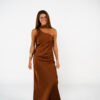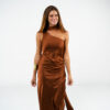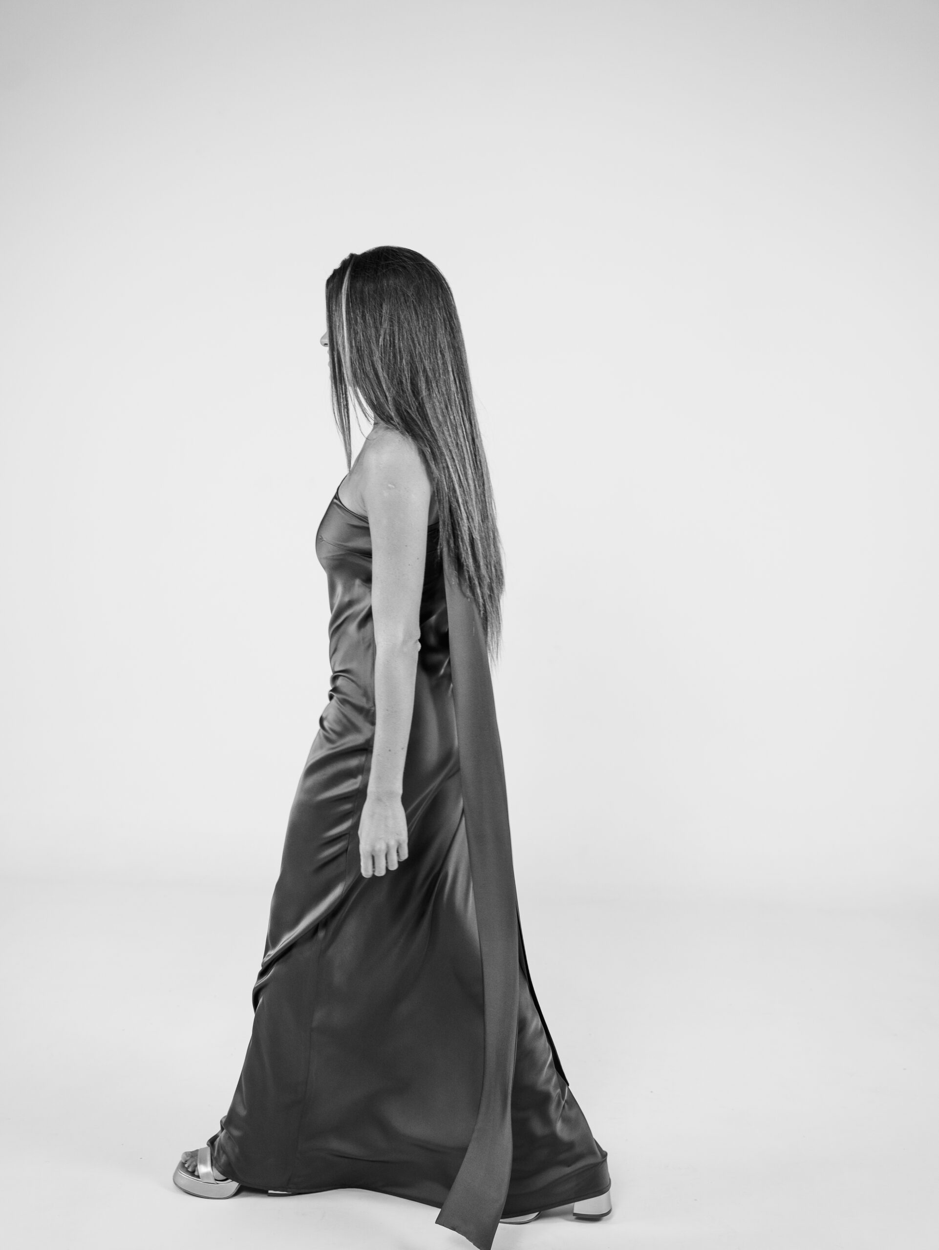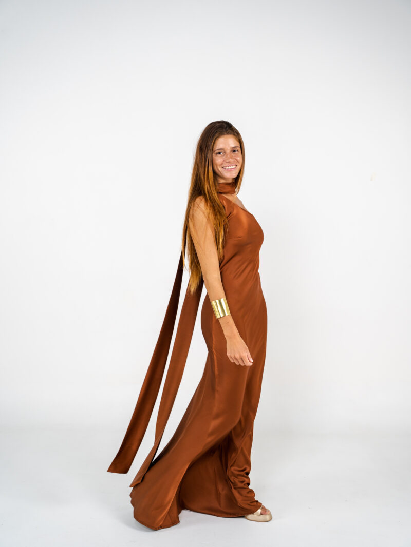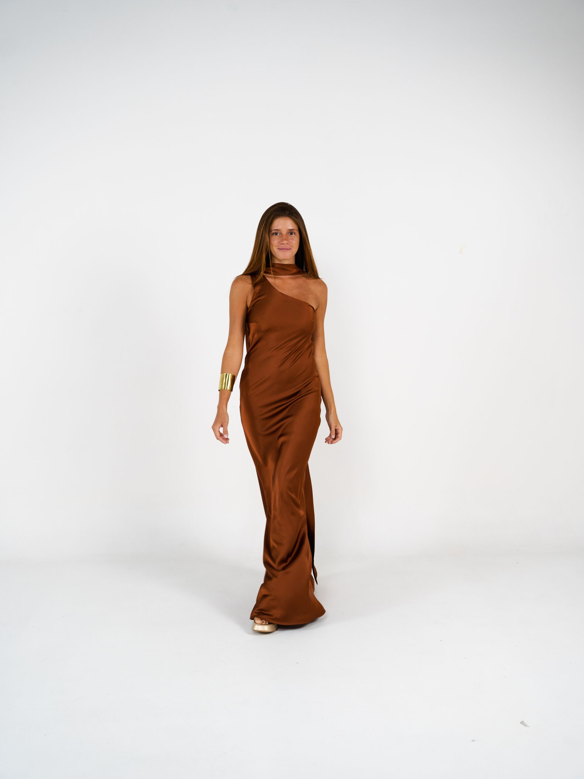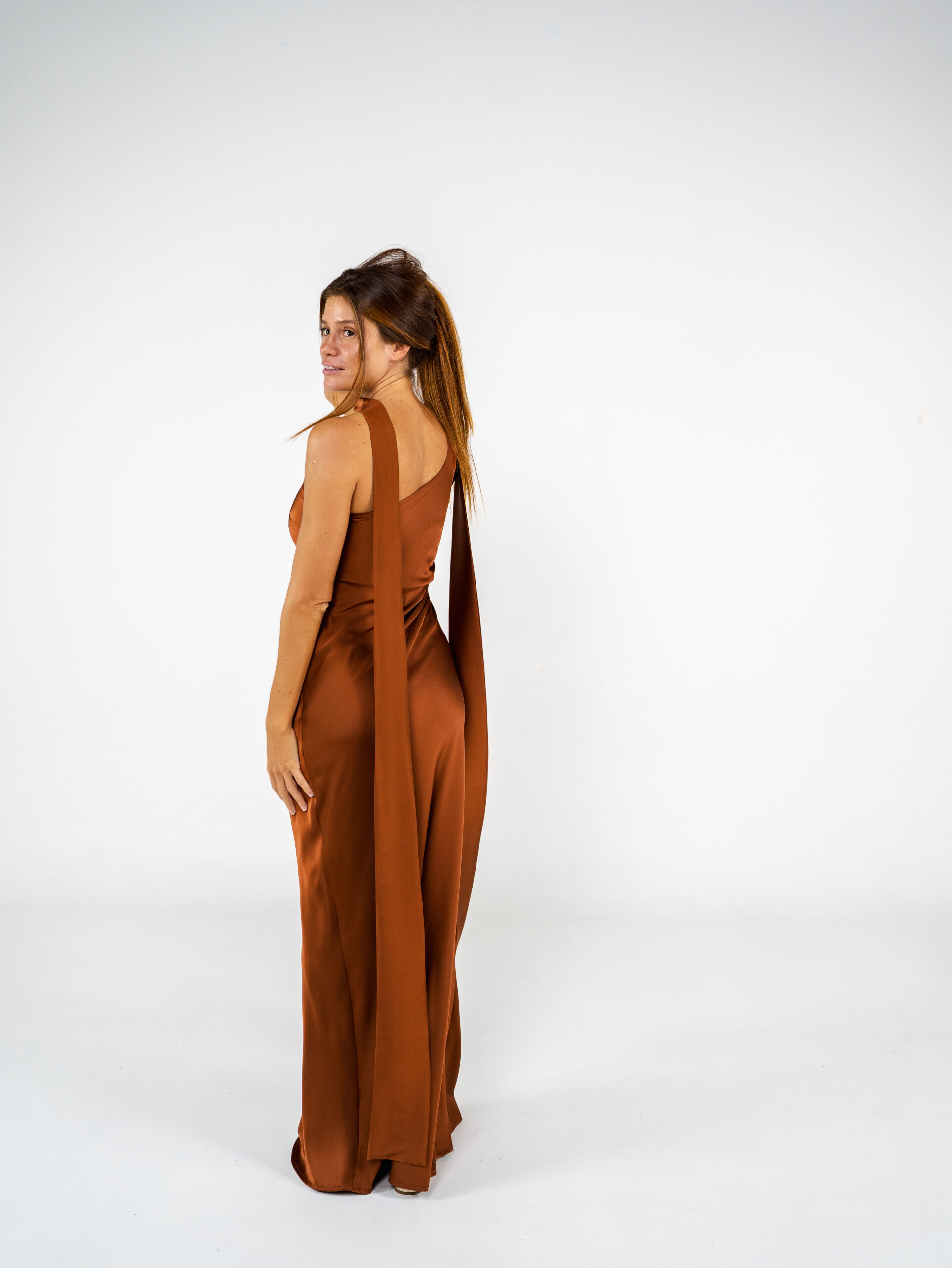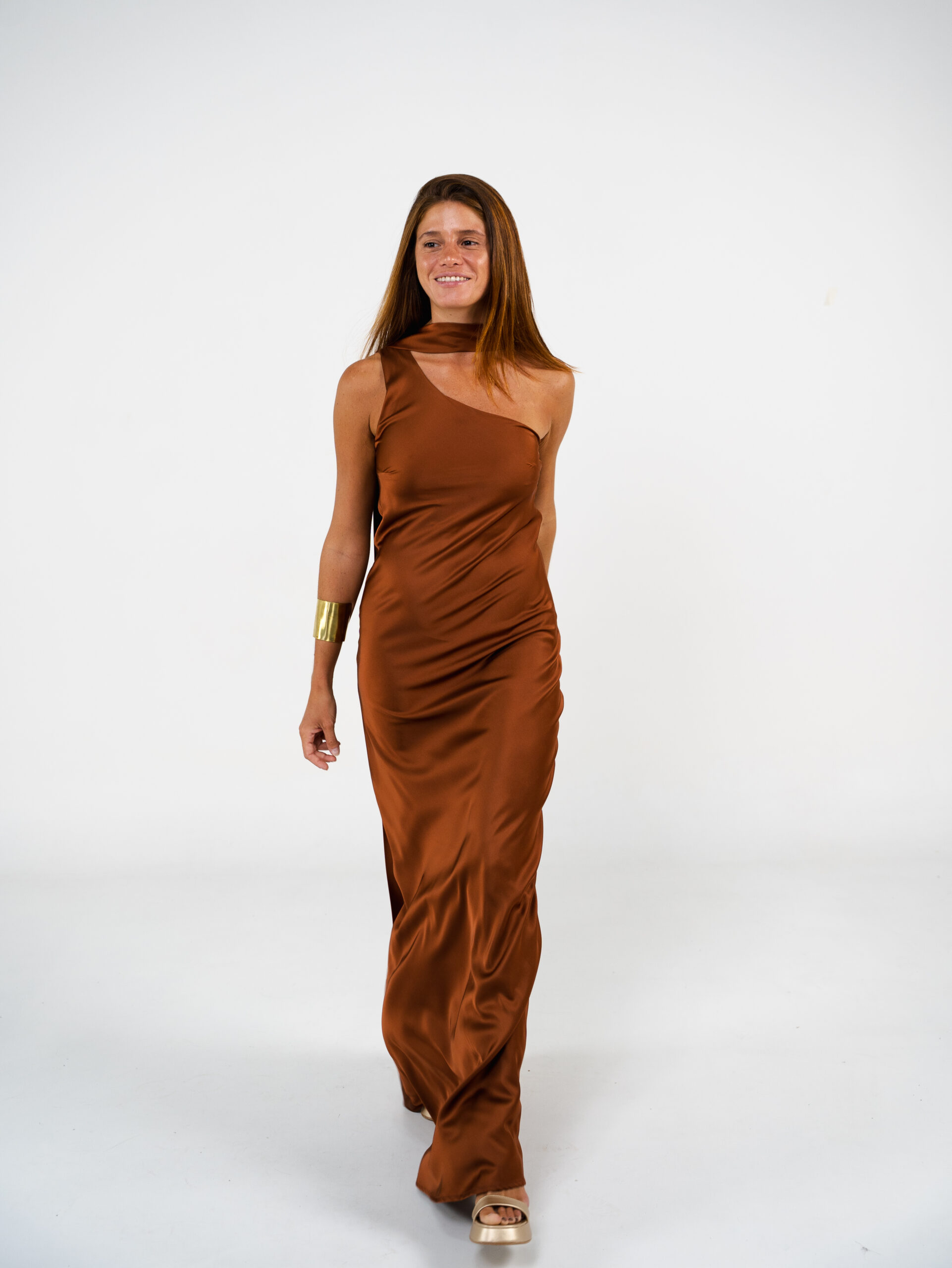 Vestido confeccionado en creppe de seda al bies y escote a un hombro. Tiene lazo para el cuello.