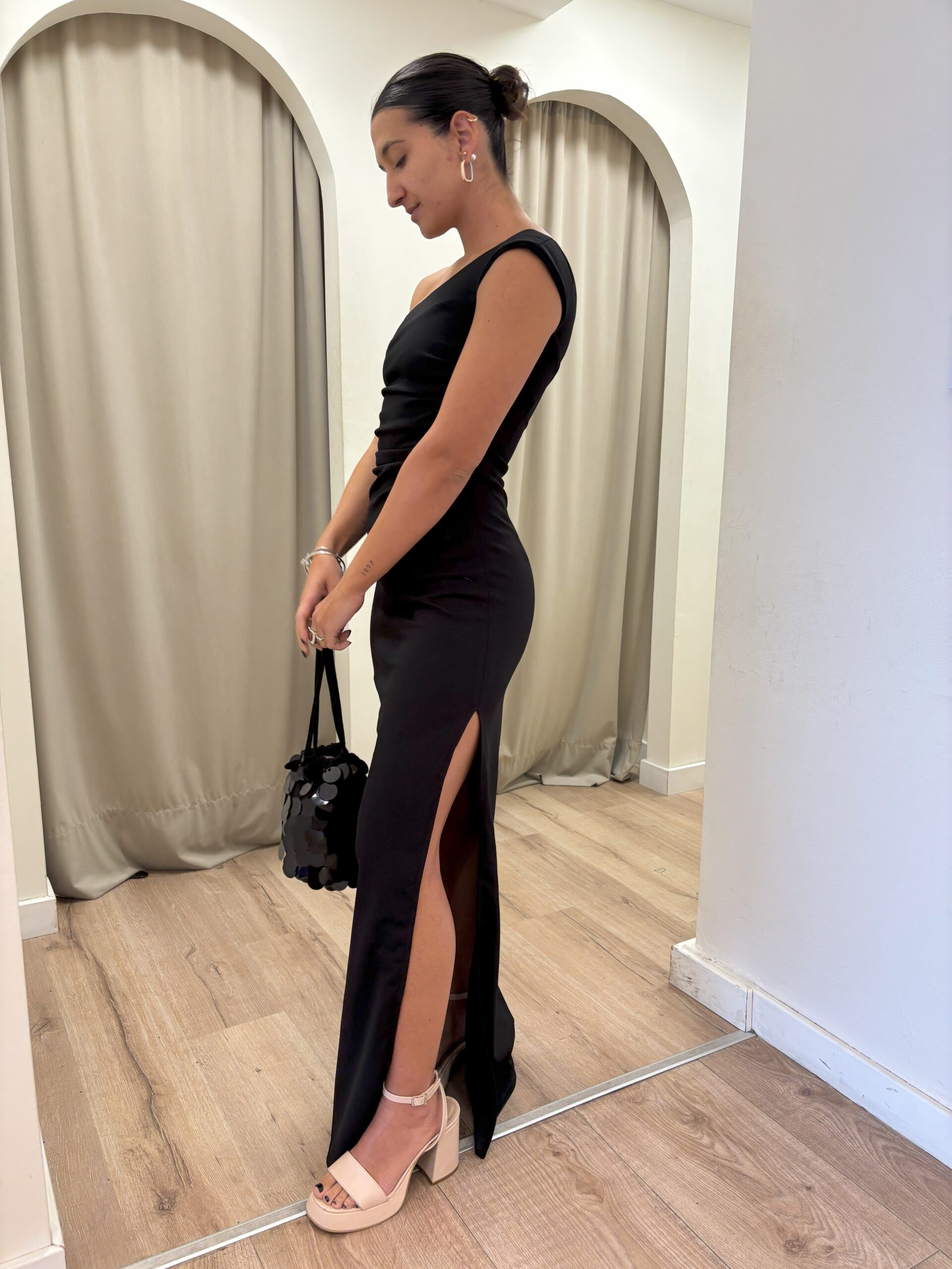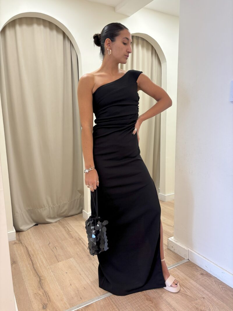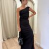 Vestido largo escote a un hombro con drapeado a la  altura de la cintura y pollera semi sirena con tajo lateral.