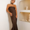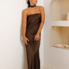 Vestido confeccionado en creppe de seda al bies y strapples. Tiene una espalda sexy que es acompañada por un buche. Cierre regulable.
