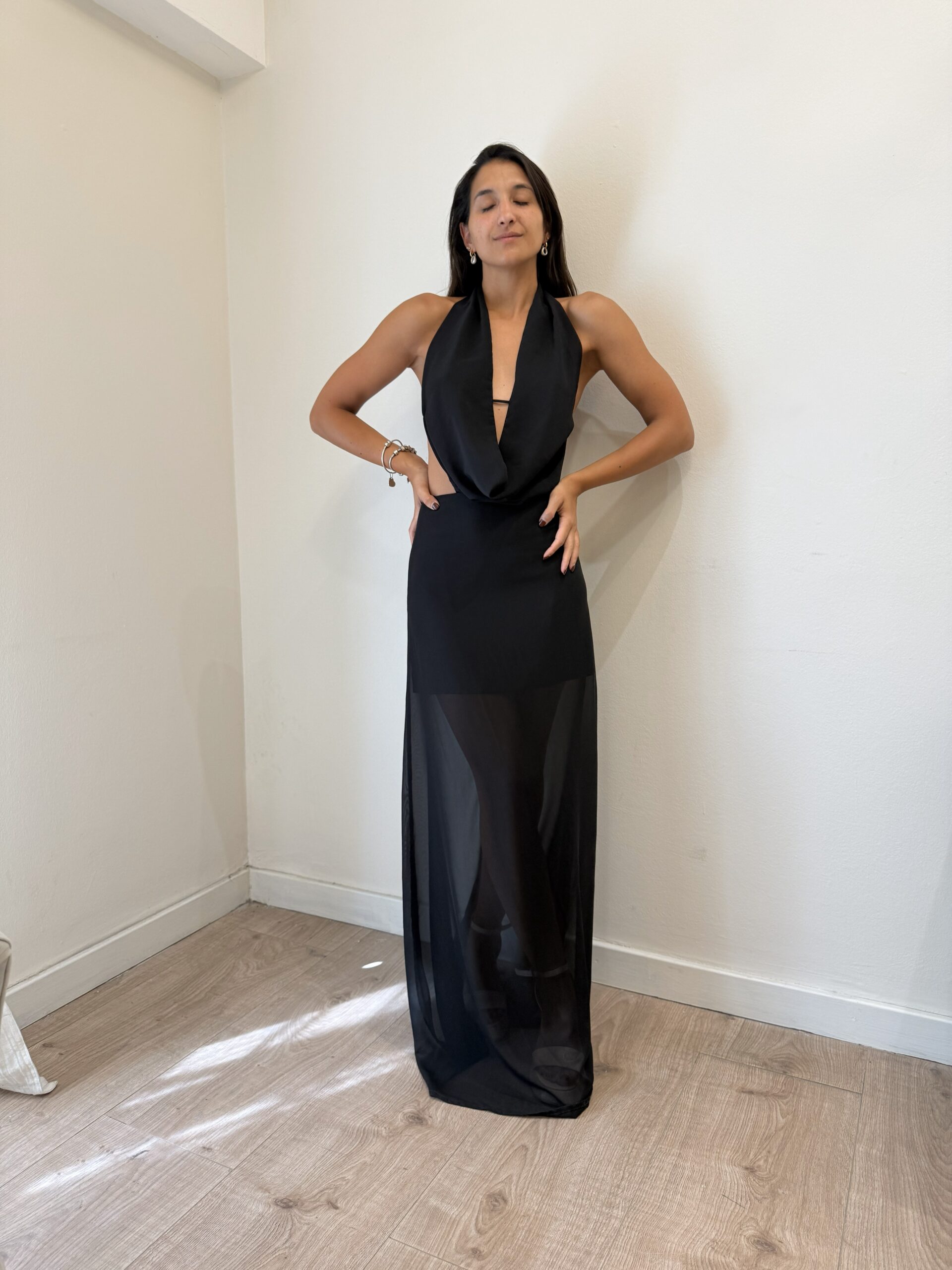 Vestido con escute pronunciado en buche, falda larga sin tajo. Tiene una espalda que lo hace único.