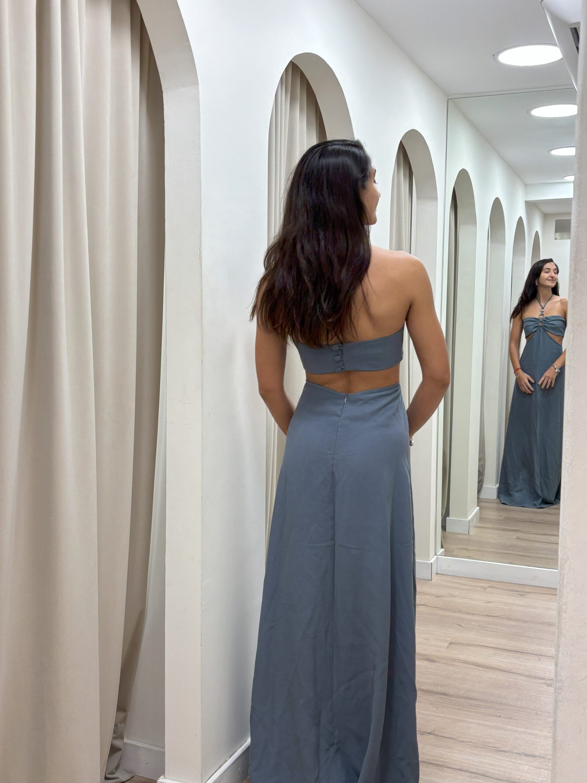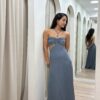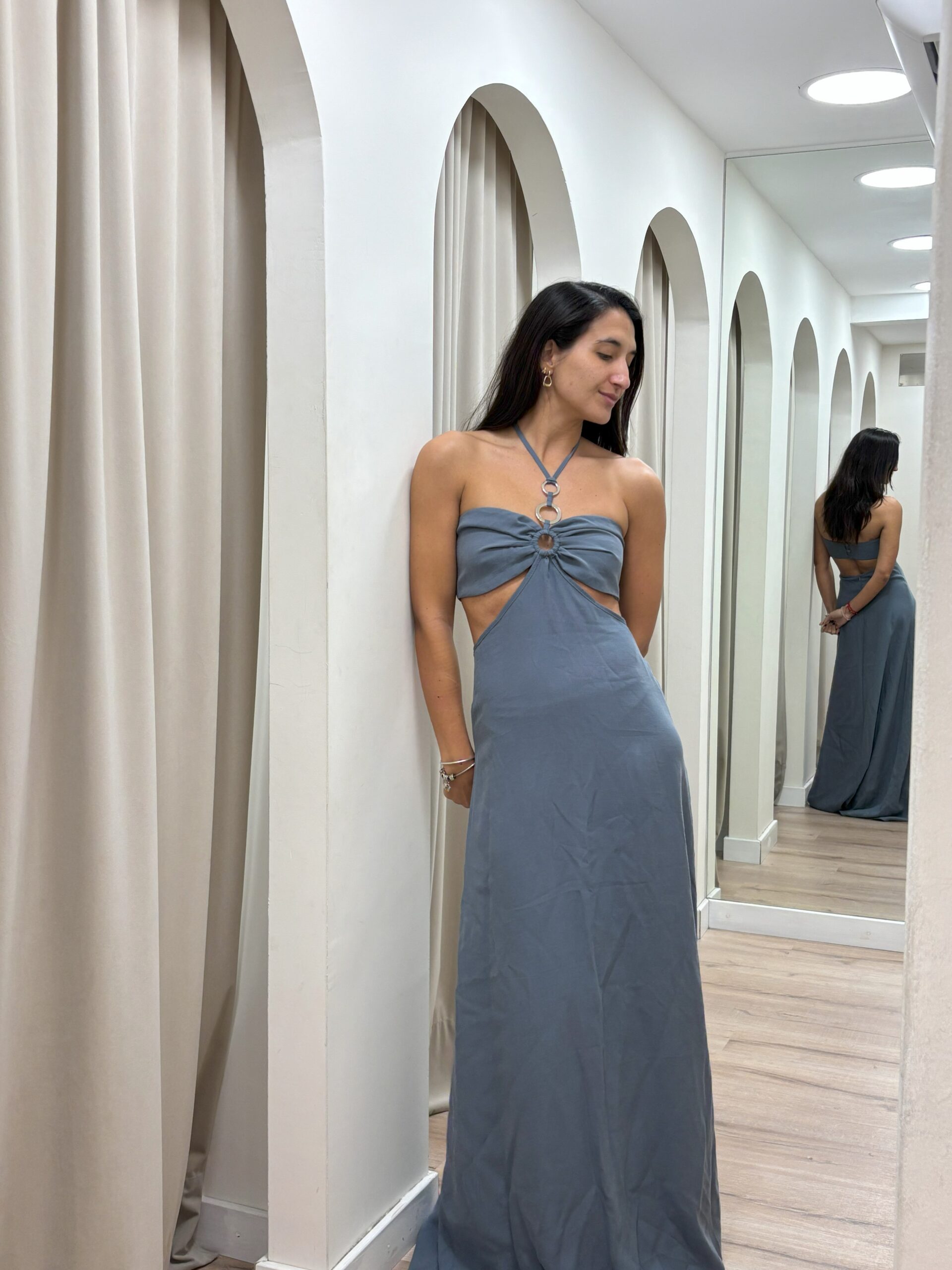 Vestido largo confeccionado en creppe de seda. Recorte en abdomen con el detalle de argollas en el pecho tiras para atar en el cuello. Tiene espalda descubierta con botones forrados y cierre invisible en costura central de espalda.