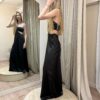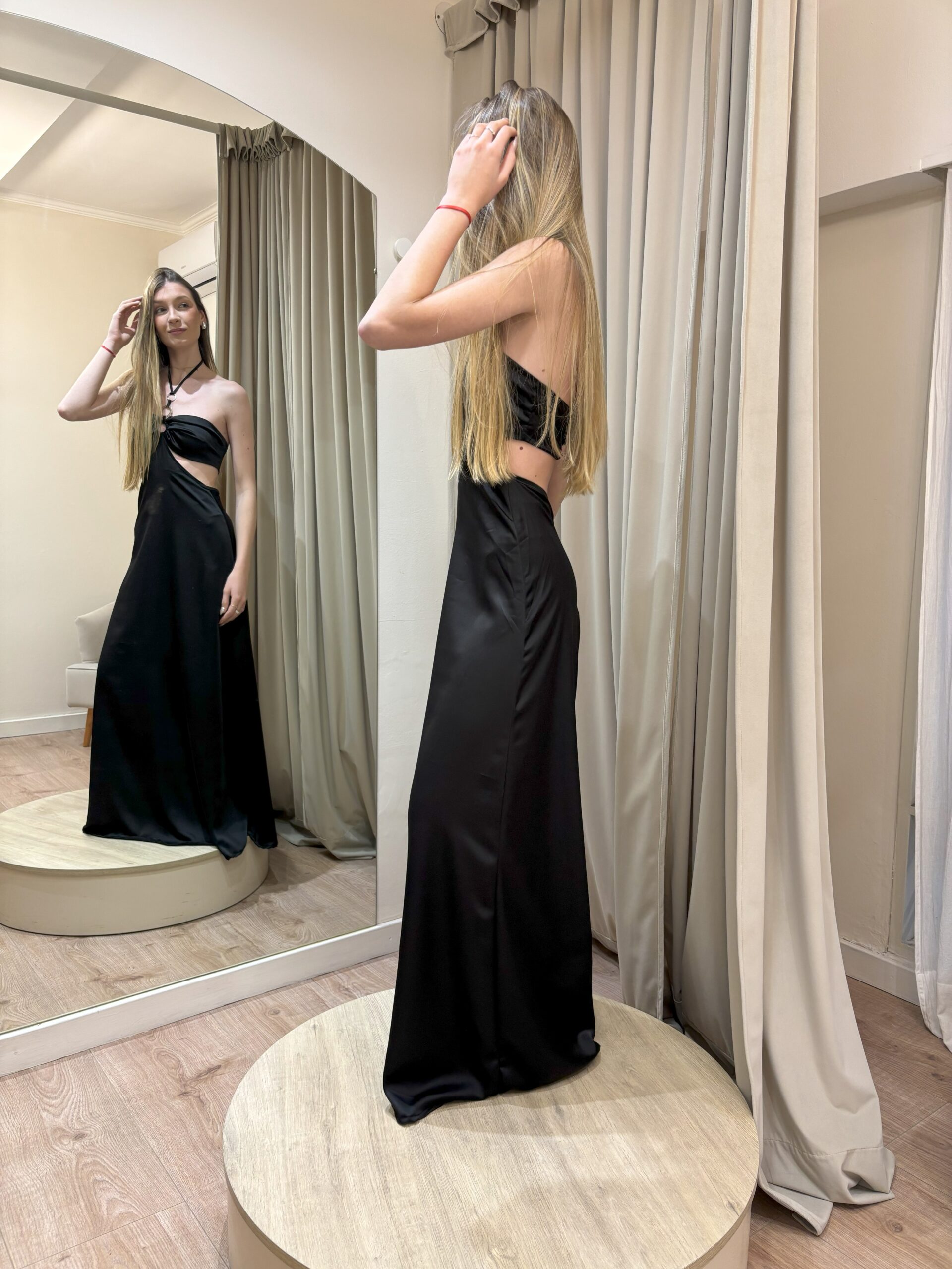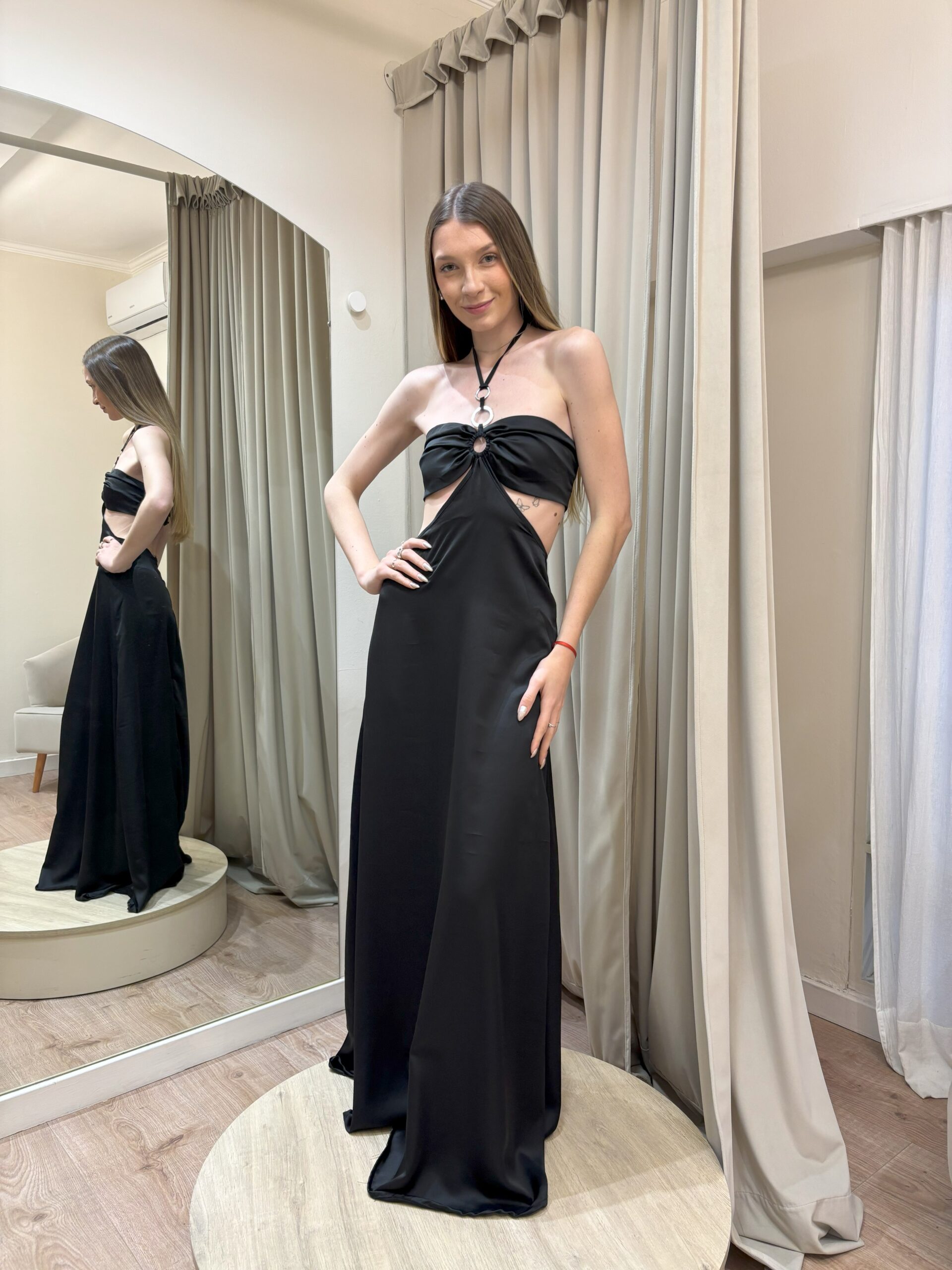 Vestido largo confeccionado en creppe de seda. Recorte en abdomen con el detalle de argollas en el pecho tiras para atar en el cuello. Tiene espalda descubierta con botones forrados y cierre invisible en costura central de espalda.