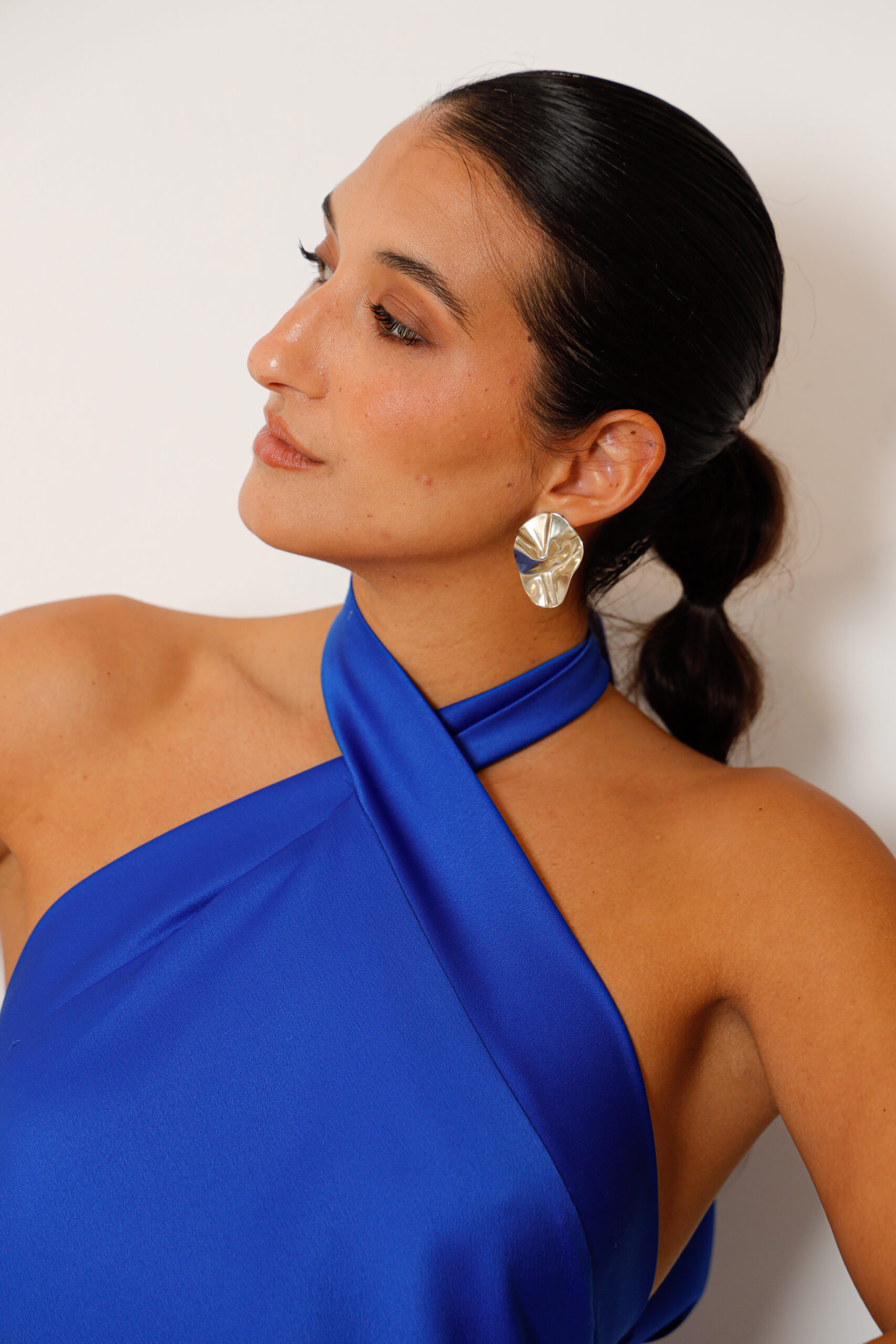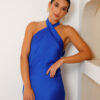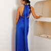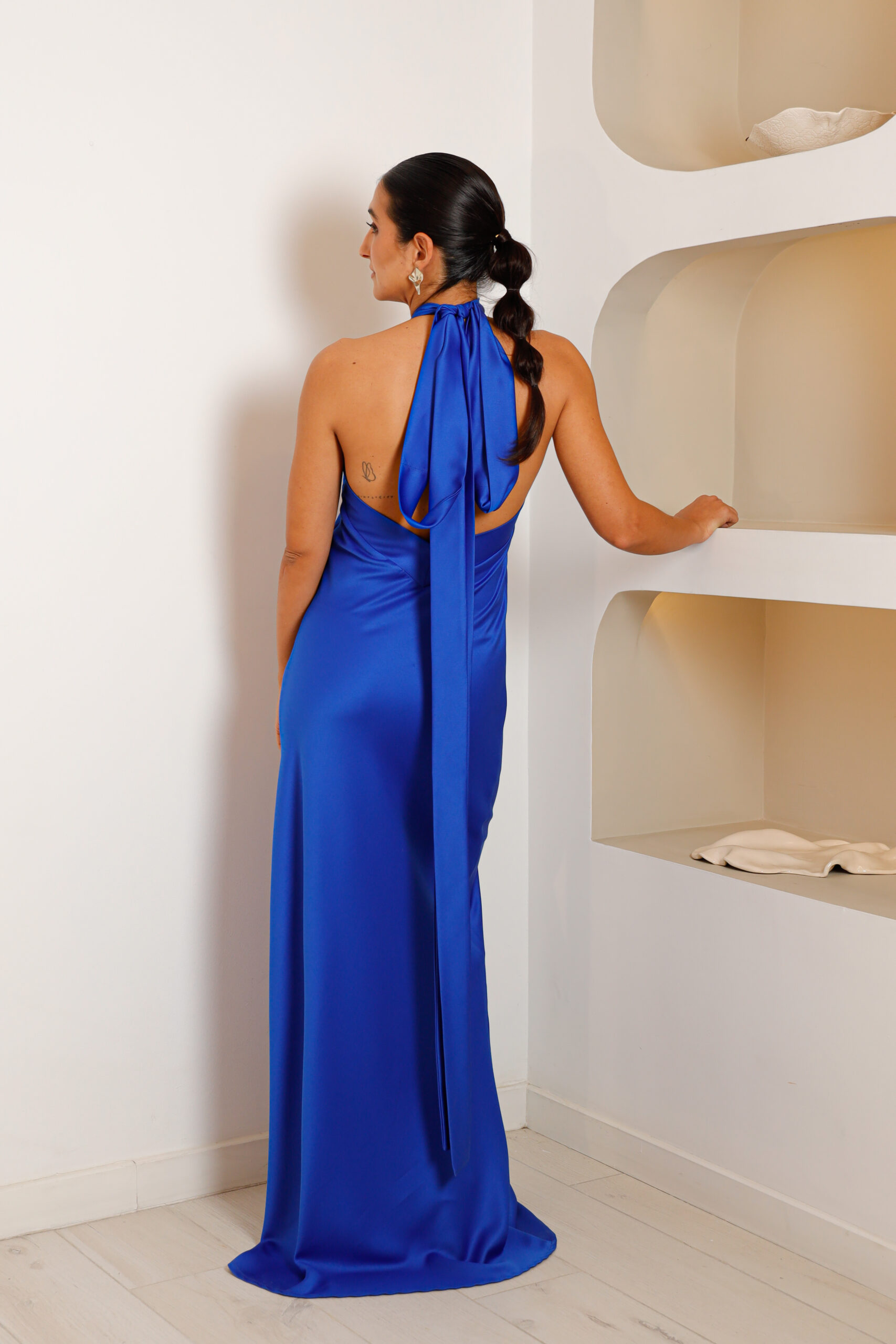 Vestido largo con escote halter y lazos en la espalda, cortado al bies y espalda descubierta.