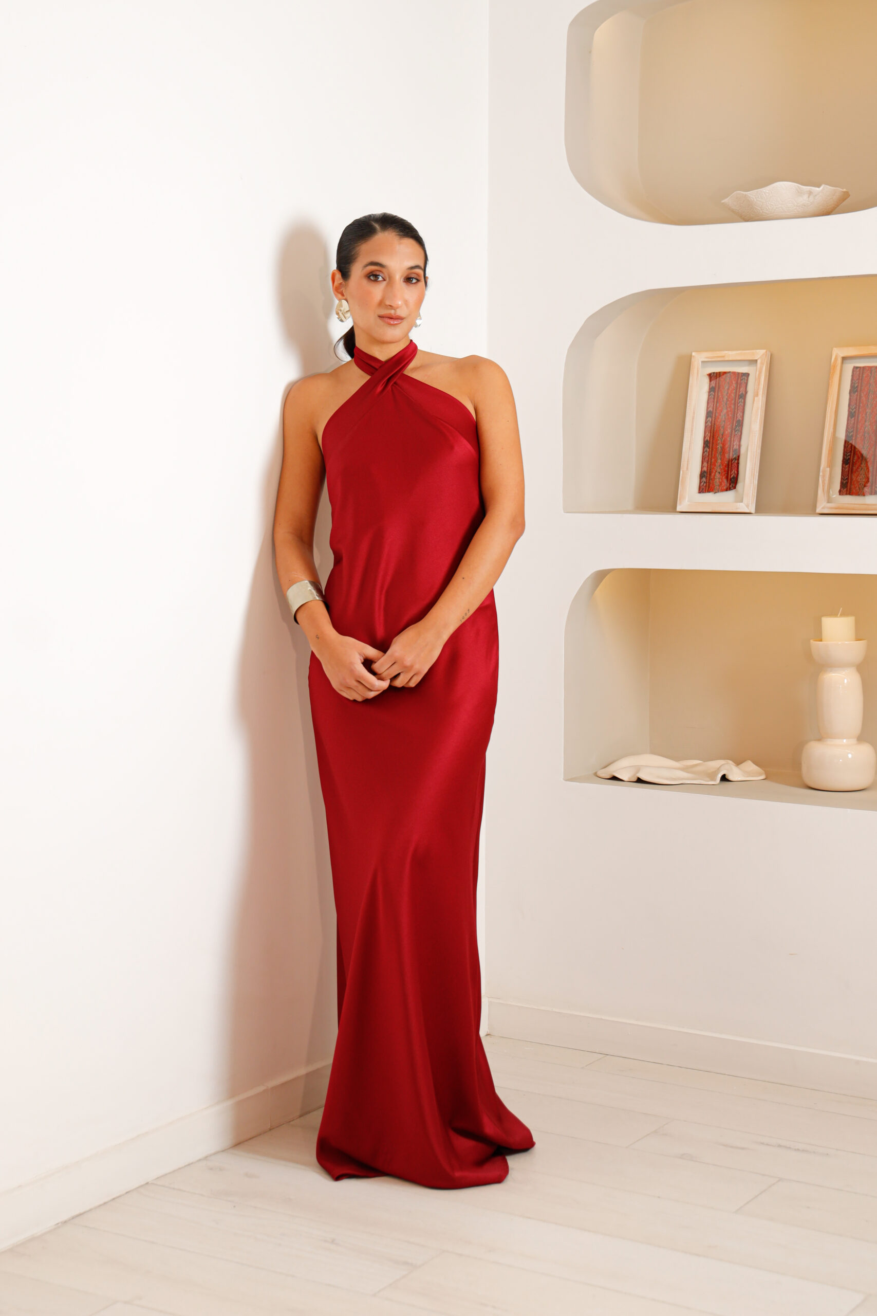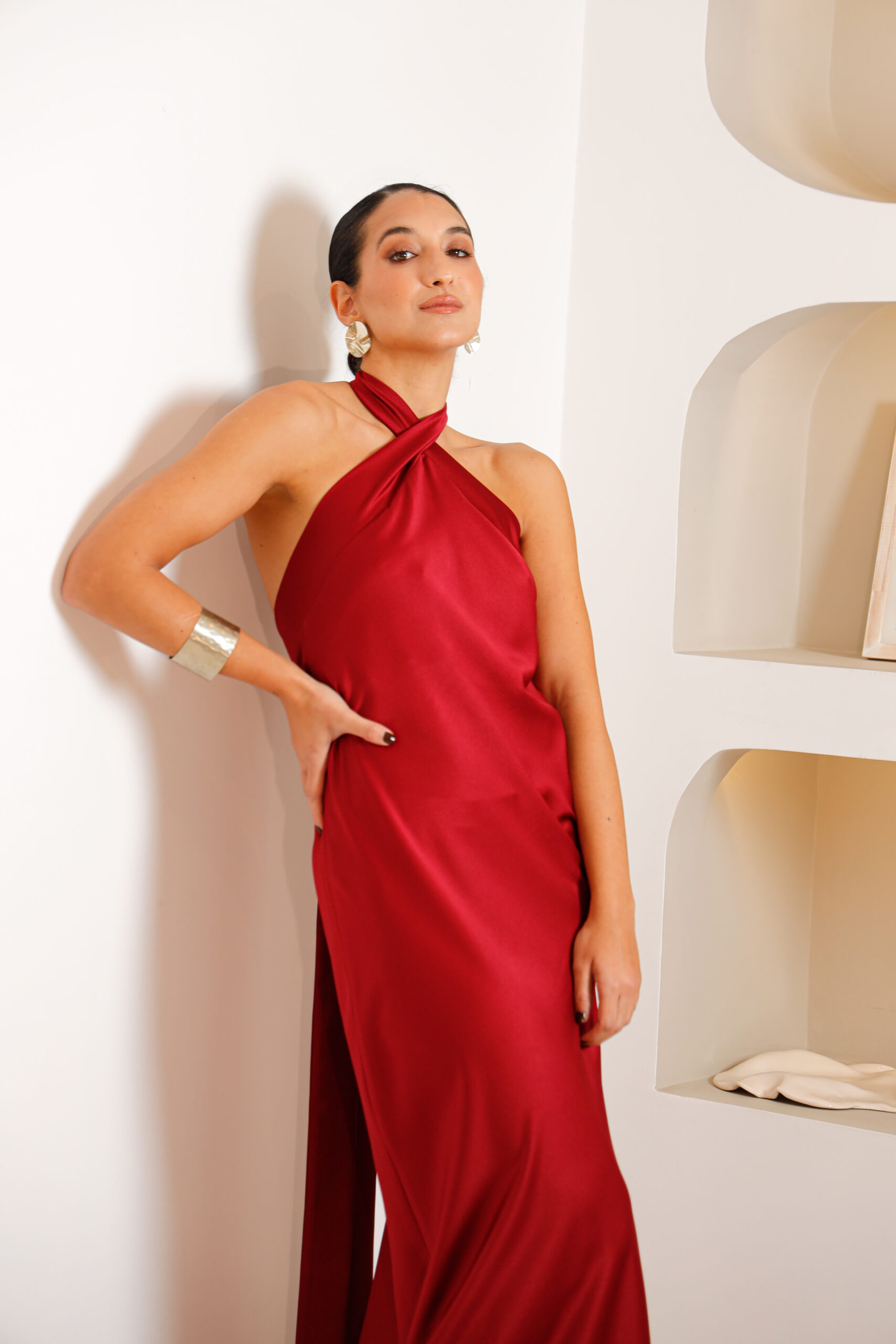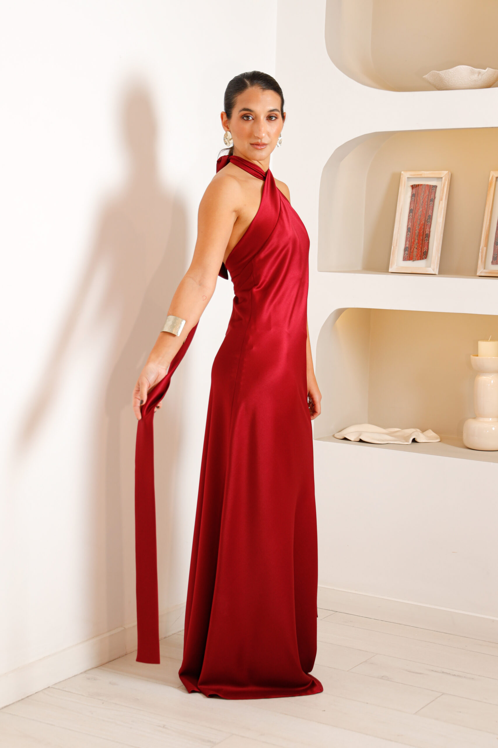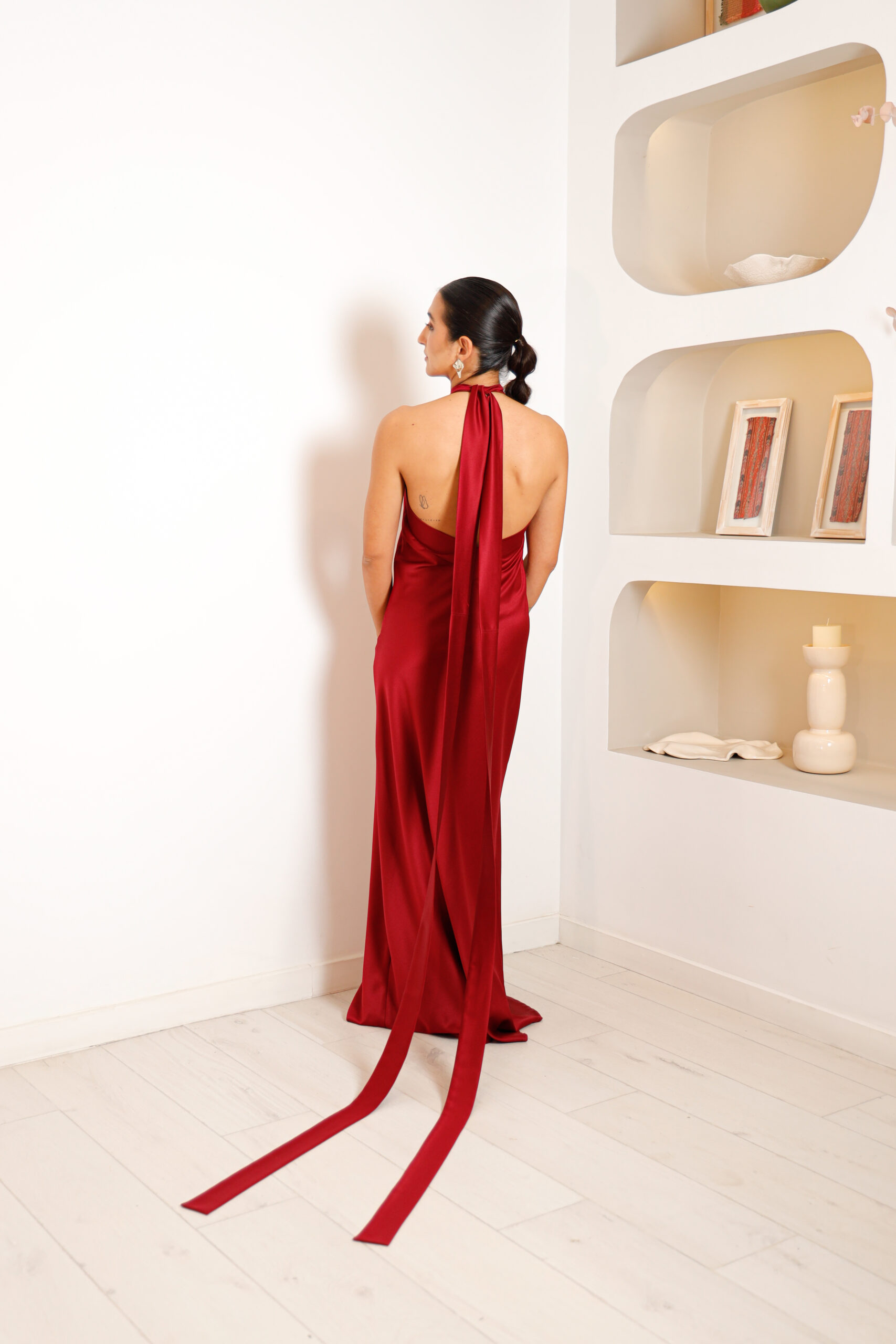 Vestido largo con escote halter y lazos en la espalda, cortado al bies y espalda descubierta.