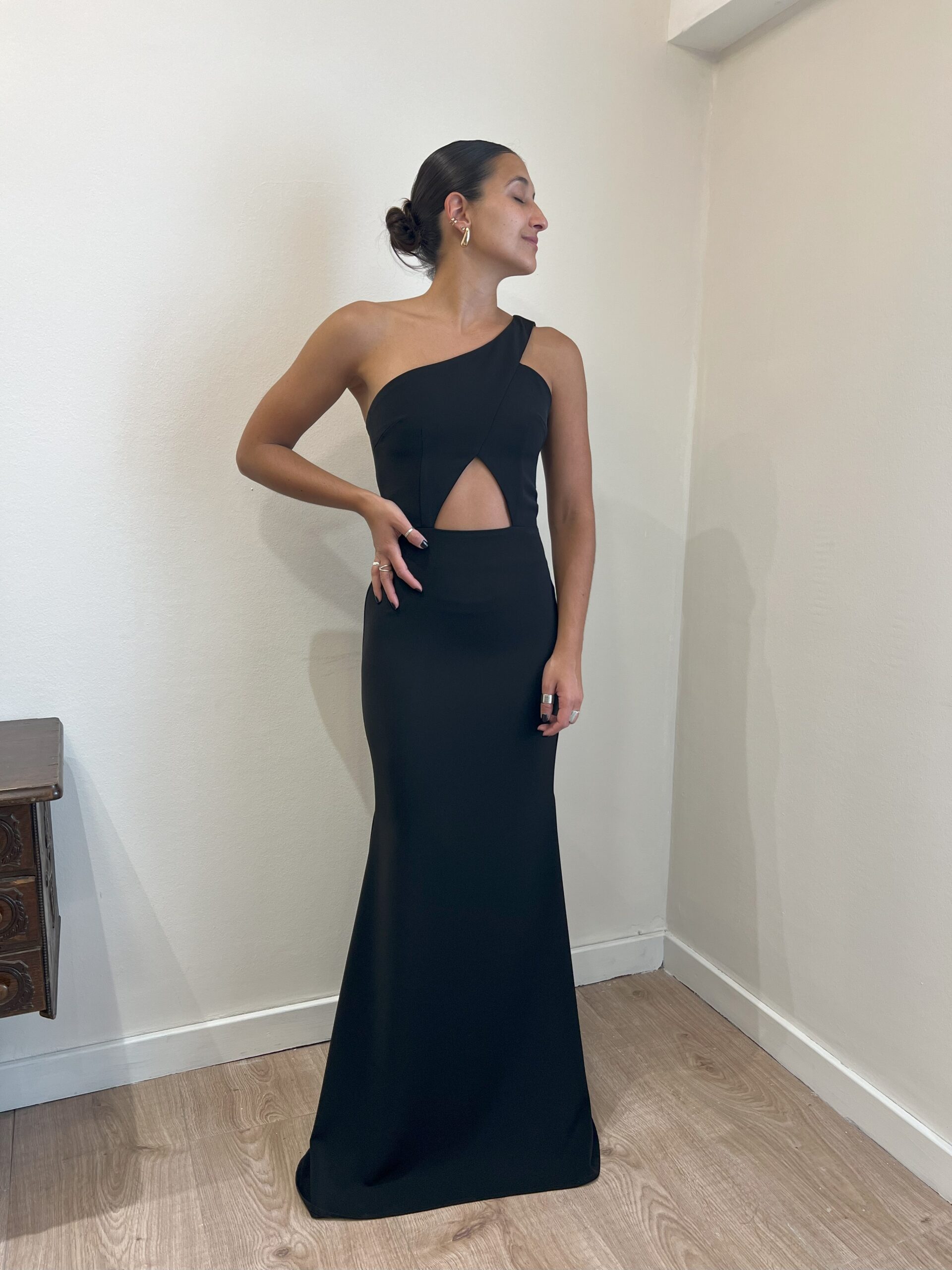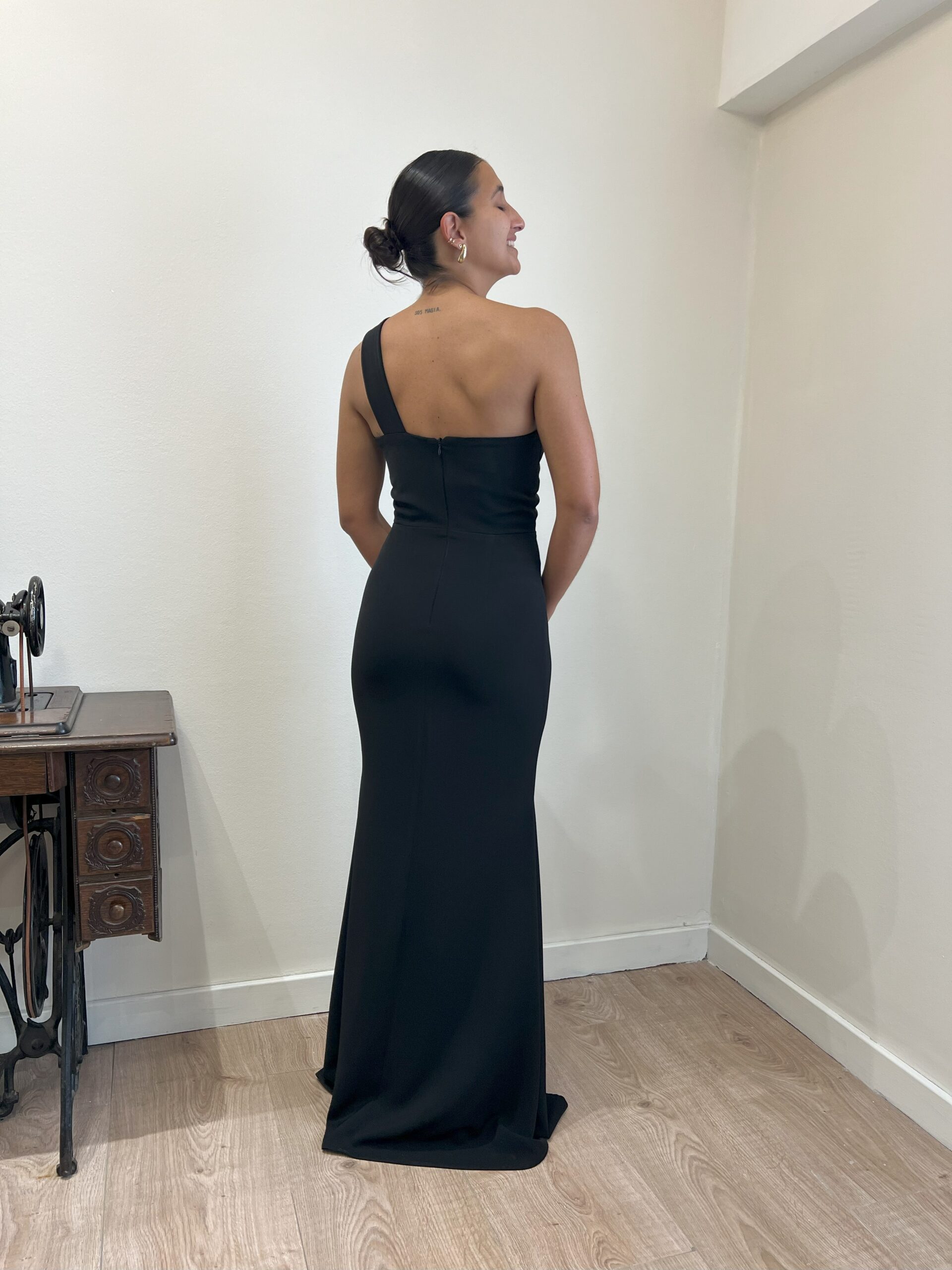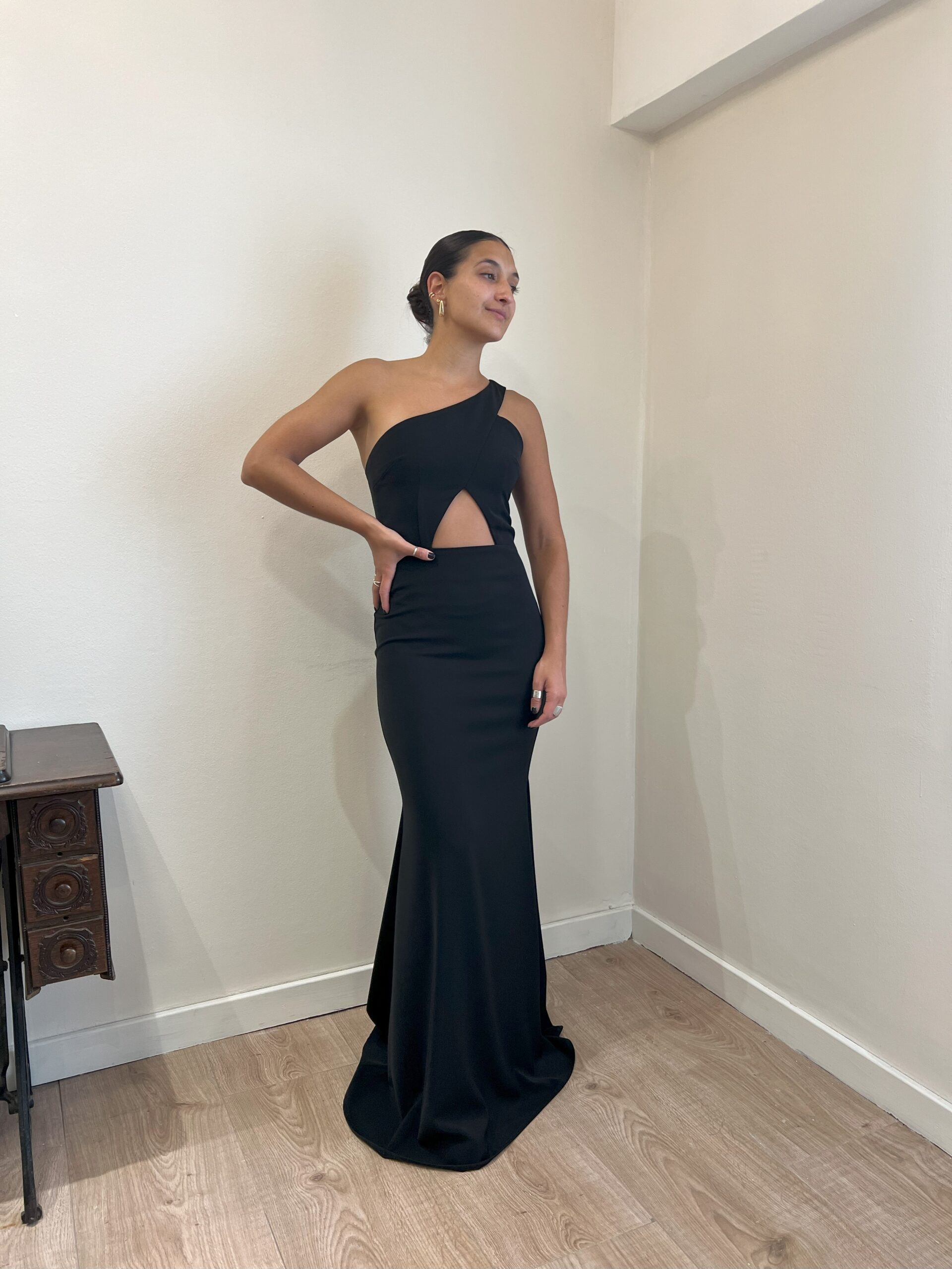 Vestido largo escote a un hombro con recorte a la  altura de la cintura y pollera semi sirena.