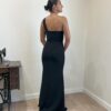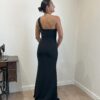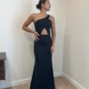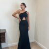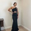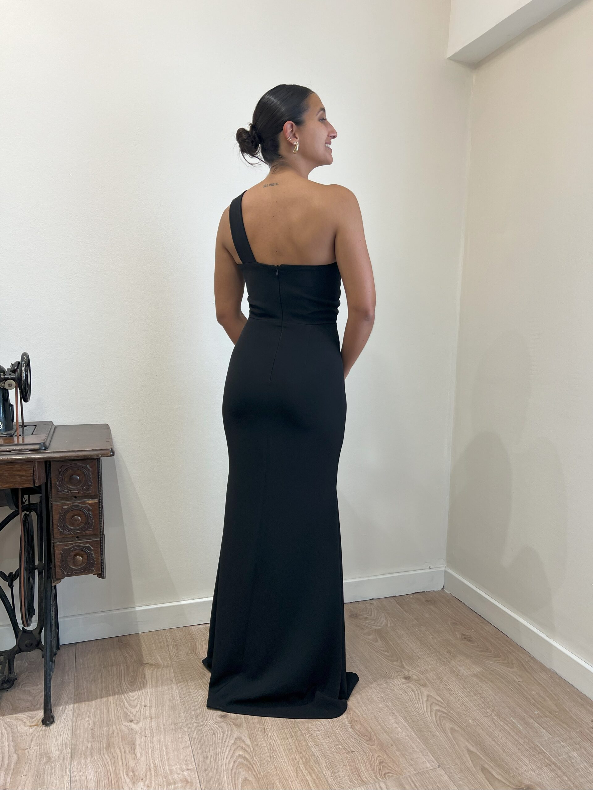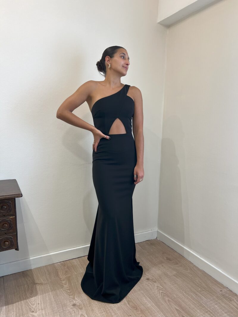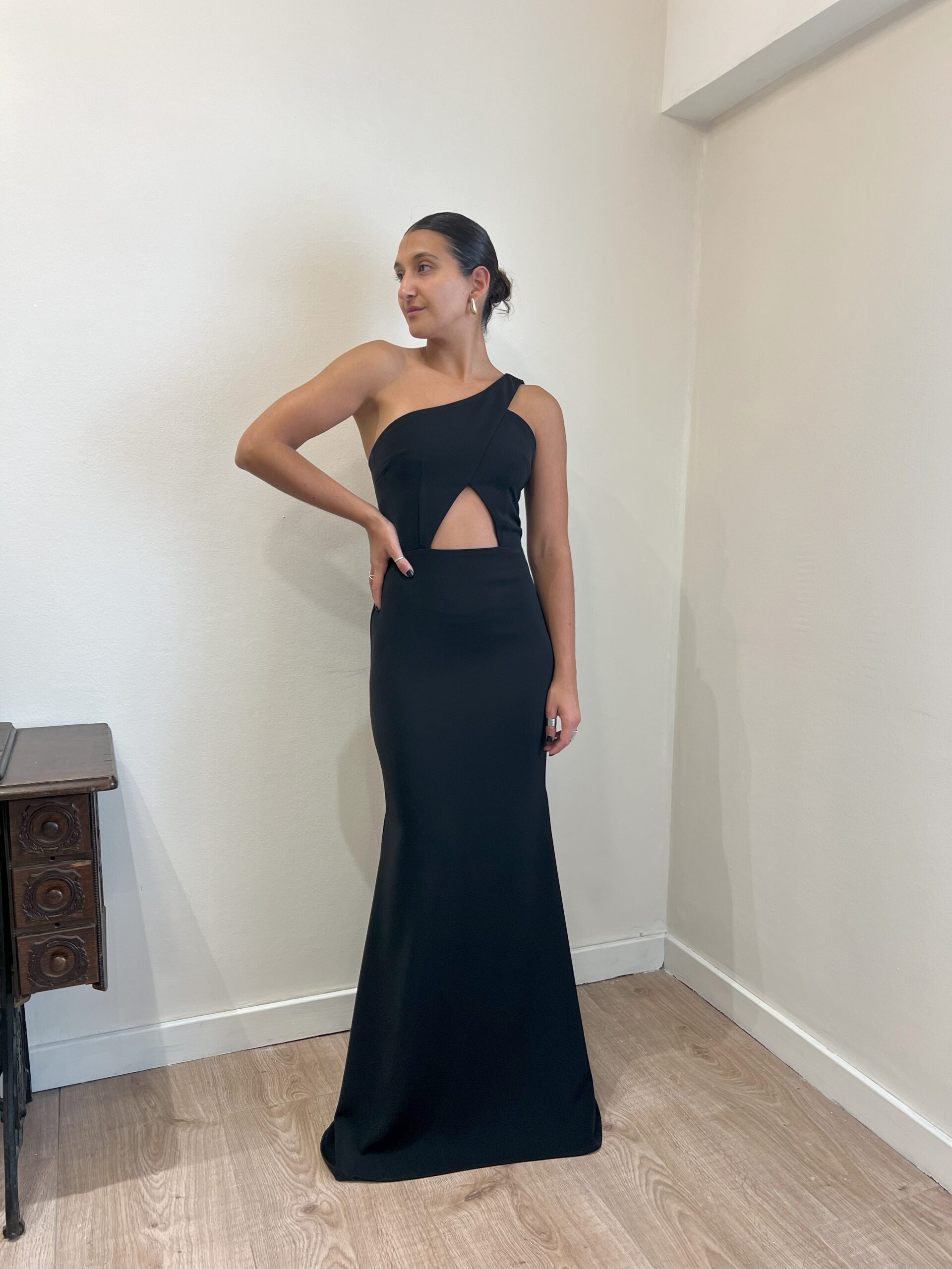Vestido largo escote a un hombro con recorte a la  altura de la cintura y pollera semi sirena.