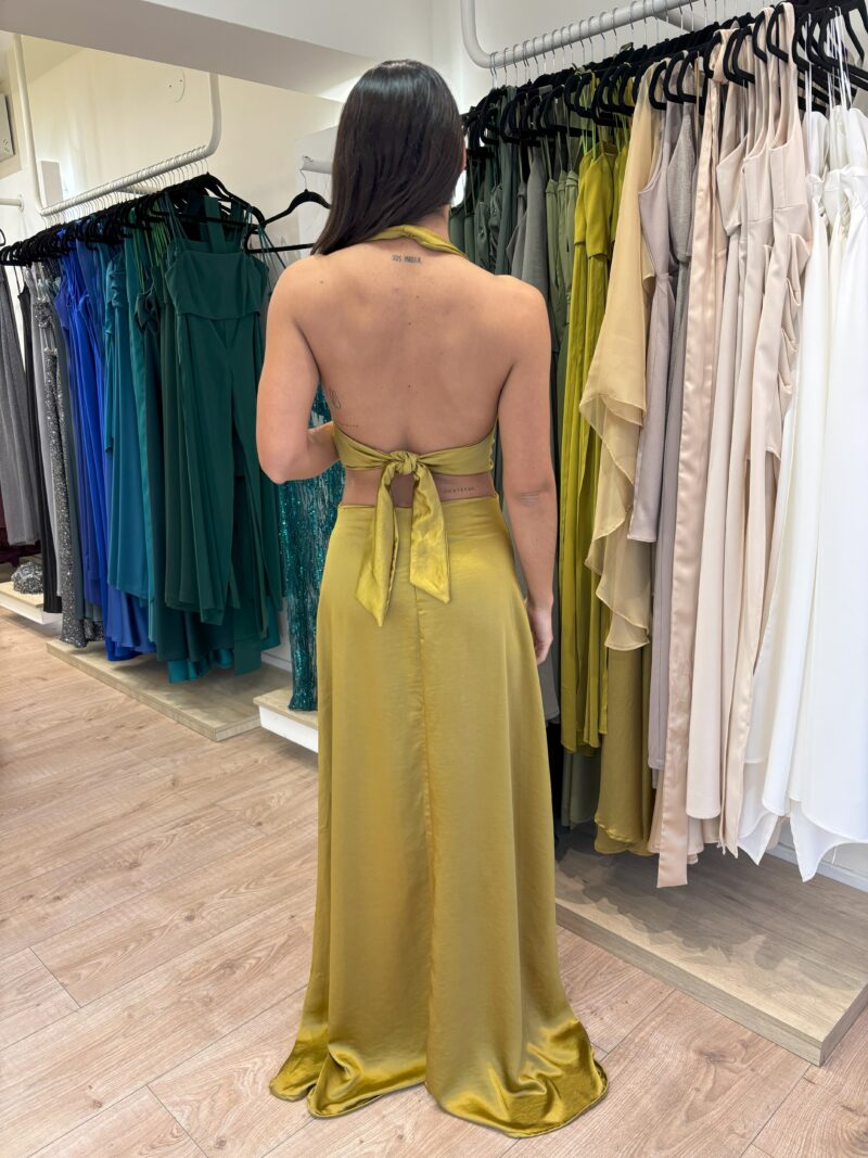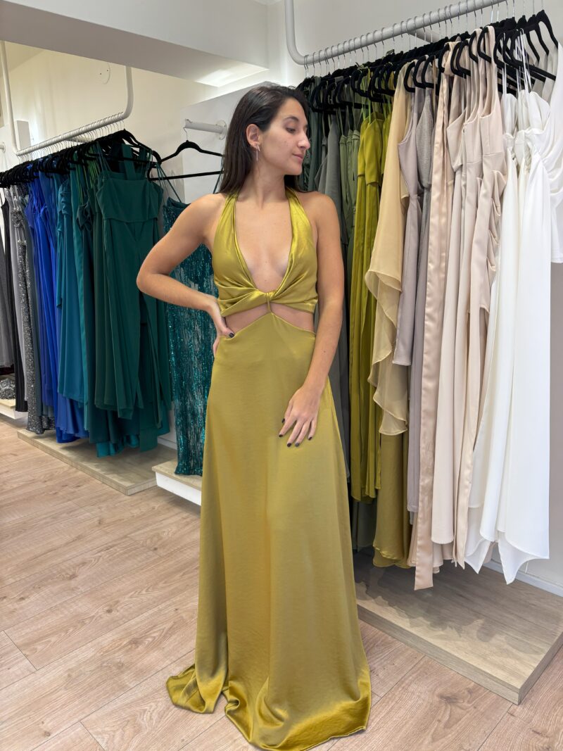 Vestido con escote en V torzado generando un drapeado. Tiene recortes en la cintura. La espalda está descubierta. La pollera es corte A.