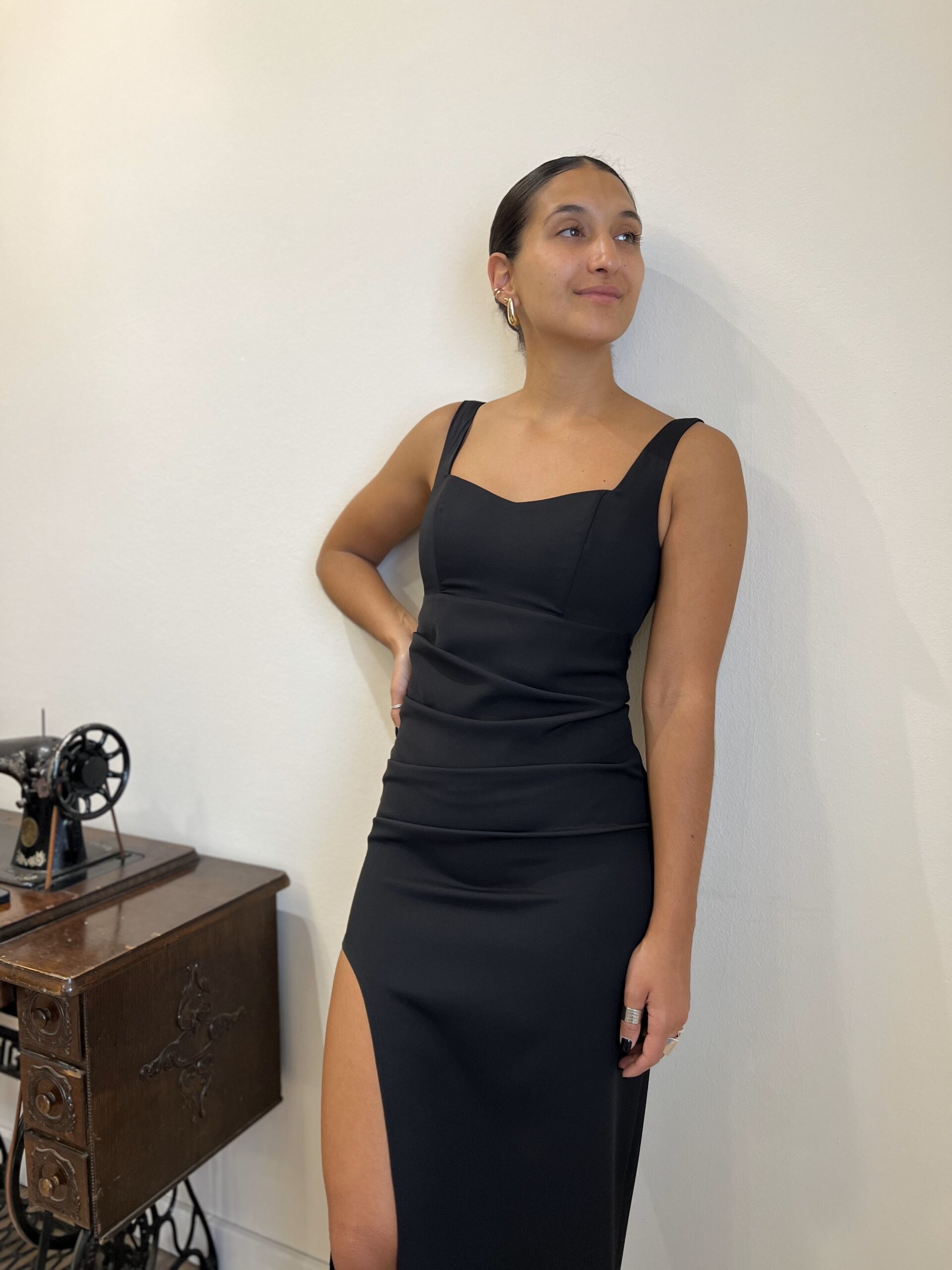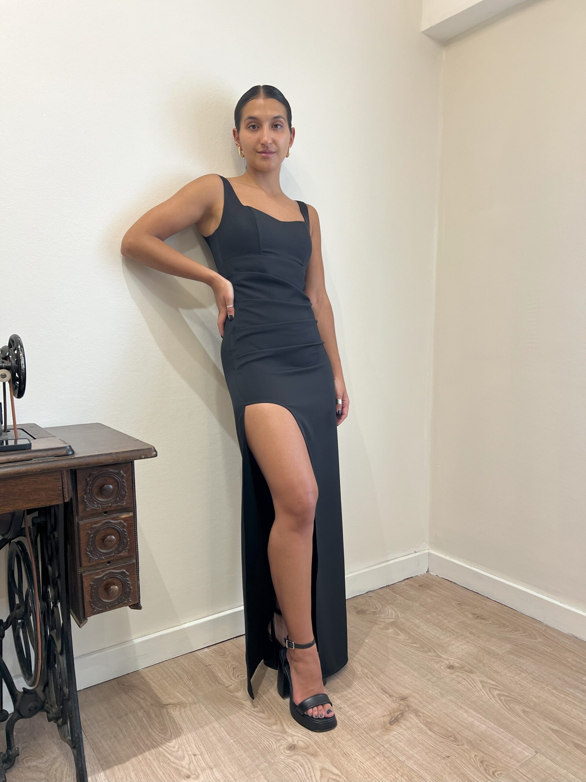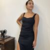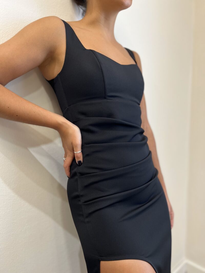 POR QUÉ DEBERIAS ELEGIRLO: Es un vestido básico que te va a salvar para muchas ocasiones. Es un vestido ajustado y el drapeado que tiene en un costado ayuda a marcar la cintura y el escote es super lindo y asentador.