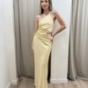 Vestido de diseño a un hombro, recorte en la cintura y drapeado en el costado del top y la falda que estiliza y realza la silueta. La espalda es regulable.