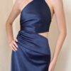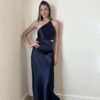 Vestido de diseño a un hombro, recorte en la cintura y drapeado en el costado del top y la falda que estiliza y realza la silueta. La espalda es regulable.
