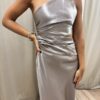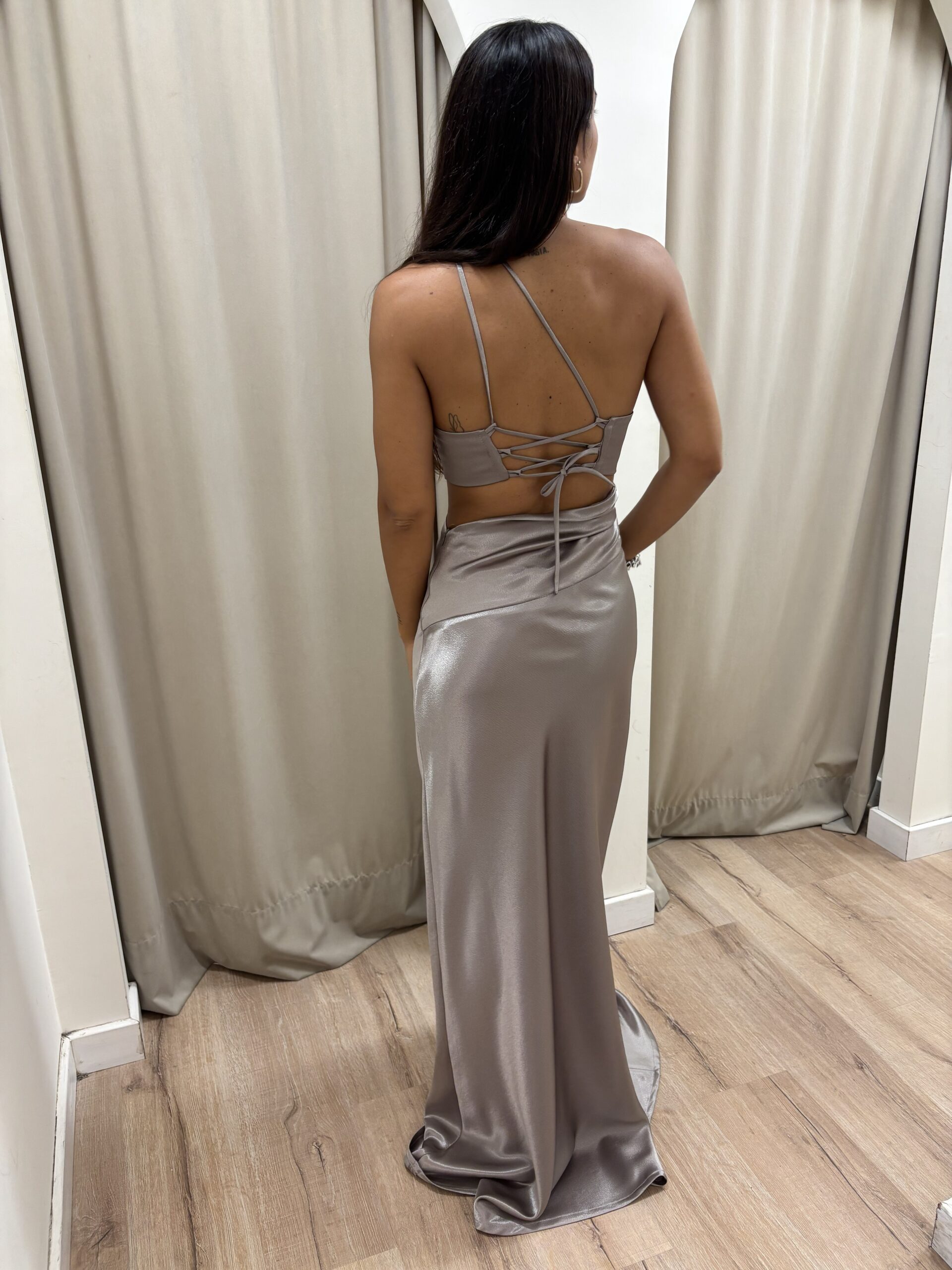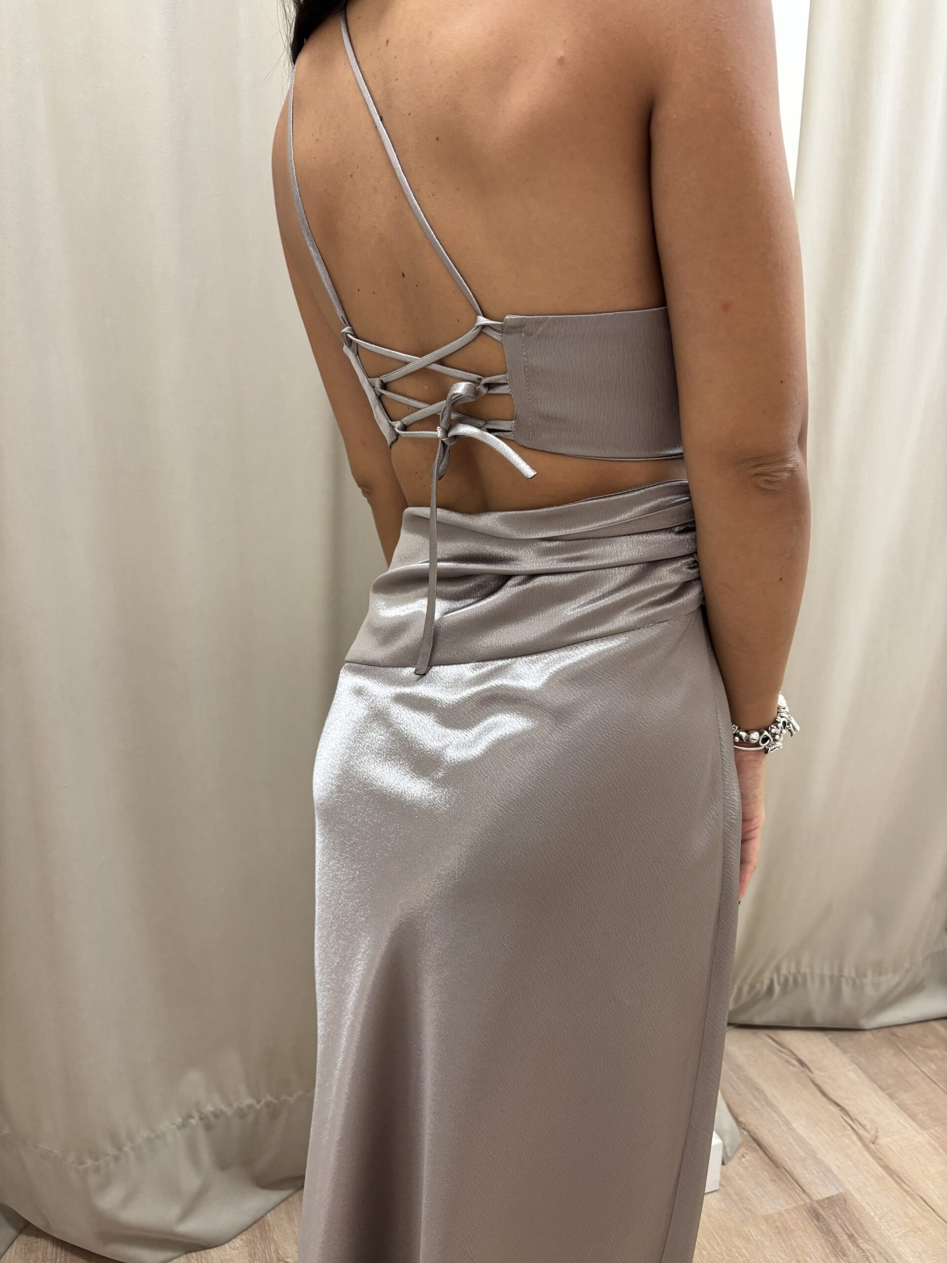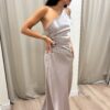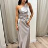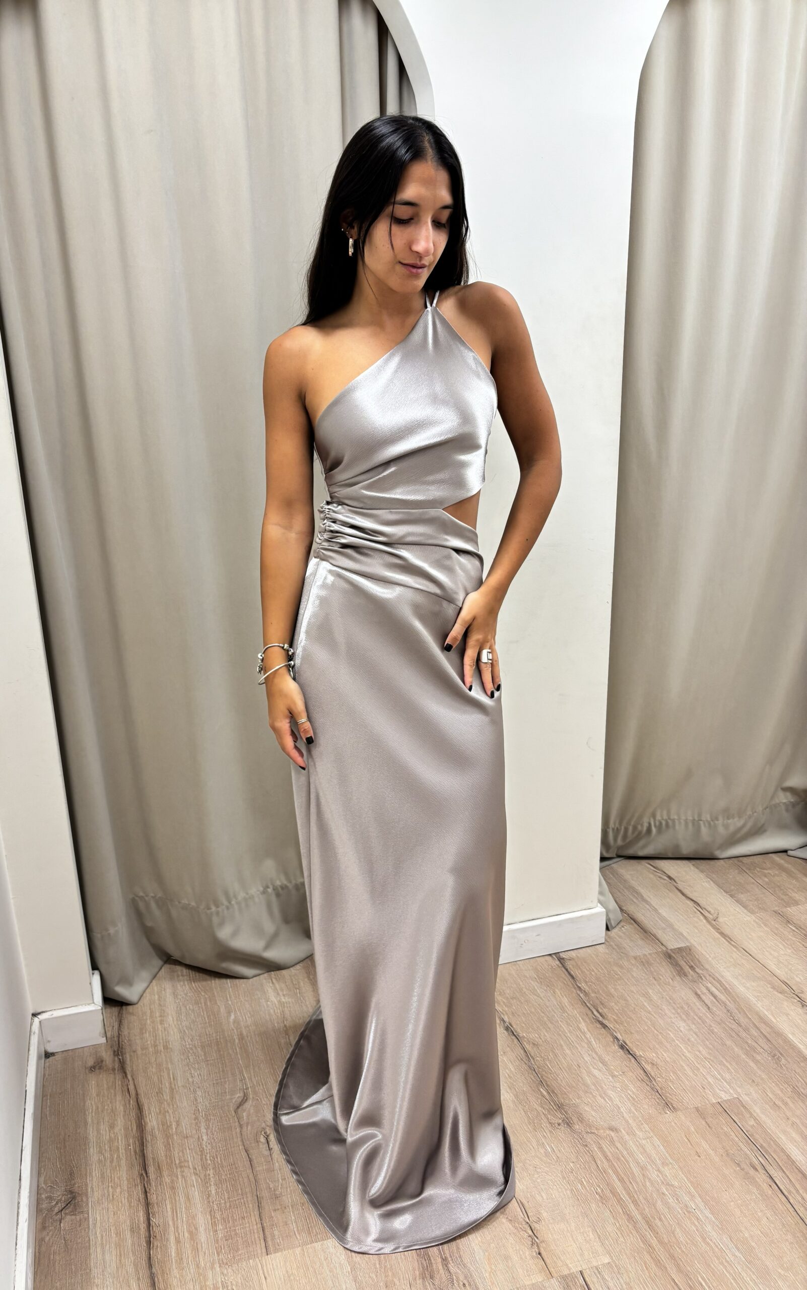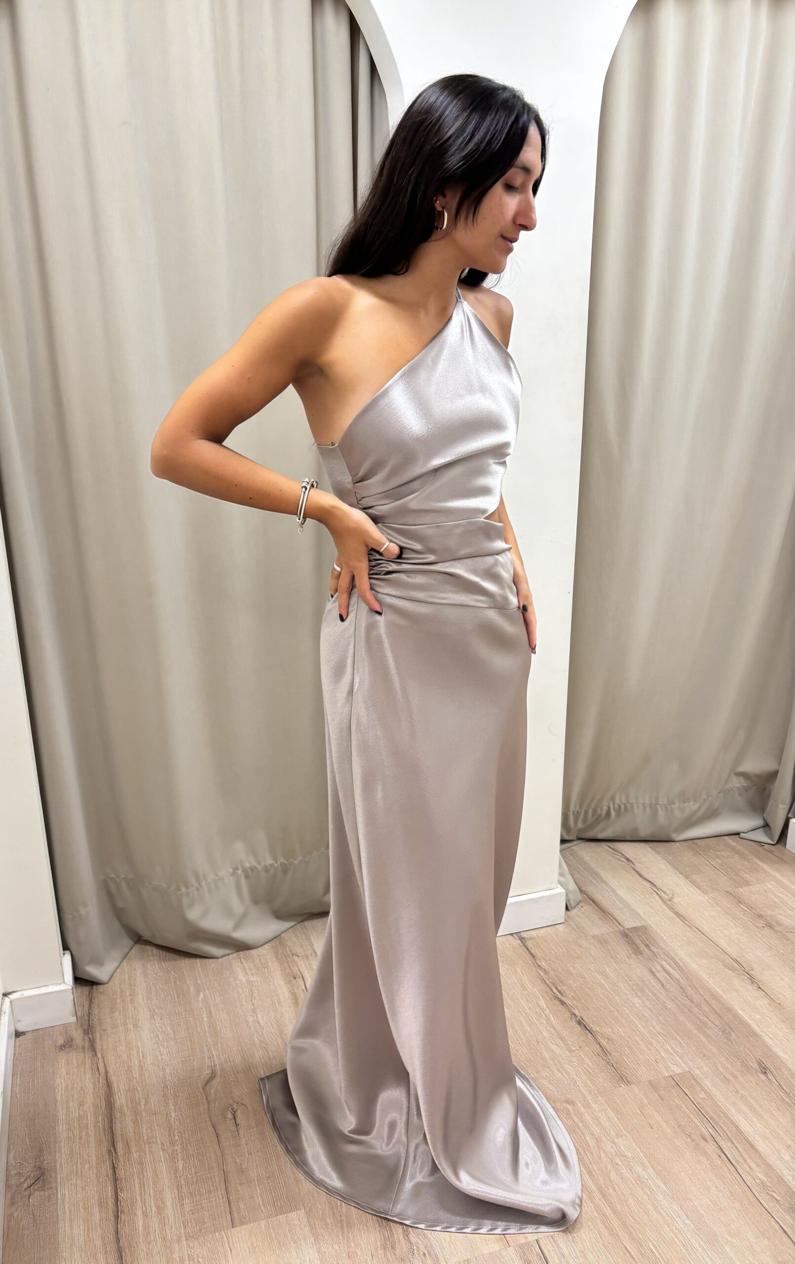 Vestido de diseño a un hombro, recorte en la cintura y drapeado en el costado del top y la falda que estiliza y realza la silueta. La espalda es regulable.